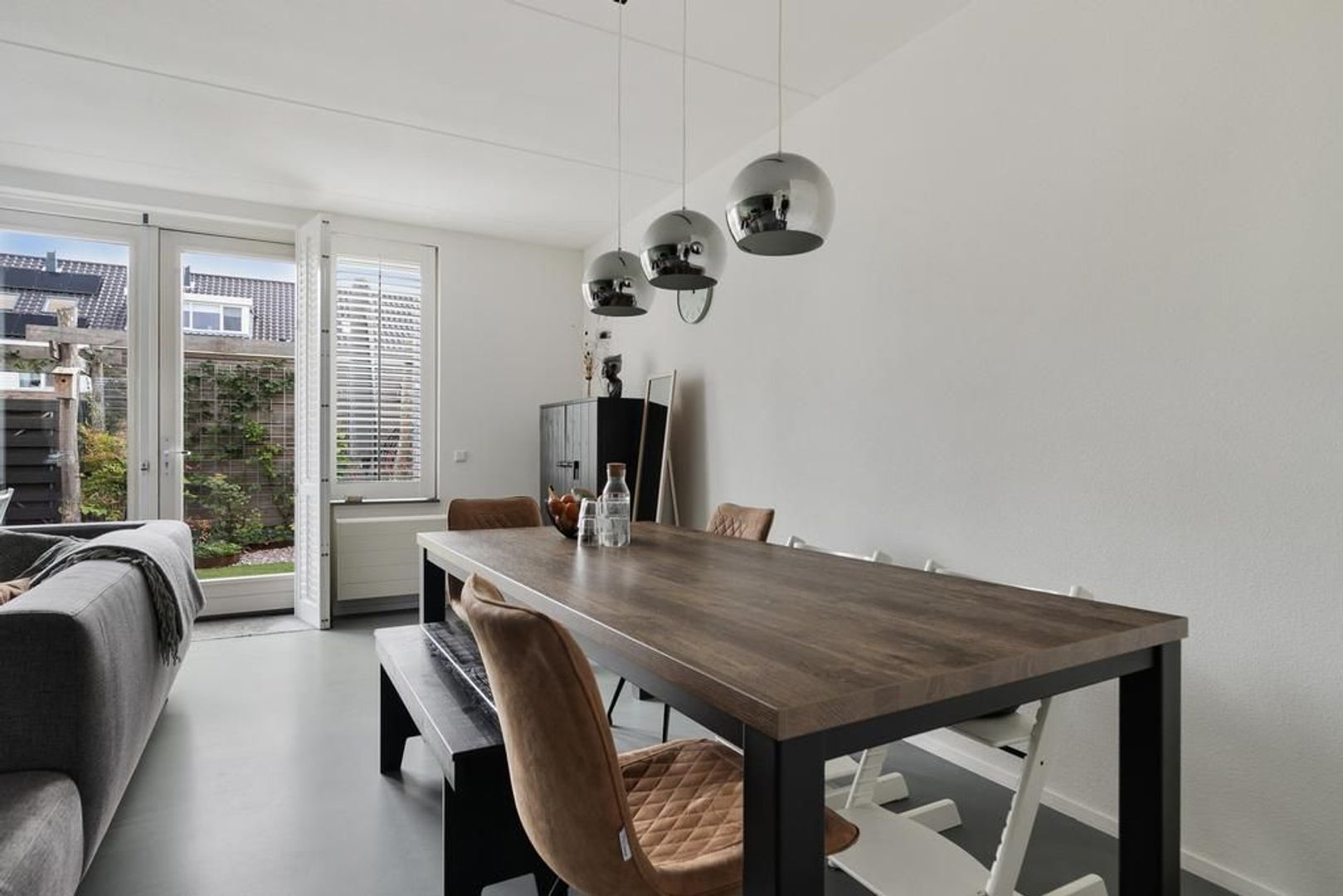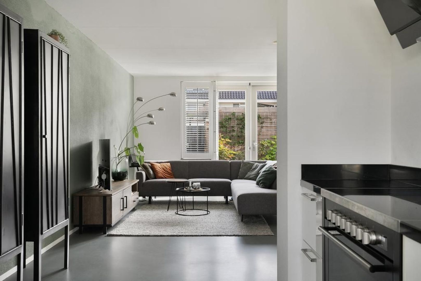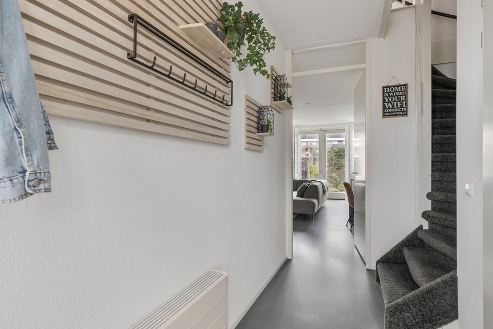 De uitgebouwde woonkamer met openslaande deuren naar de achtertuin en een diepe bergkast onder de trap.