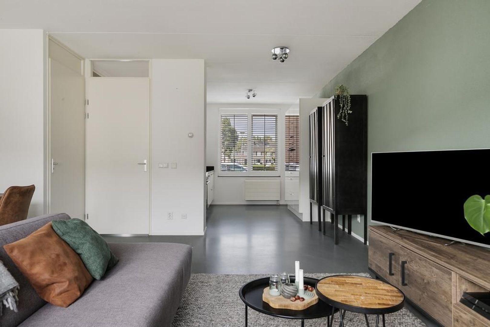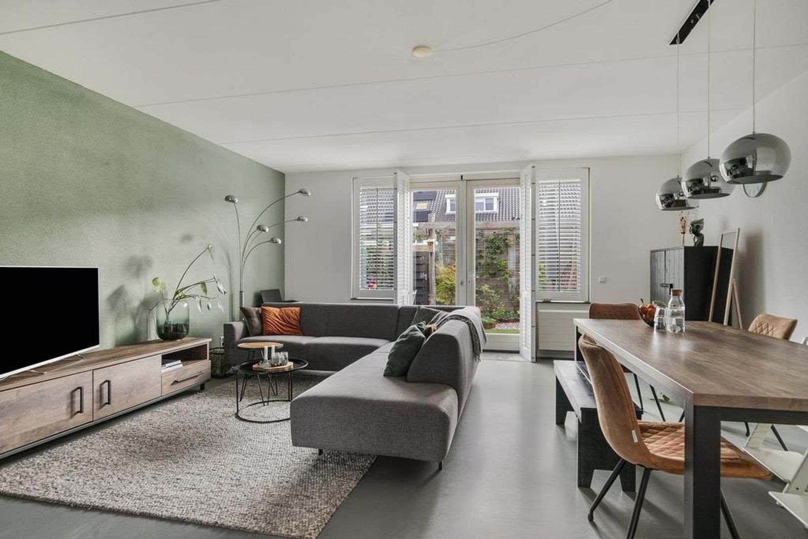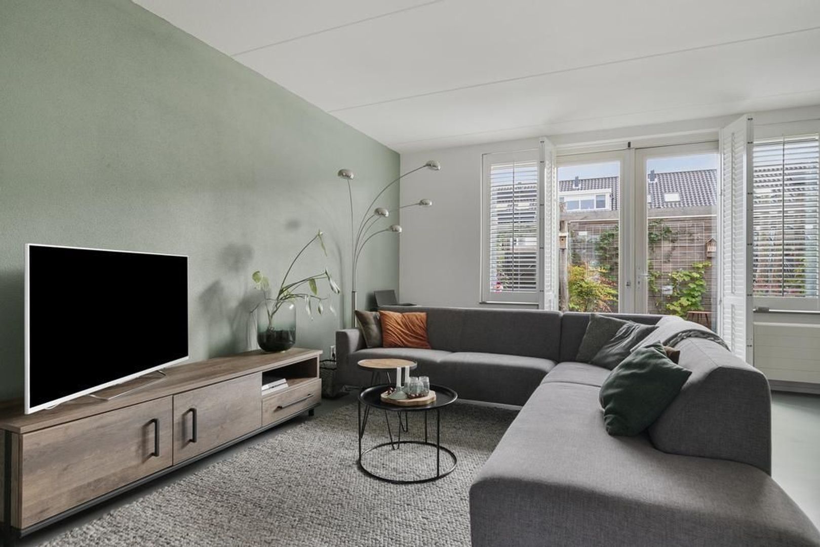 De uitgebouwde woonkamer met openslaande deuren naar de achtertuin en een diepe bergkast onder de trap.