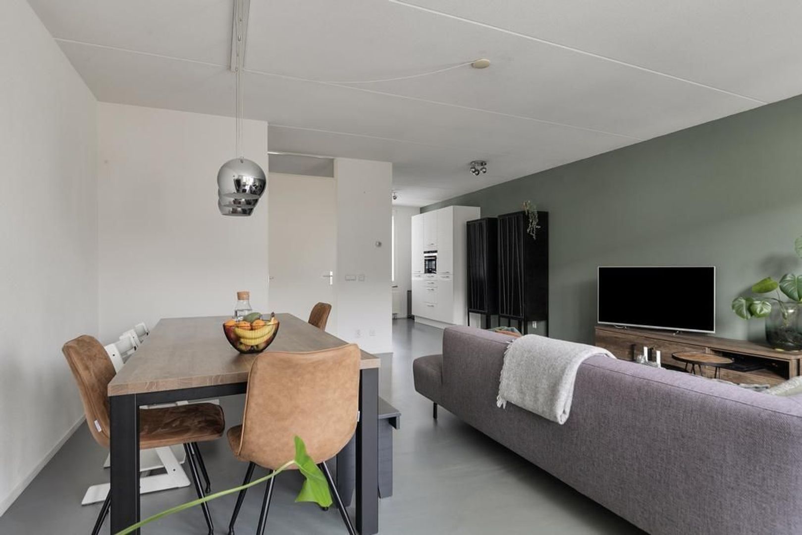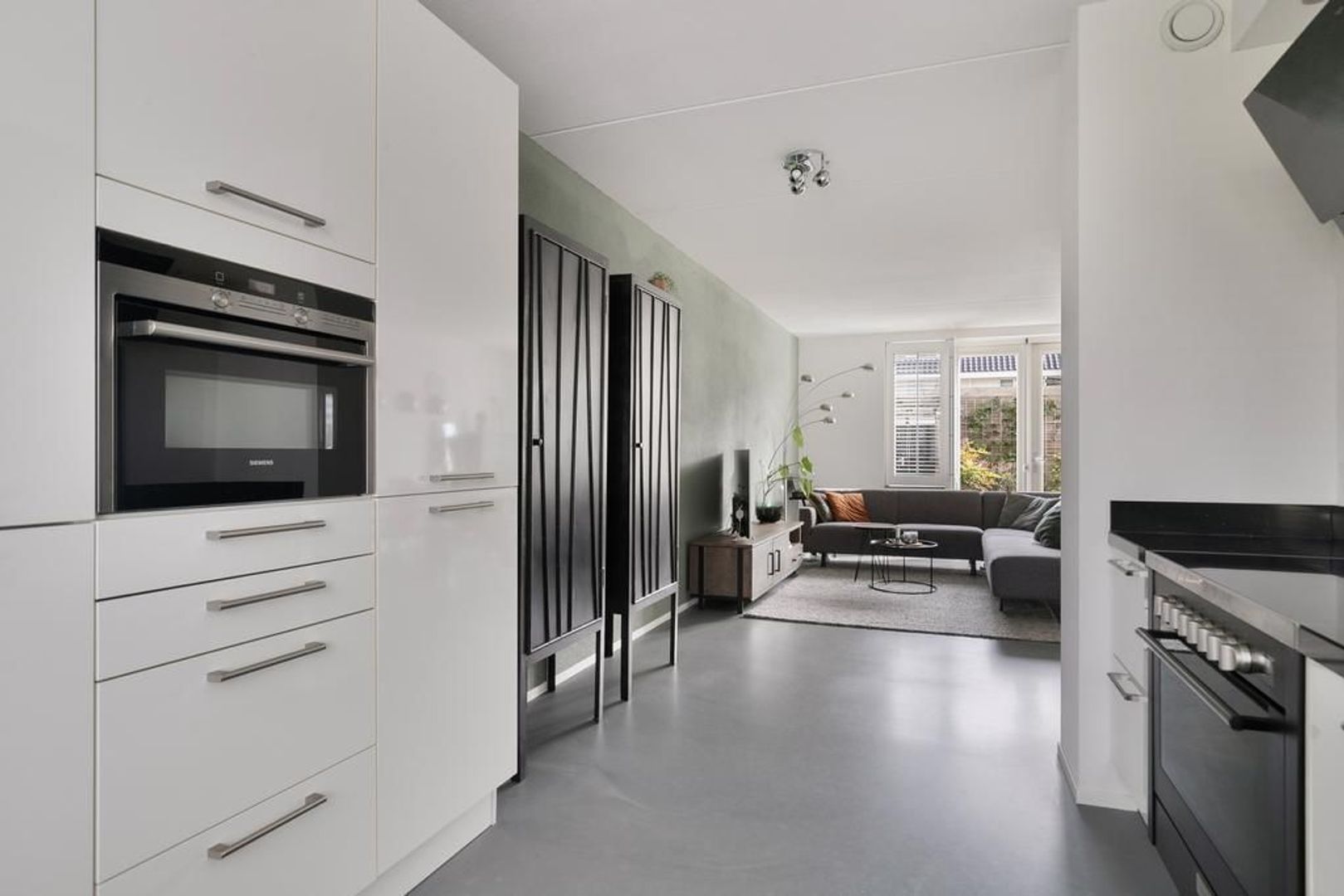Aan de voorzijde bevindt zich de moderne keuken met een fornuis met 6 inductie kookzones met afzuigkap, grote oven, Quooker, vaatwasser, koel-vriescombinatie, combi oven/magnetron en composiet werkblad.
