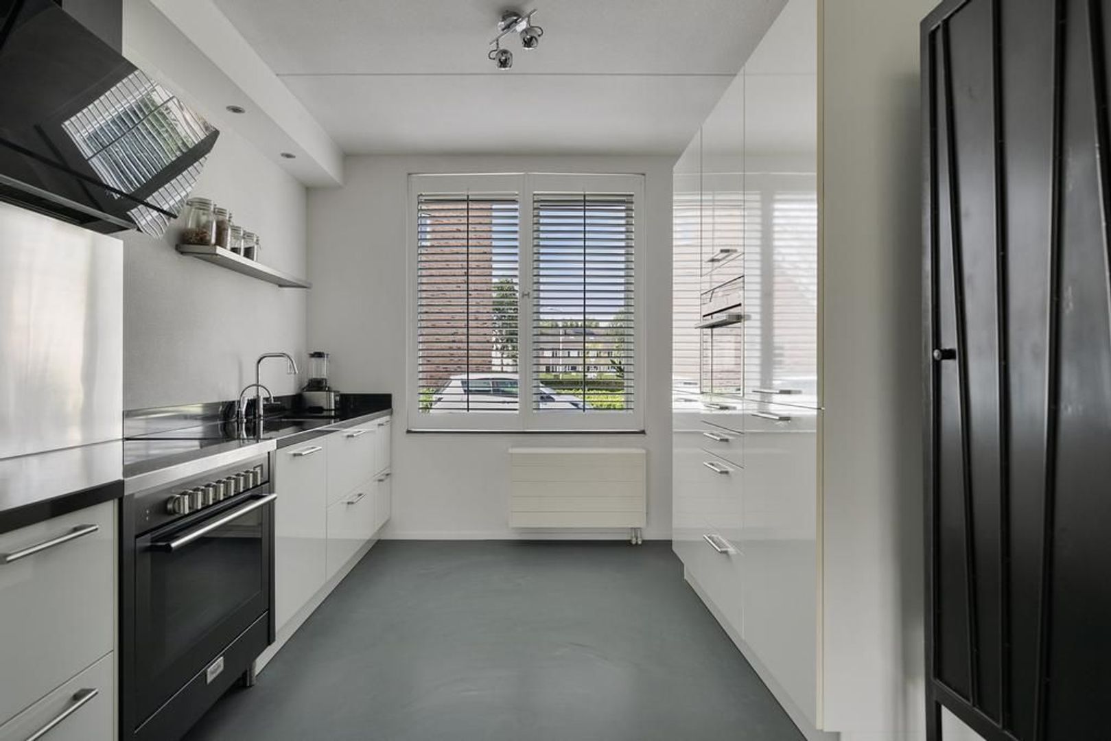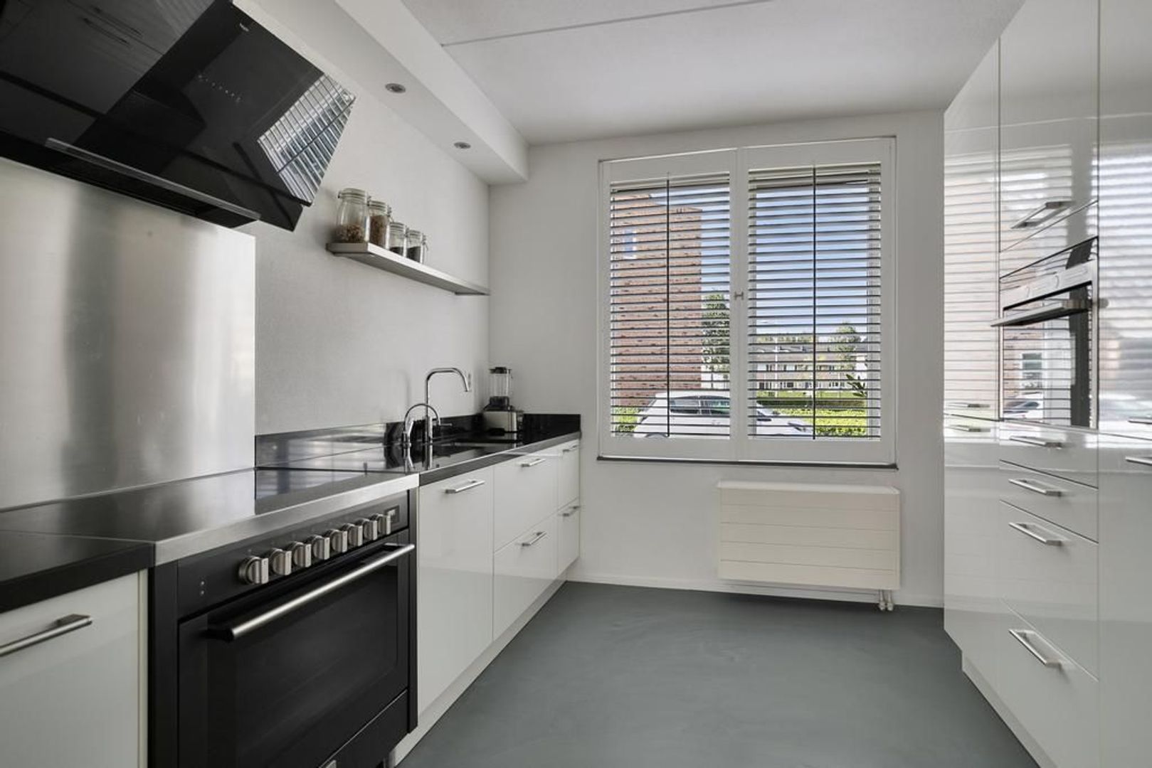 Op de gehele begane grond ligt een fraaie gietvloer. Alle ramen zijn voorzien van Jasno shutters en bevatten horren.