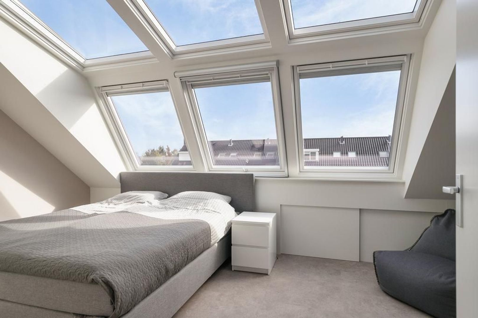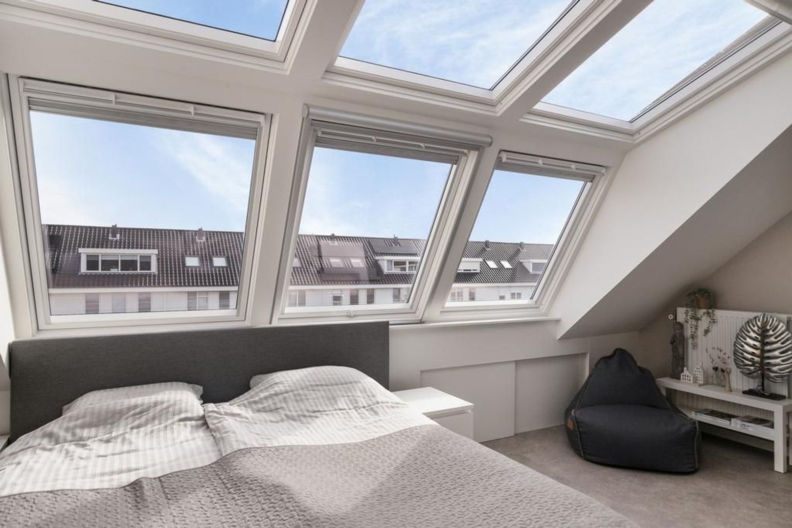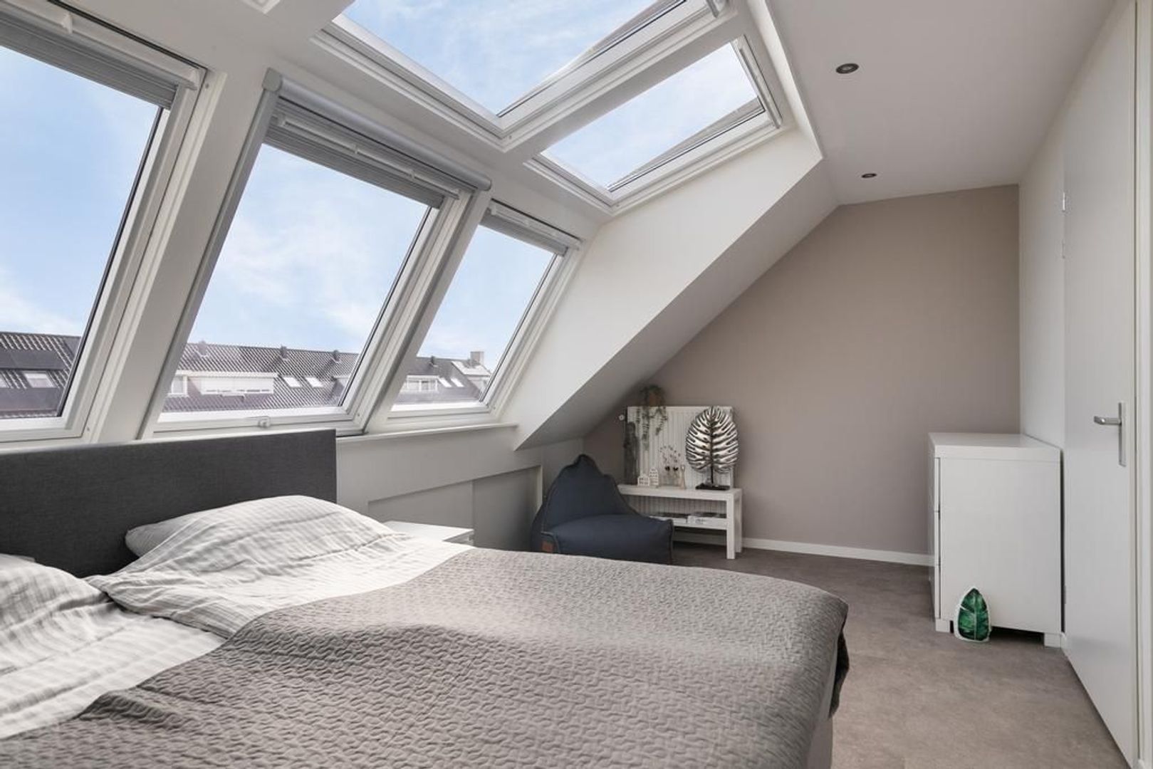 Slaapkamer 4, gelegen aan de achterzijde is voorzien van een unieke dakserre. Dit adembenemende alternatief voor een dakkapel geeft je meer ruimte, frisse lucht en daglicht. Met elektrische rolluiken, plissé raambekleding en een hor is het in elk jaargetij een genot om onder te slapen. Daarnaast zorgen de met schuifdeuren afgesloten knieschotten voor praktische opbergruimte.
