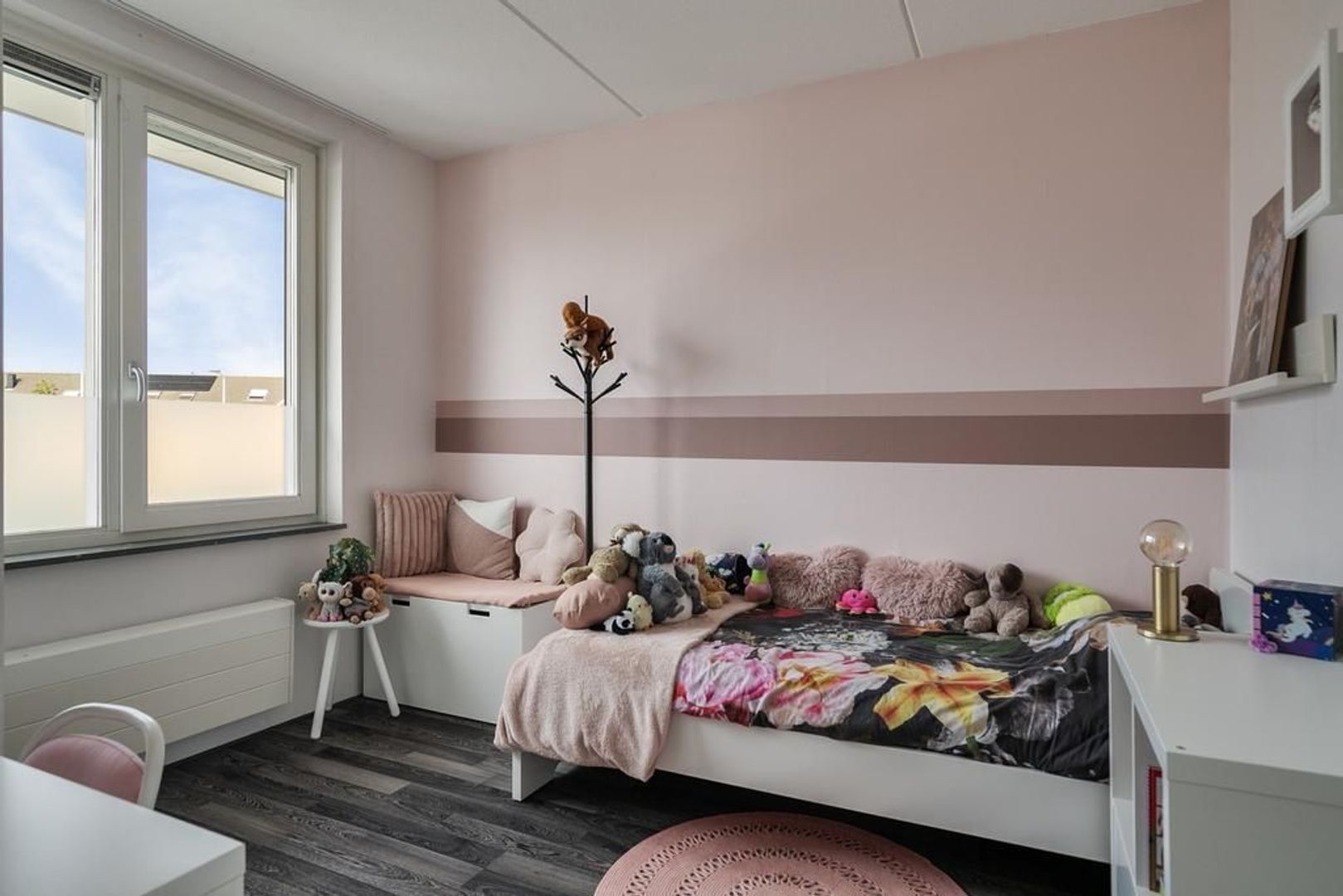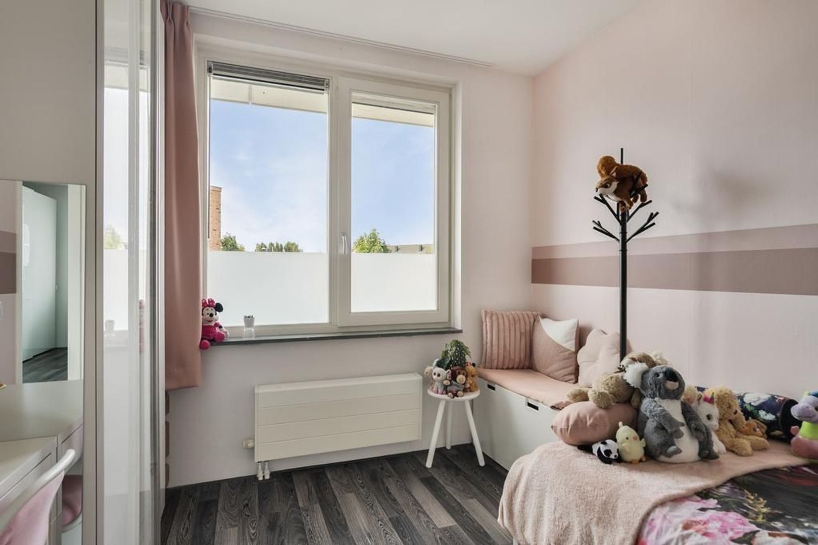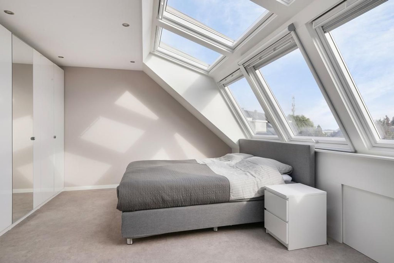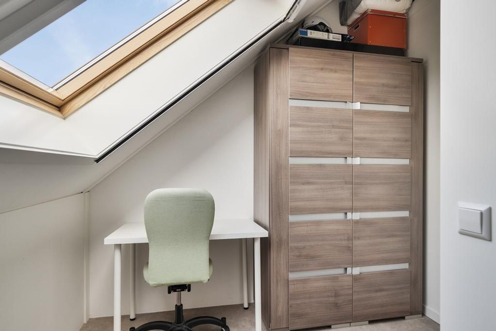 Slaapkamer 4, gelegen aan de achterzijde is voorzien van een unieke dakserre. Dit adembenemende alternatief voor een dakkapel geeft je meer ruimte, frisse lucht en daglicht. Met elektrische rolluiken, plissé raambekleding en een hor is het in elk jaargetij een genot om onder te slapen. Daarnaast zorgen de met schuifdeuren afgesloten knieschotten voor praktische opbergruimte.