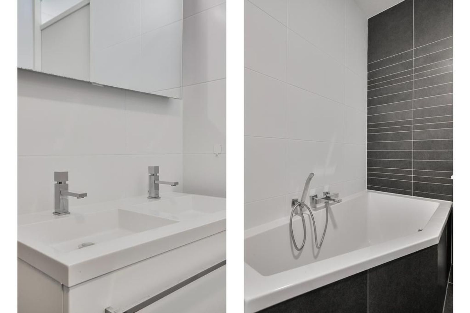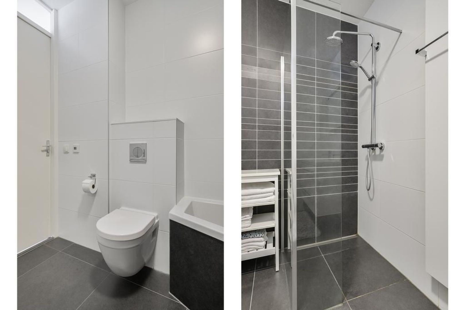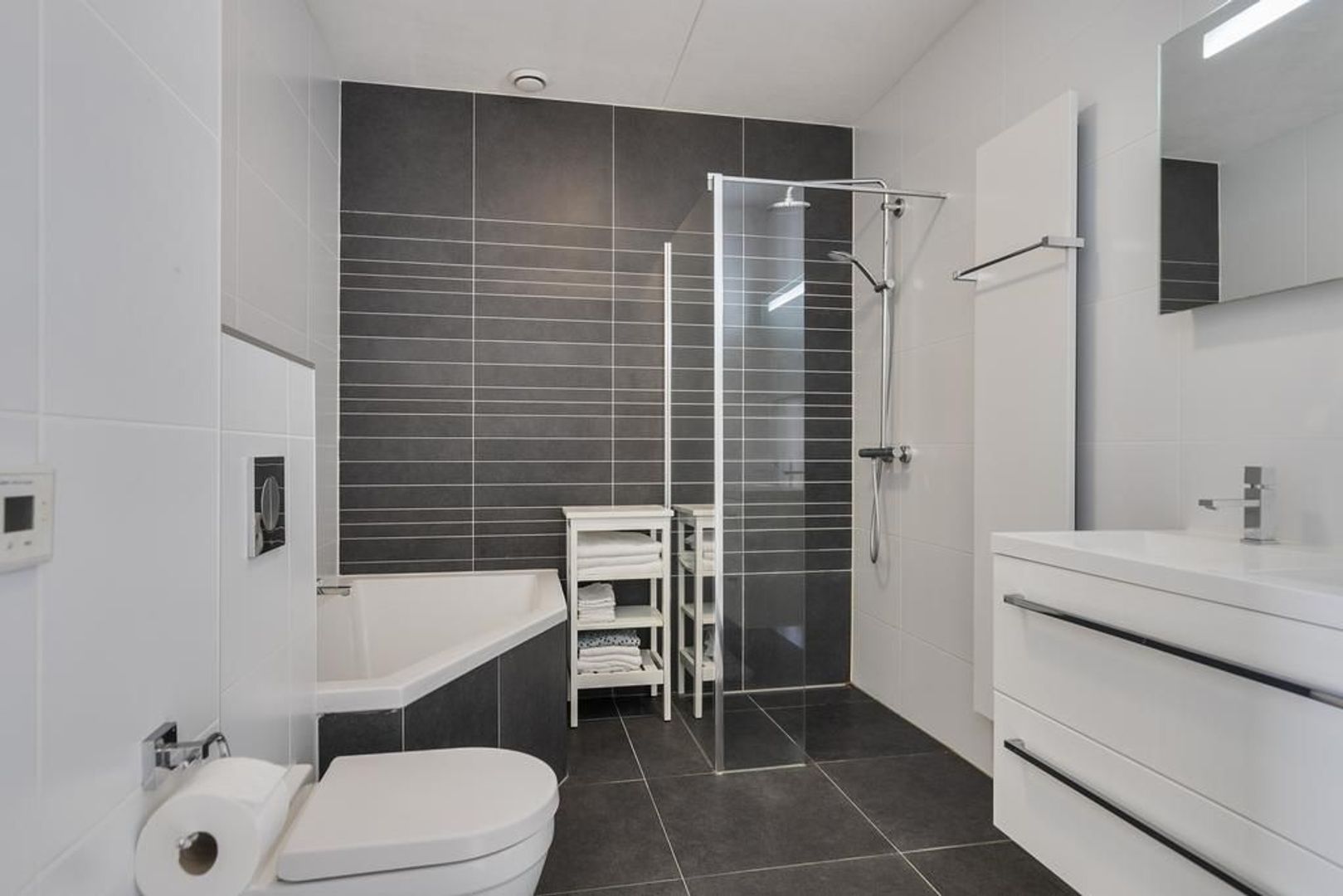 De badkamer is voorzien van een wastafelmeubel, toilet, handdoekradiator, ligbad en inloopdouche met douchescherm.