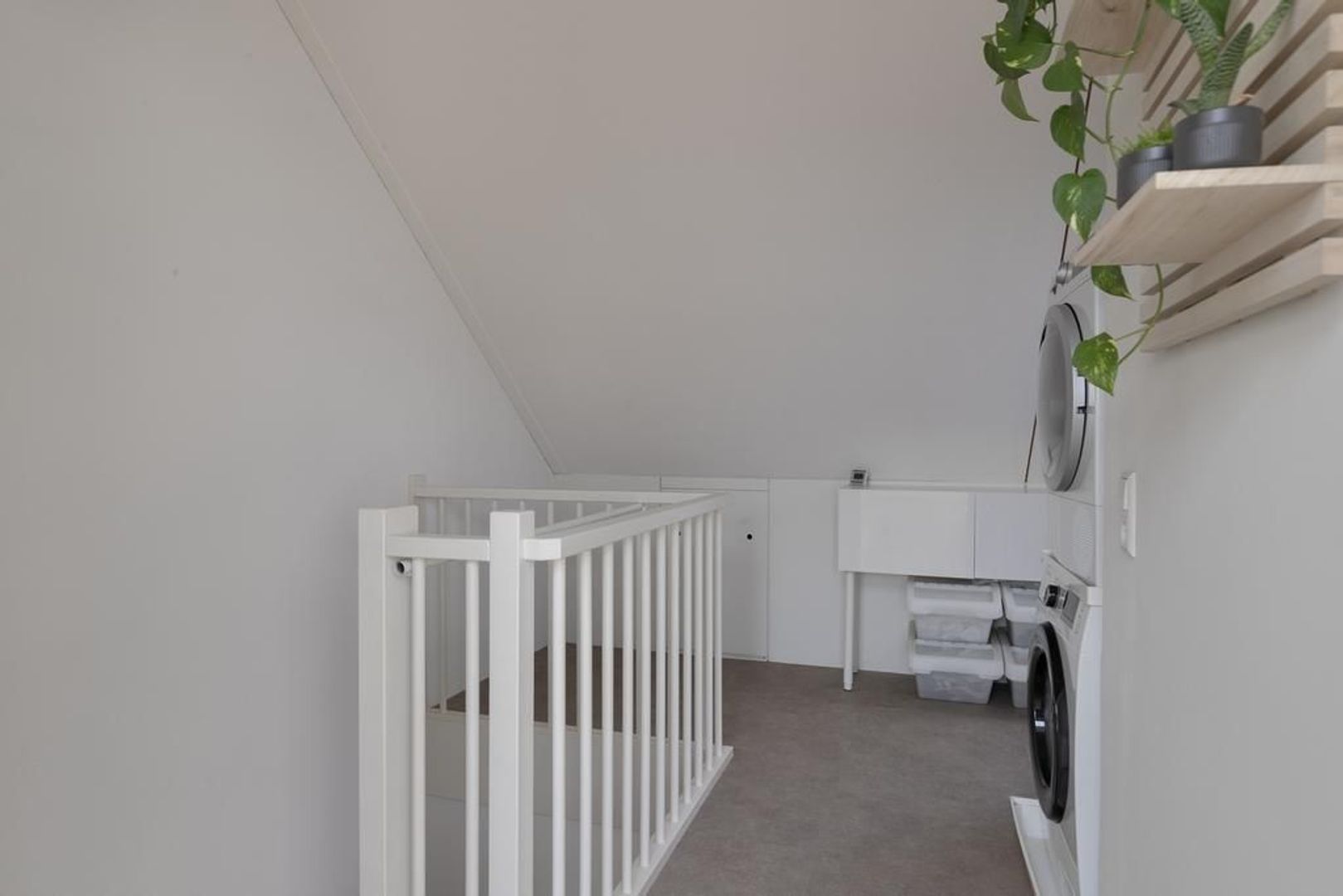Deze geheel verbouwde zolder is voorzien van een PVC tegelvloer. De ruime overloop en wasruimte met aansluiting voor de wasmachine en droger geeft ook toegang tot de andere knieschotten. De opstelplaats voor de cv-ketel (Intergas, 2009) en het mechanisch ventilatiesysteem is mooi weggewerkt in een kast. Naast de hobbyruimte voorzien van dakraam en hor is de toegang tot de vliering voor nog meer opbergruimte. De 18 zonnepanelen met gescheiden micro-inverters zorgen voor veel energieopwekking.