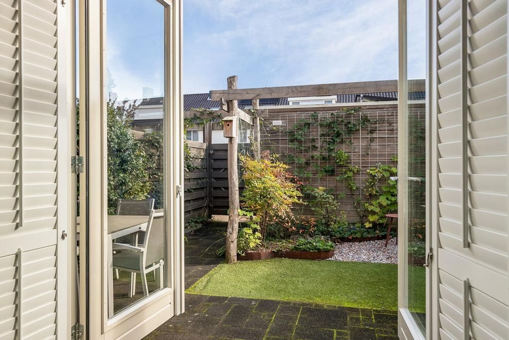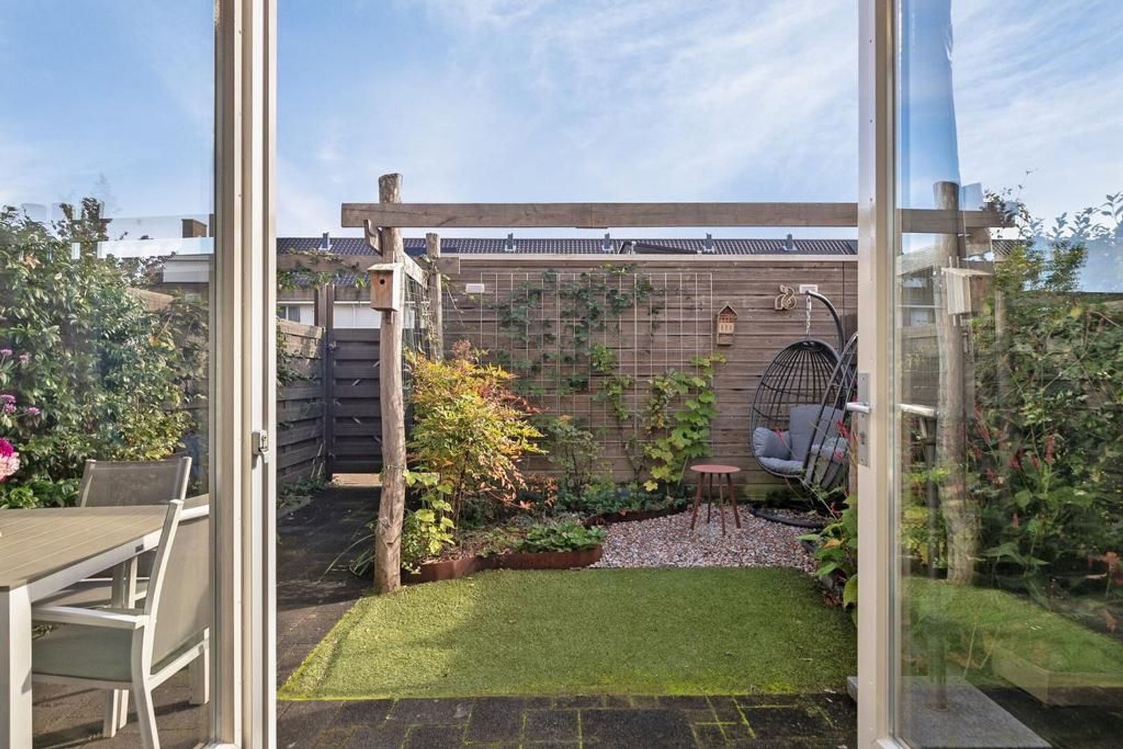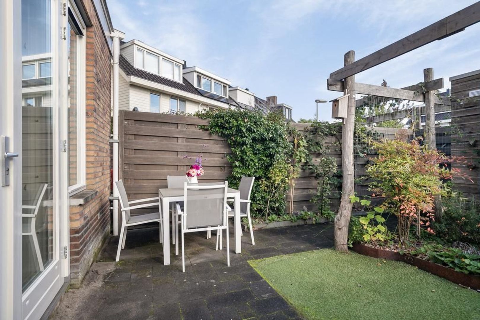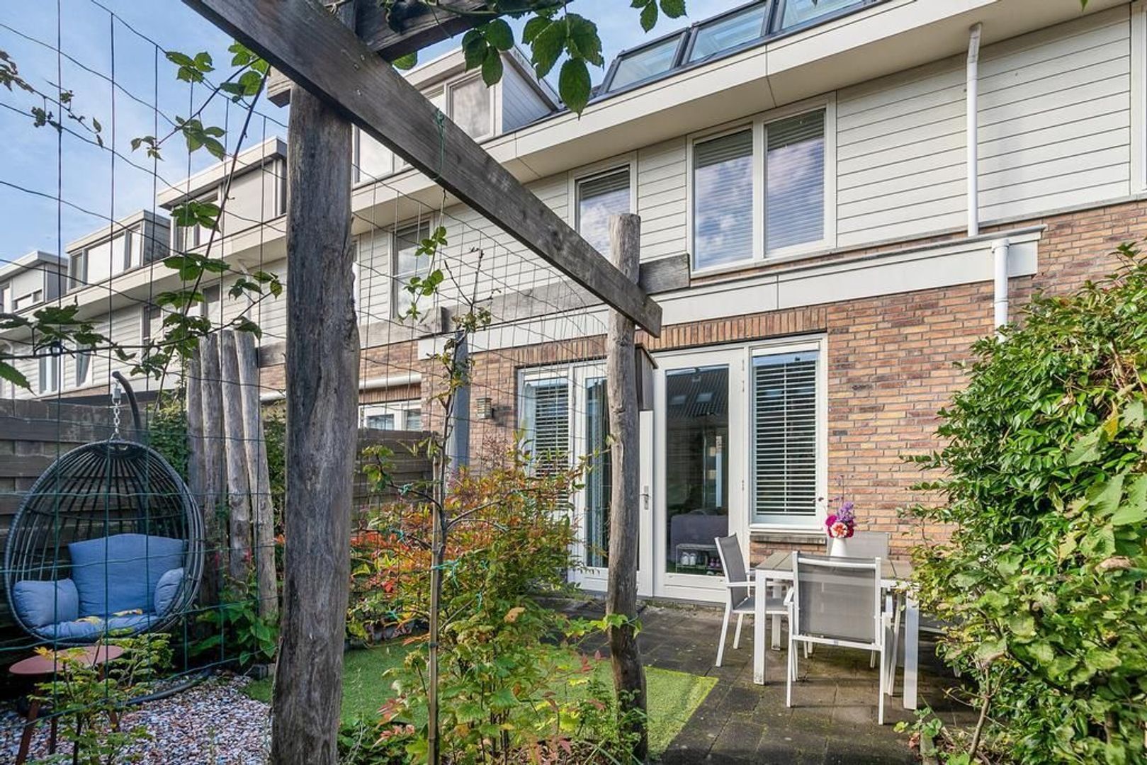 De achtertuin is betegeld en heeft een stukje kunstgras, terras met kiezels en pergola van kastanjehout. Naast de berging bevind zich de achteruitgang naar de twee eigen parkeerplaatsen. Aan de berging is een elektrische laadpaal bevestigd.