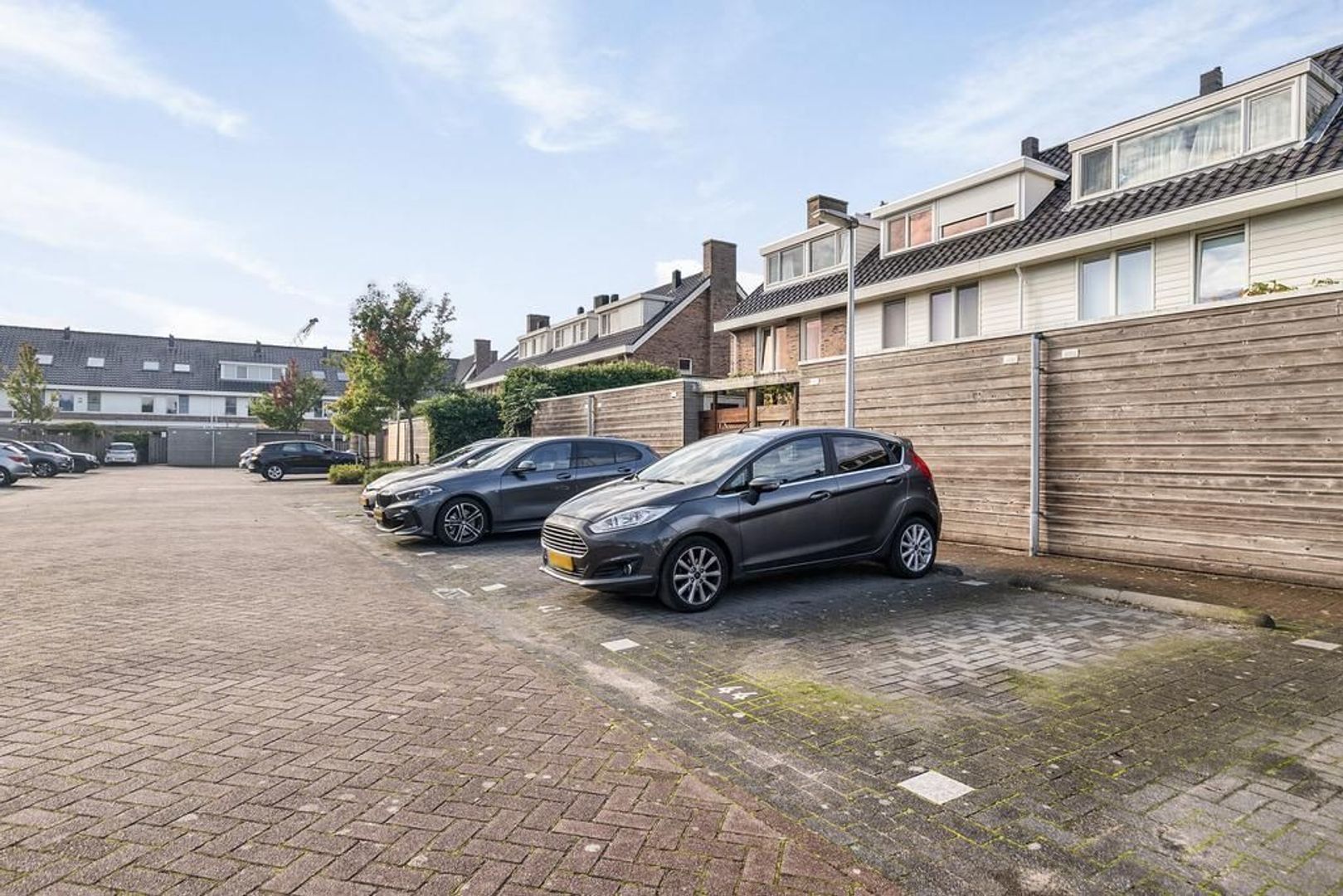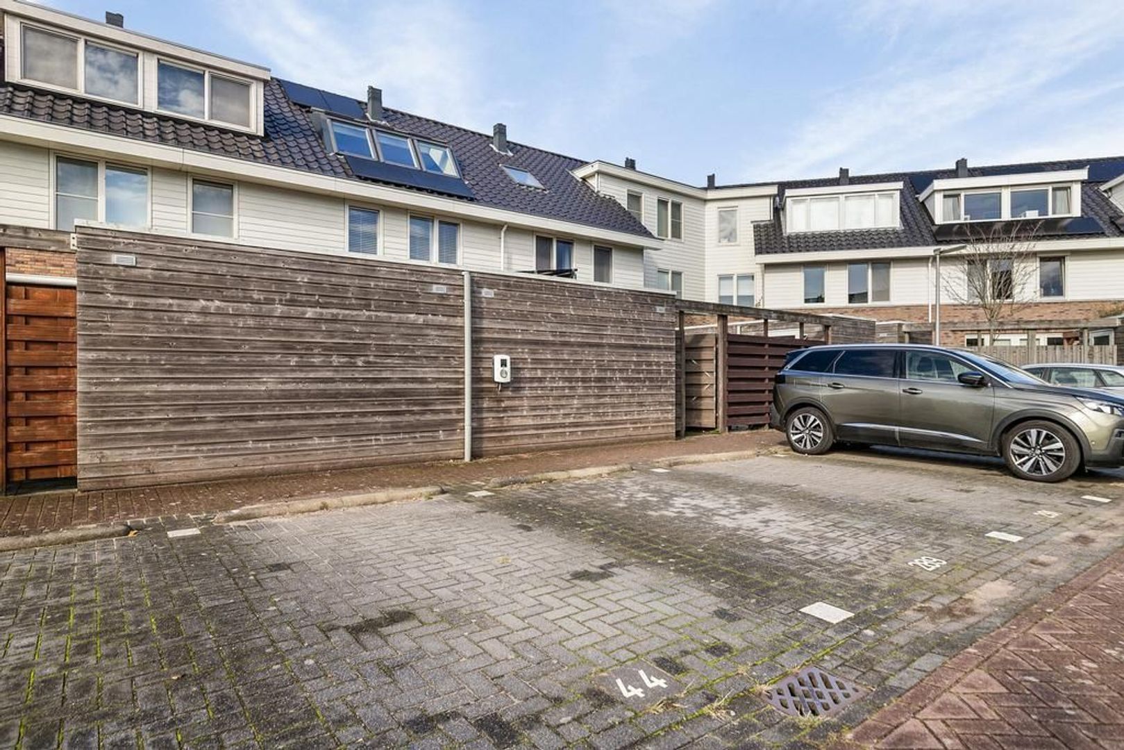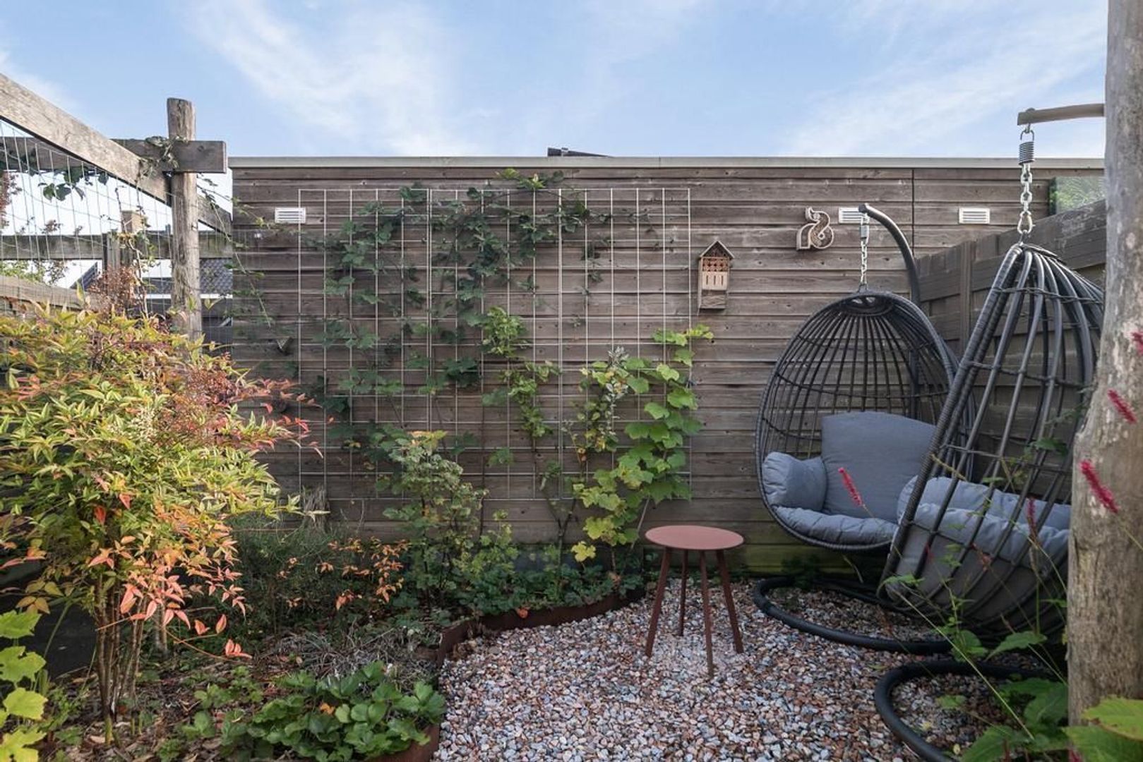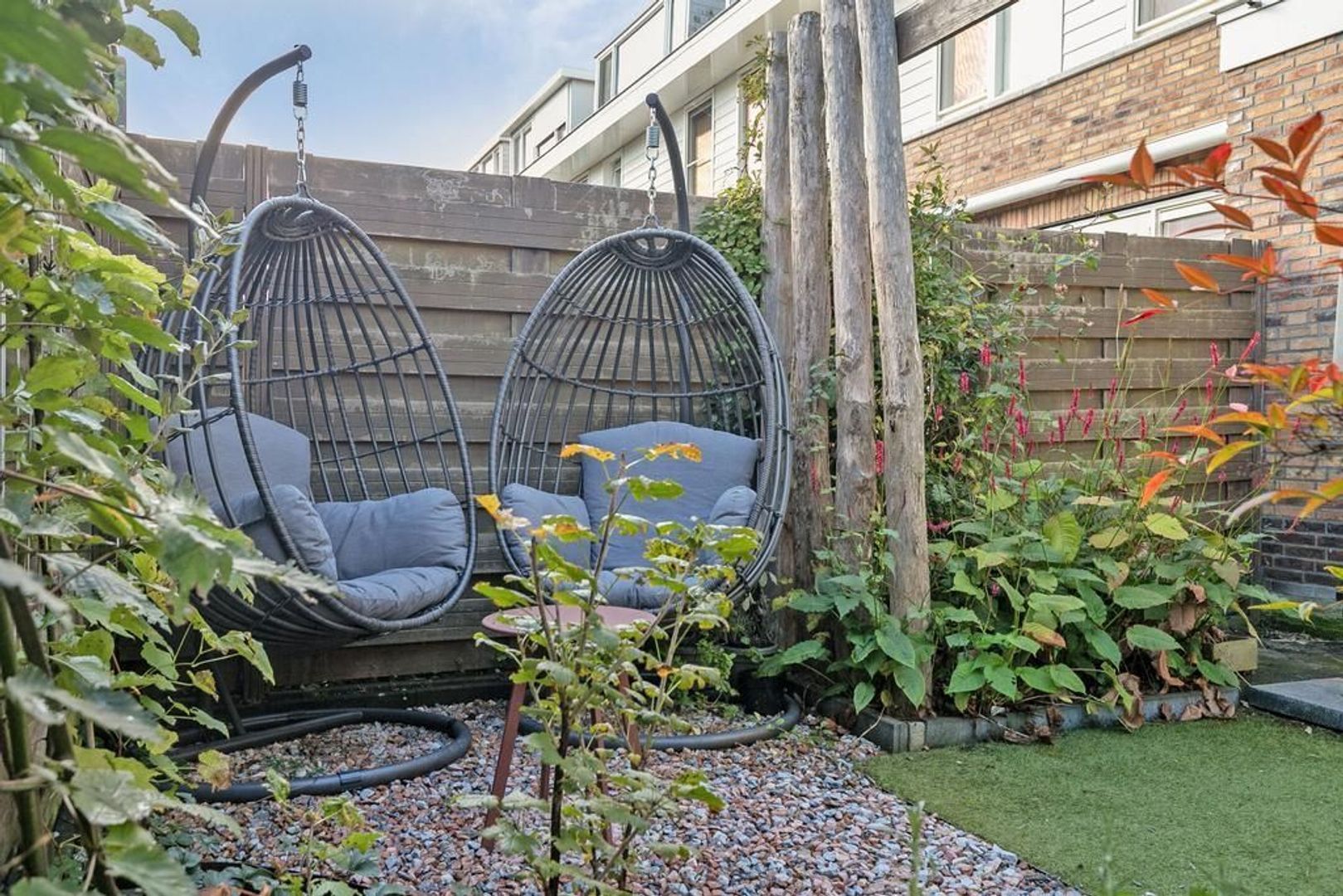 De achtertuin is betegeld en heeft een stukje kunstgras, terras met kiezels en pergola van kastanjehout. Naast de berging bevind zich de achteruitgang naar de twee eigen parkeerplaatsen. Aan de berging is een elektrische laadpaal bevestigd.