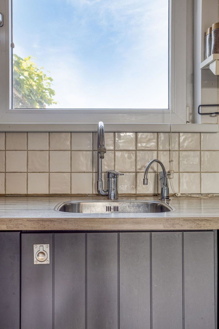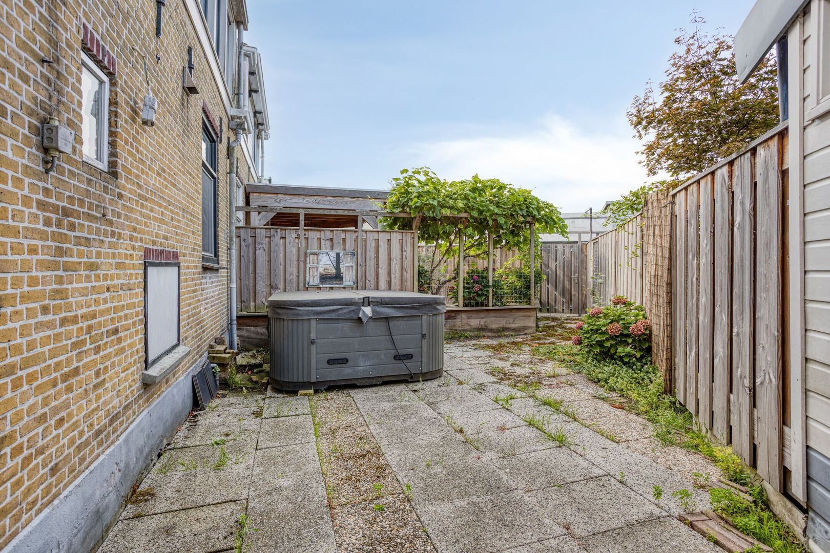Vanuit de bijkeuken kom je in de ruime achtertuin. De tuin is volledig betegeld en gelegen op het Noorden.