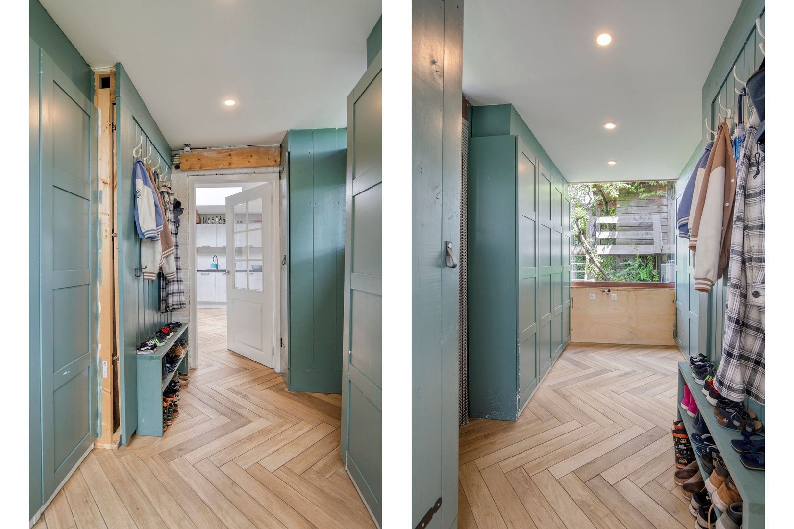 Entree aan de voorzijde van de woning. In de hal bevinden zich de aansluitingen voor de wasmachine en droger (netjes weggewerkt in een kast), evenals de opstelplaats van de cv-ketel. Vanuit de hal is er toegang tot de woonkeuken, woonkamer, toiletruimte, berging en trapopgang.
