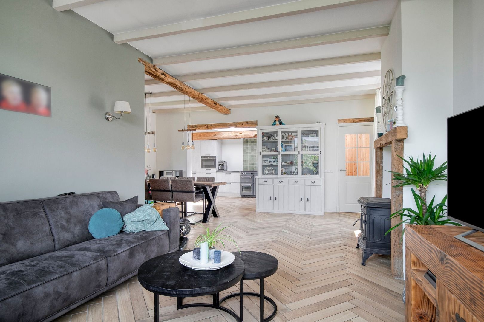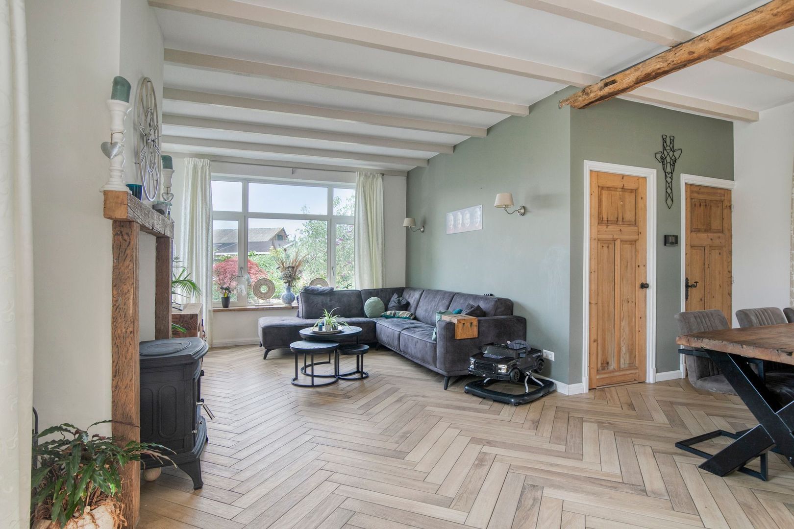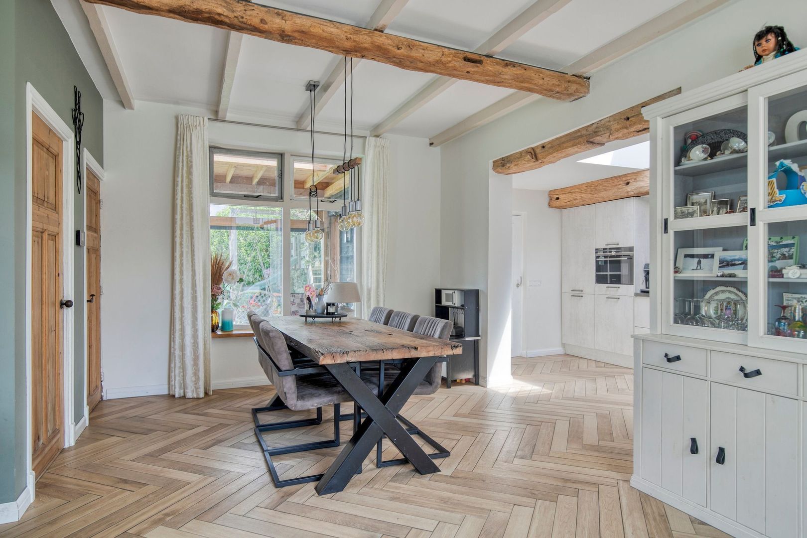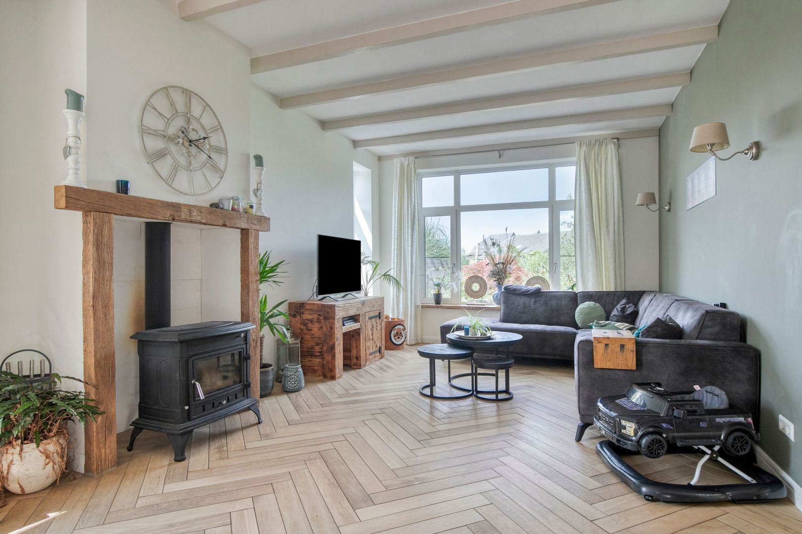 De lichte woonkamer is afgewerkt met een plavuizen vloer in visgraatmotief, voorzien van vloerverwarming. Via de bijkeuken heb je toegang tot de aangebouwde serre/overkapping, waar je prachtig uitkijkt over de diepe en brede tuin.