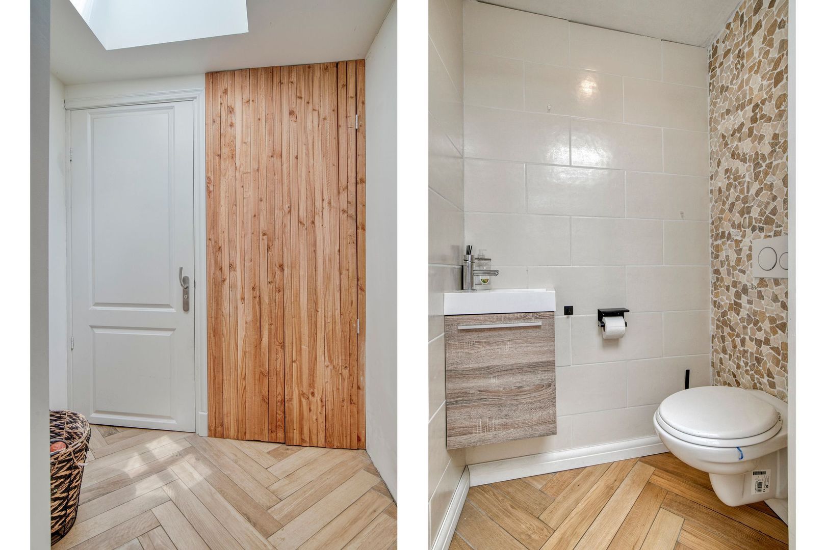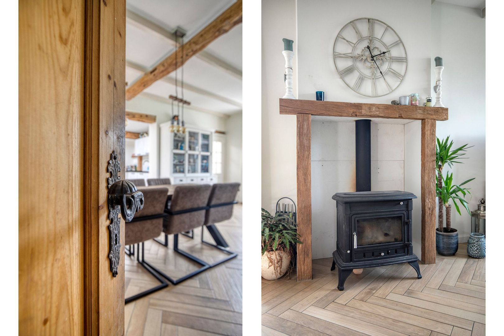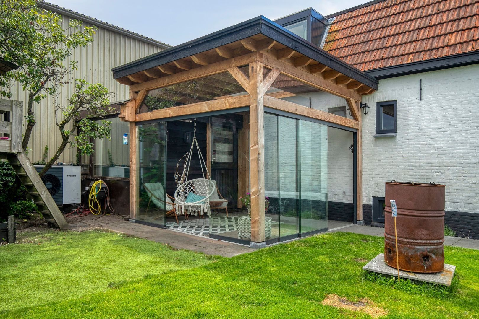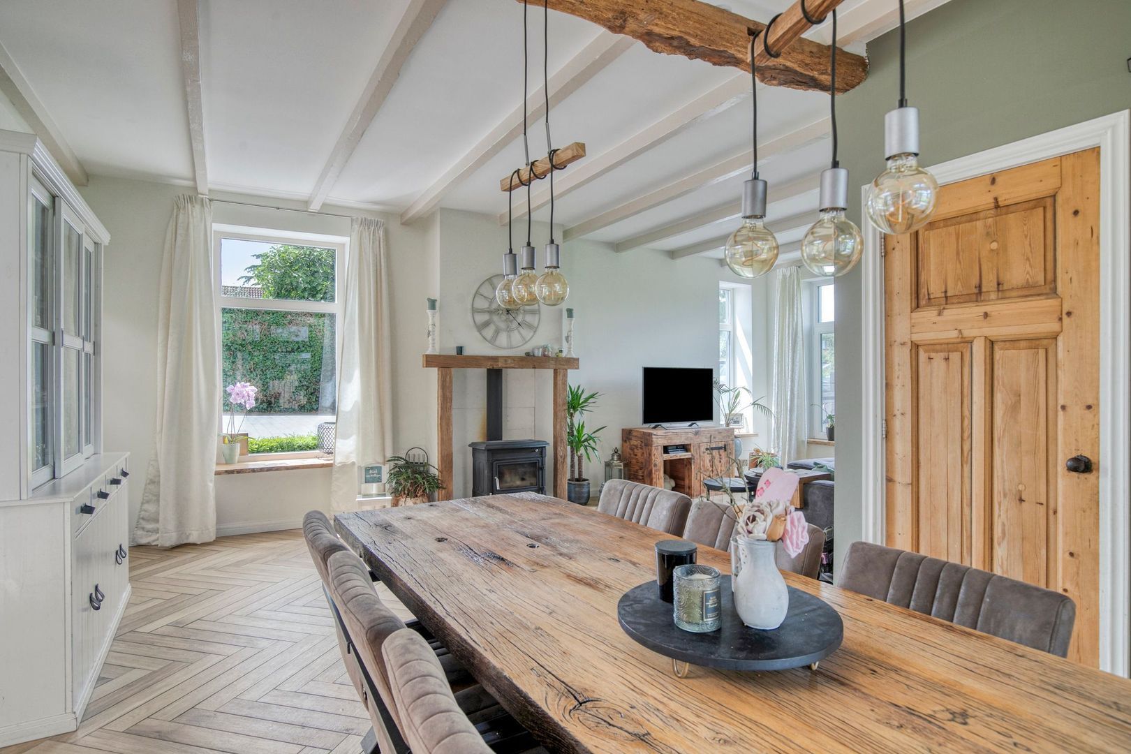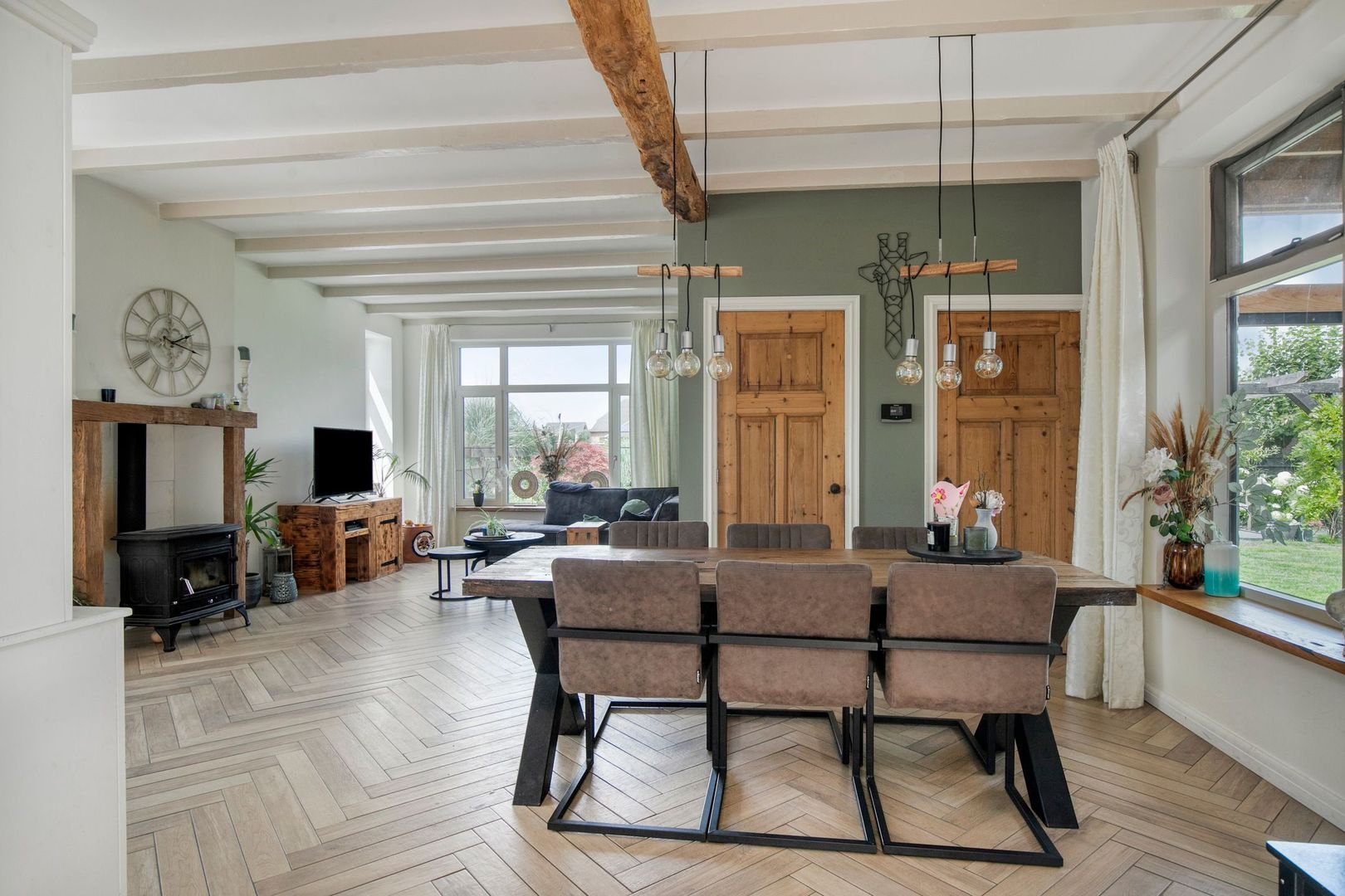 De lichte woonkamer is afgewerkt met een plavuizen vloer in visgraatmotief, voorzien van vloerverwarming. Via de bijkeuken heb je toegang tot de aangebouwde serre/overkapping, waar je prachtig uitkijkt over de diepe en brede tuin.