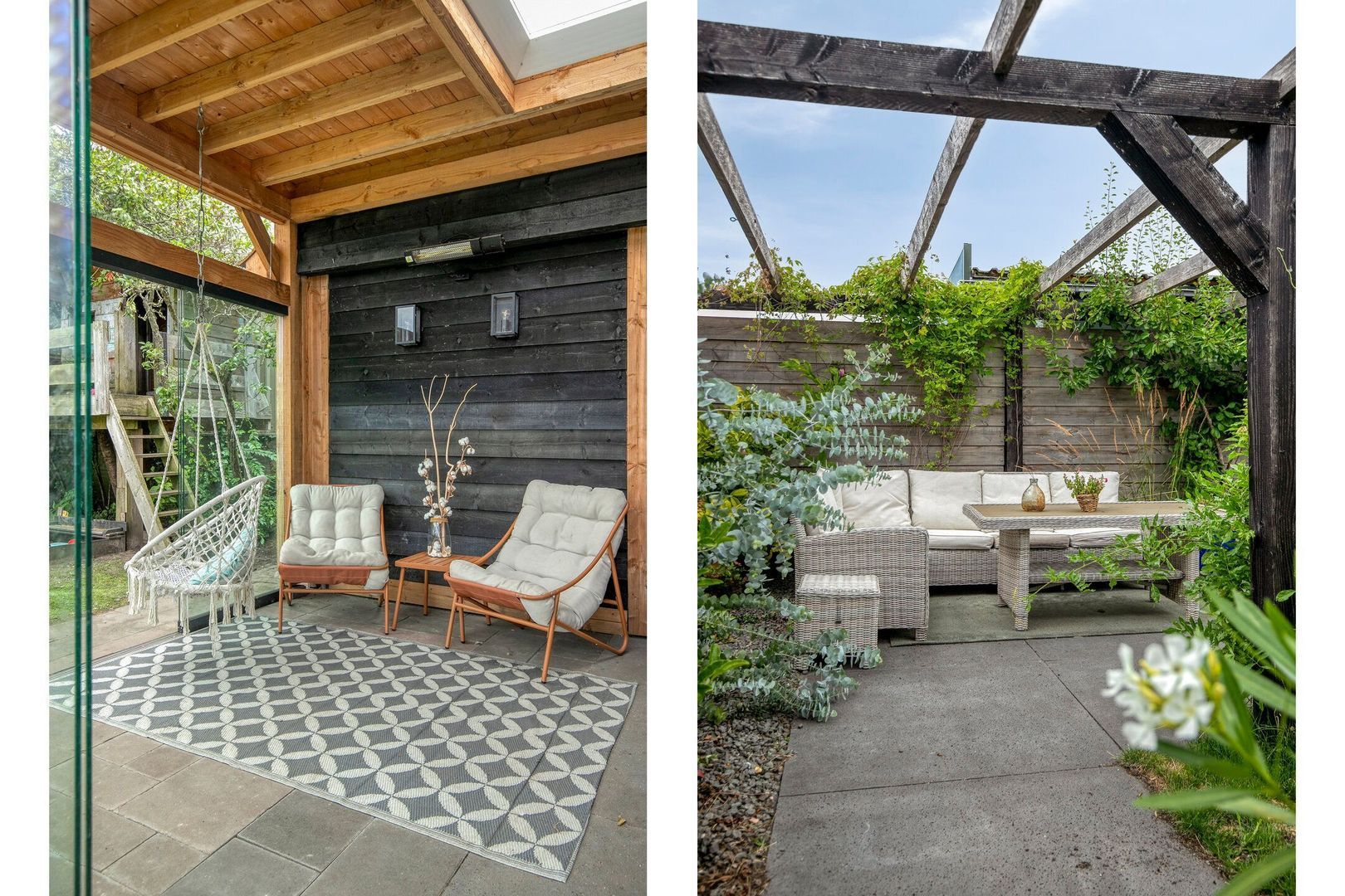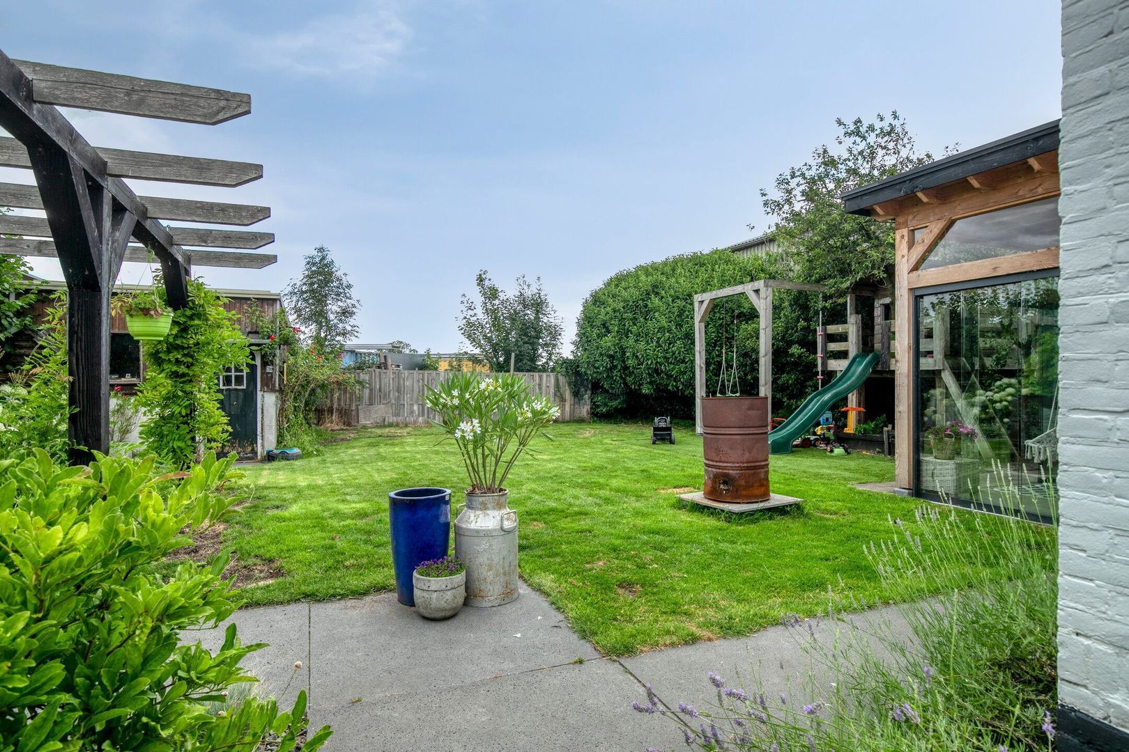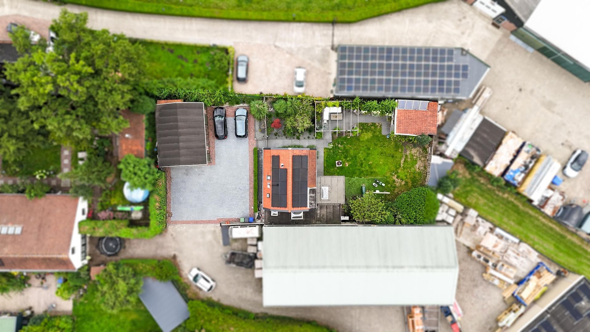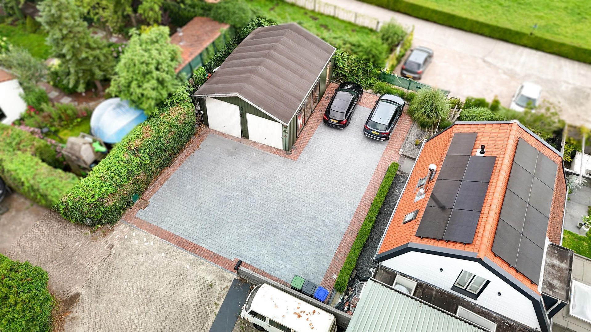 De achtertuin is ingedeeld met verschillende betegelde terrassen en plantenperkjes, met voldoende zon- en schaduwplekjes. Ook is er een houten berging aanwezig. Aan de zijkant van het perceel vind je een ruime oprit met plaats voor meerdere auto's én toegang tot de ruime garage/werkplaats, perfect voor werk aan huis, opslag of hobbyruimte.