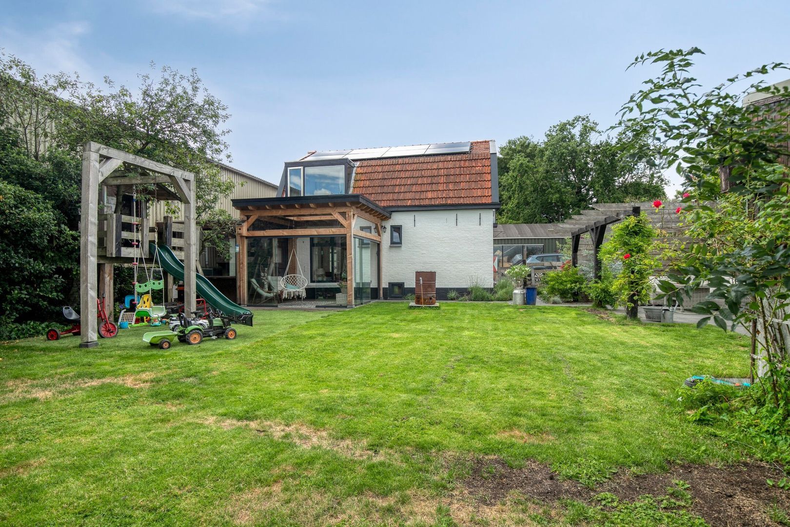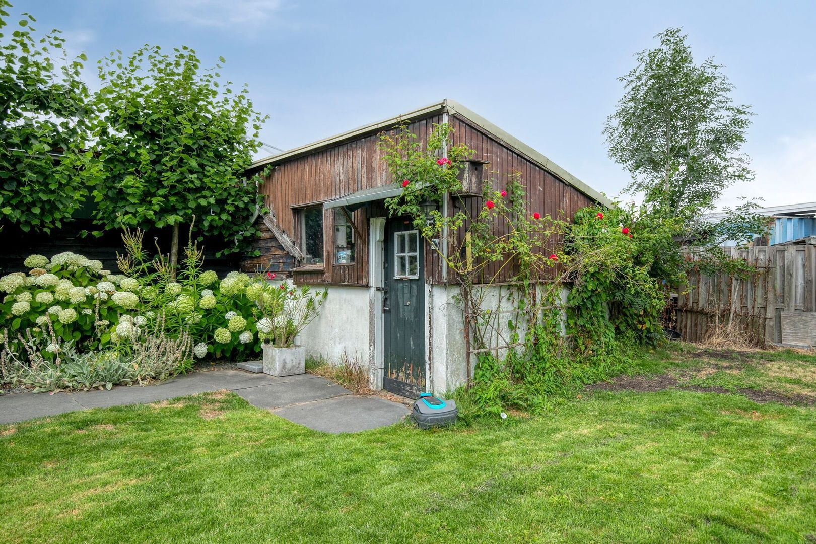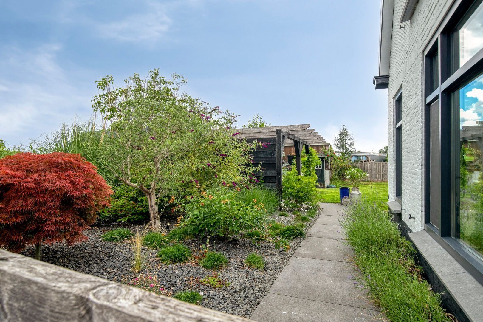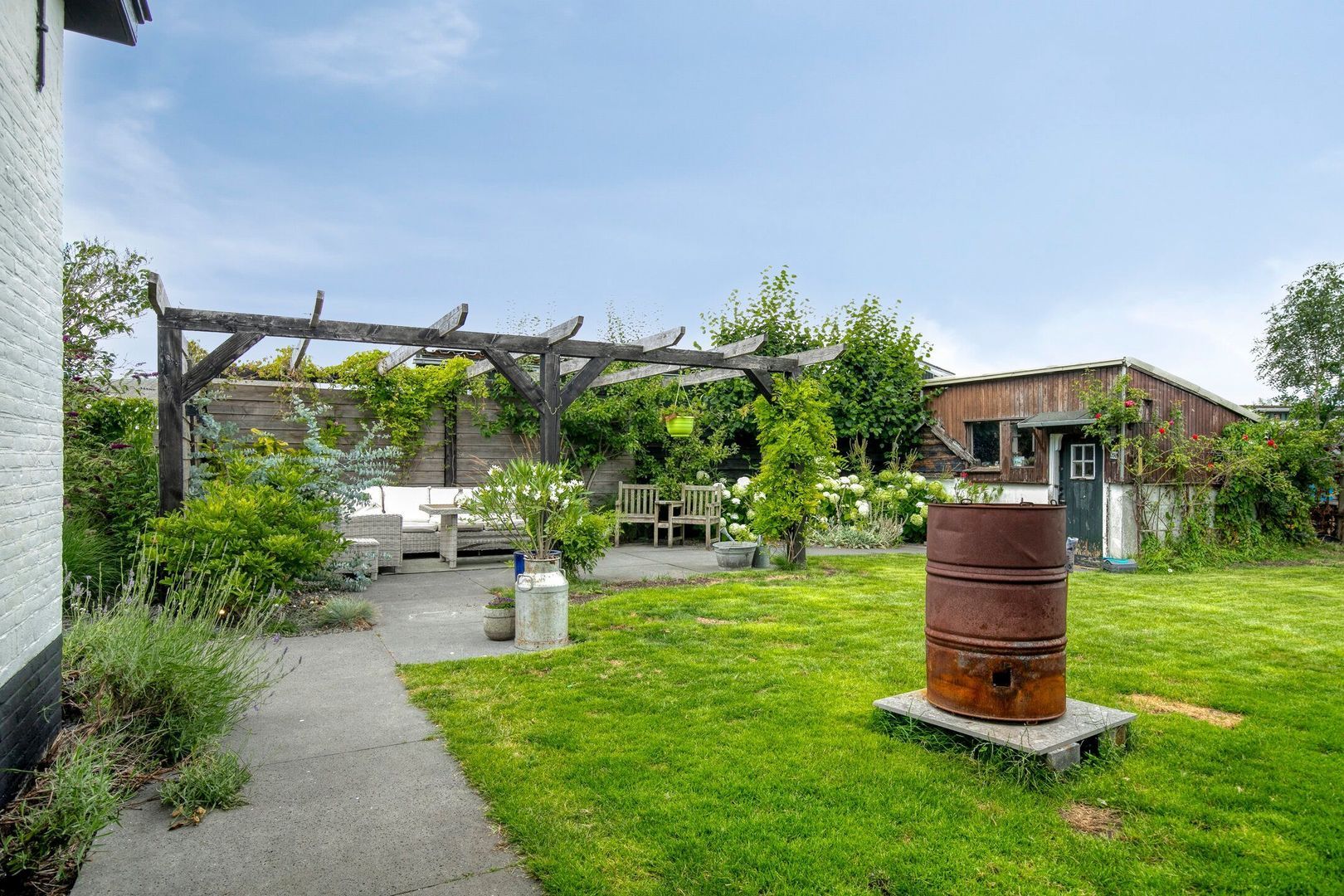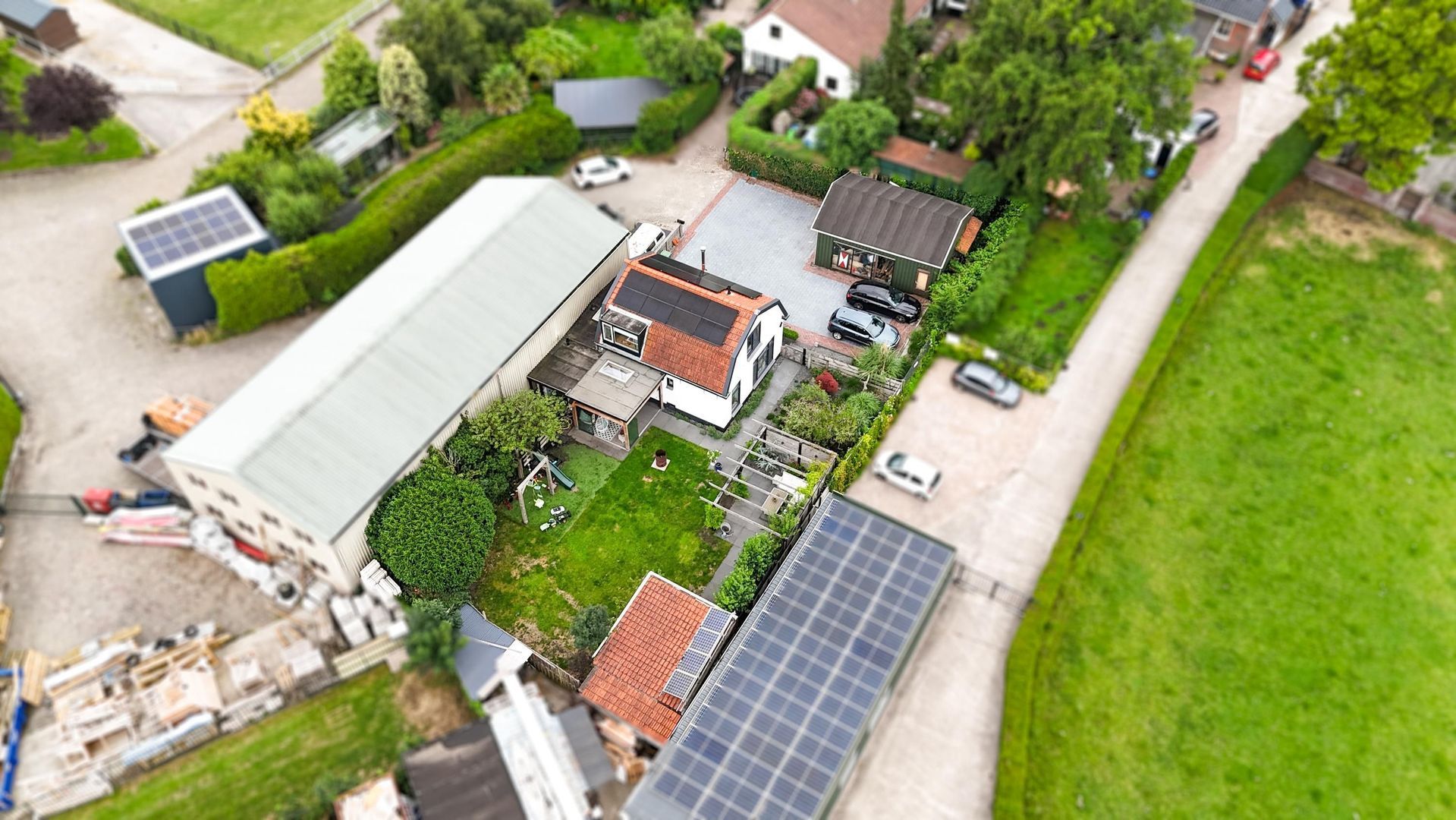 De achtertuin is ingedeeld met verschillende betegelde terrassen en plantenperkjes, met voldoende zon- en schaduwplekjes. Ook is er een houten berging aanwezig. Aan de zijkant van het perceel vind je een ruime oprit met plaats voor meerdere auto's én toegang tot de ruime garage/werkplaats, perfect voor werk aan huis, opslag of hobbyruimte.