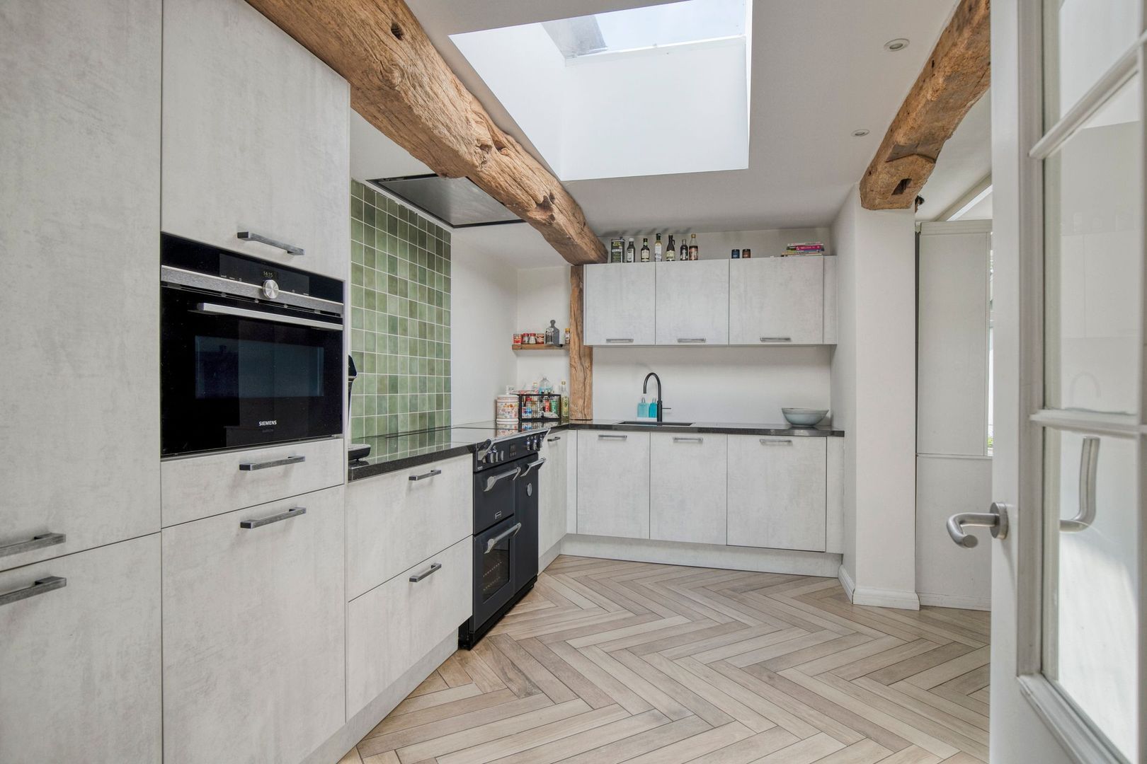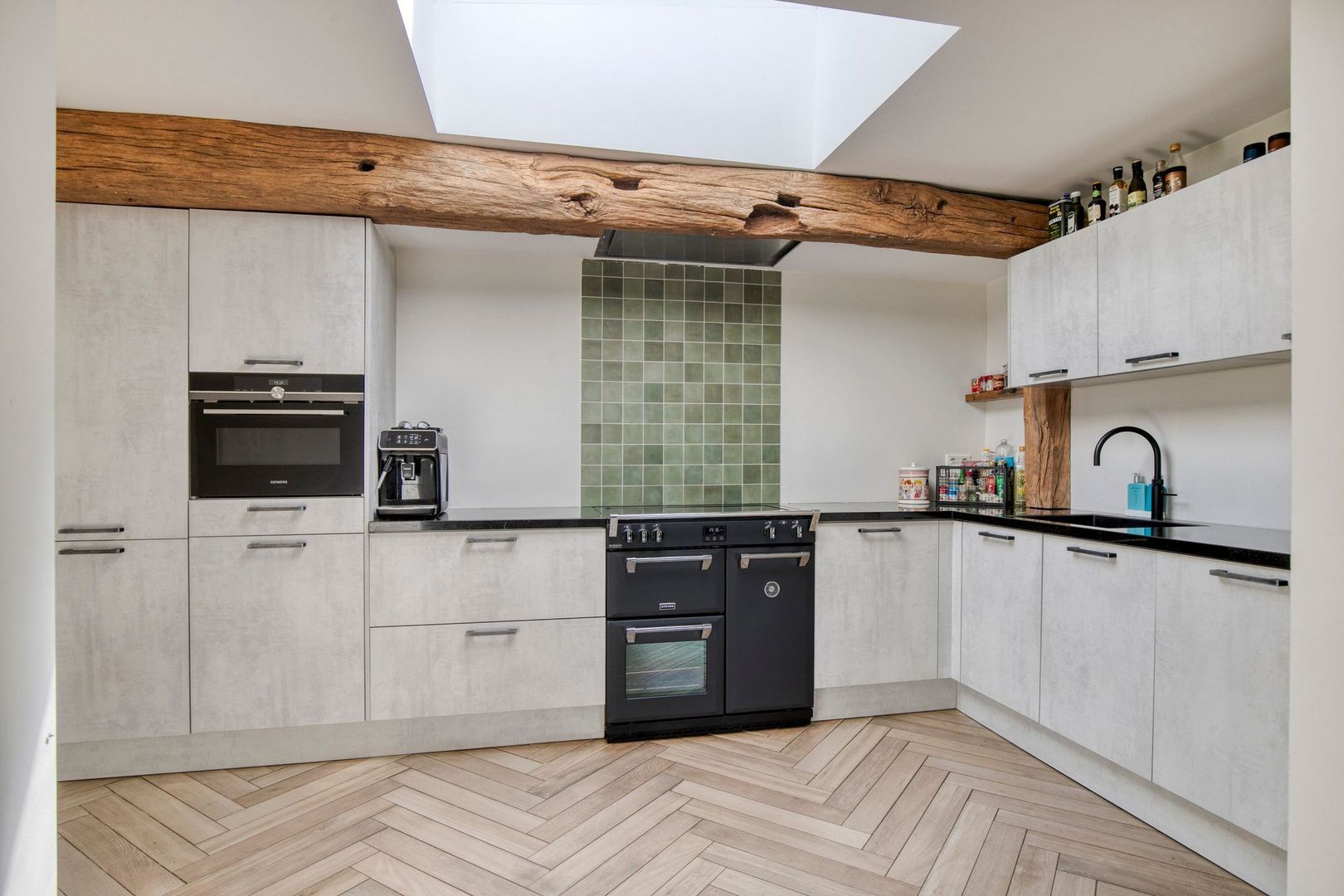 De woonkeuken is ruim opgezet en beschikt over een lichtkoepel die zorgt voor extra daglicht. De keuken is voorzien van alle gemakken: grilloven, pizzaoven, dubbele oven, inductiekookplaat met geïntegreerde afzuiging, koelkast, magnetron, vaatwasser én een quooker.