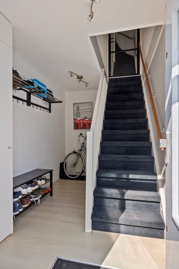 Eigen entree, tussen twee heel mooi onderhouden plantenbakken, met meterkast, trapopgang naar de woning en praktische (berg)ruimte naast en onder de trap. Bij de trap naar de 1e verdieping is een vaste deur geplaatst, wat zorgt voor extra comfort en een nette afscheiding tussen de entree en de woonverdieping.