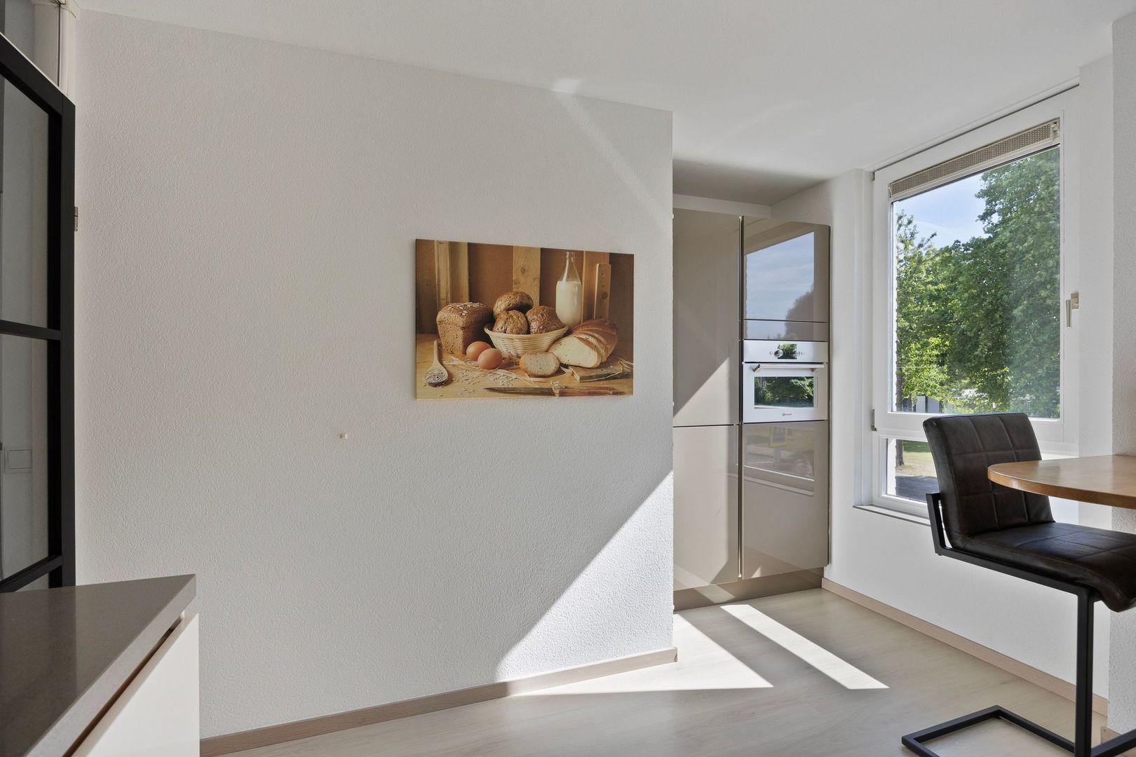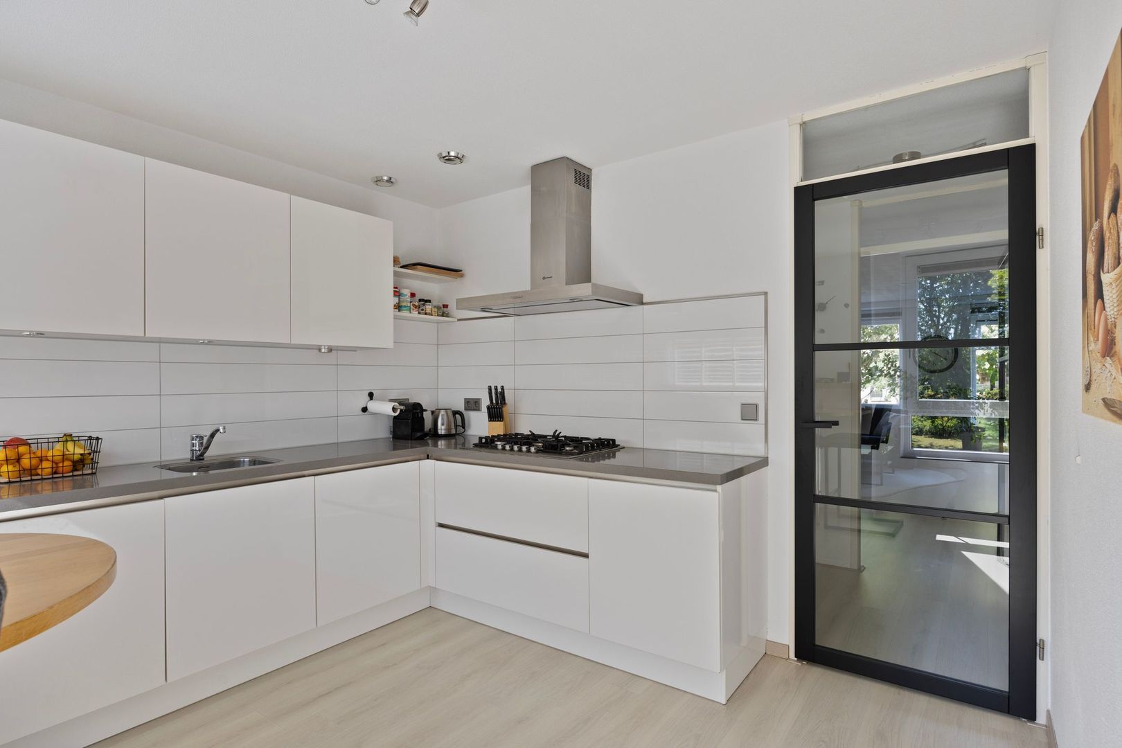 Aan de voorzijde bevindt zich de keuken, opgesteld in een L-vorm. Deze is voorzien van diverse inbouwapparatuur: een gasfornuis (5 gaspitten), afzuigkap, combimagnetron, koel-vriescombinatie en vaatwasser. Vanuit de keuken heb je vrij zicht op het Offenbachplantsoen.