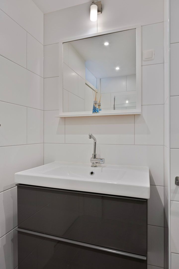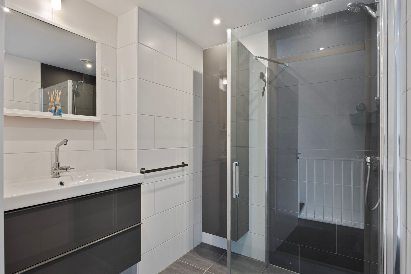 De moderne badkamer is voorzien van een douche, ruime opbergkast en een wastafelmeubel met twee opberglades.