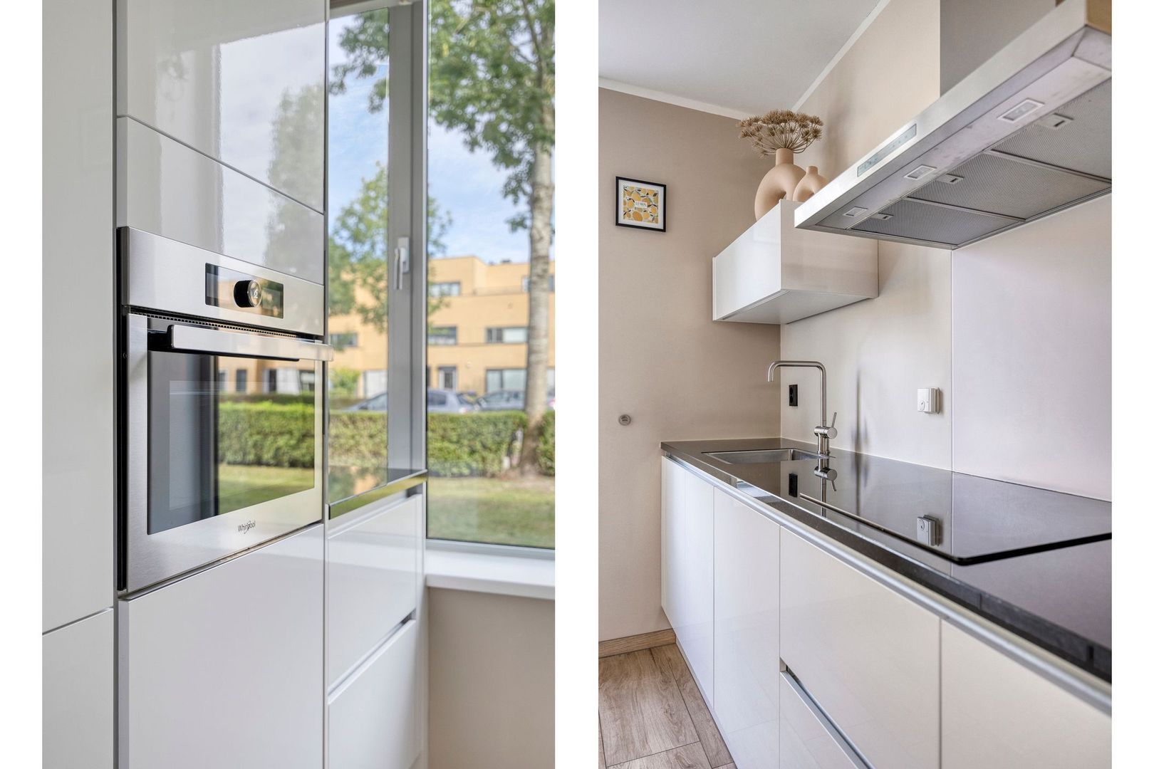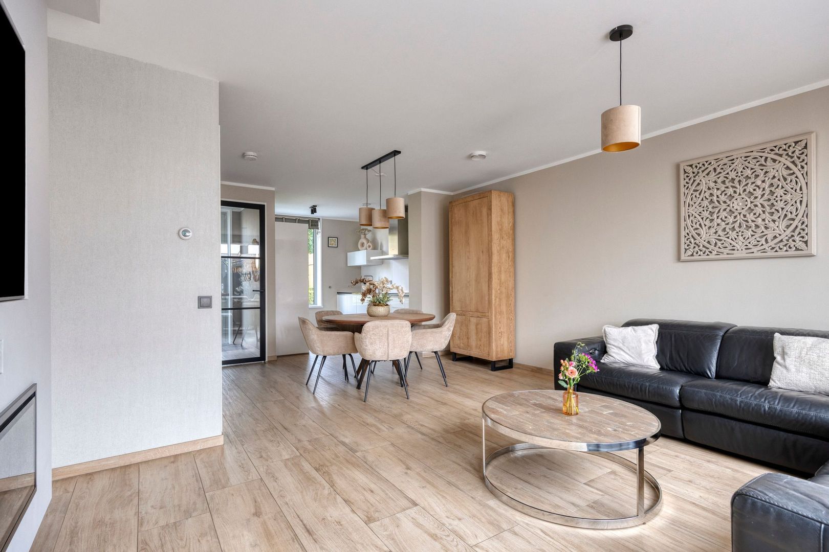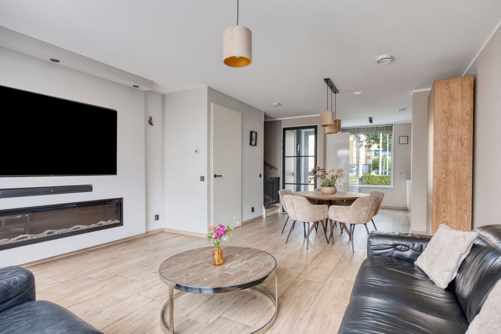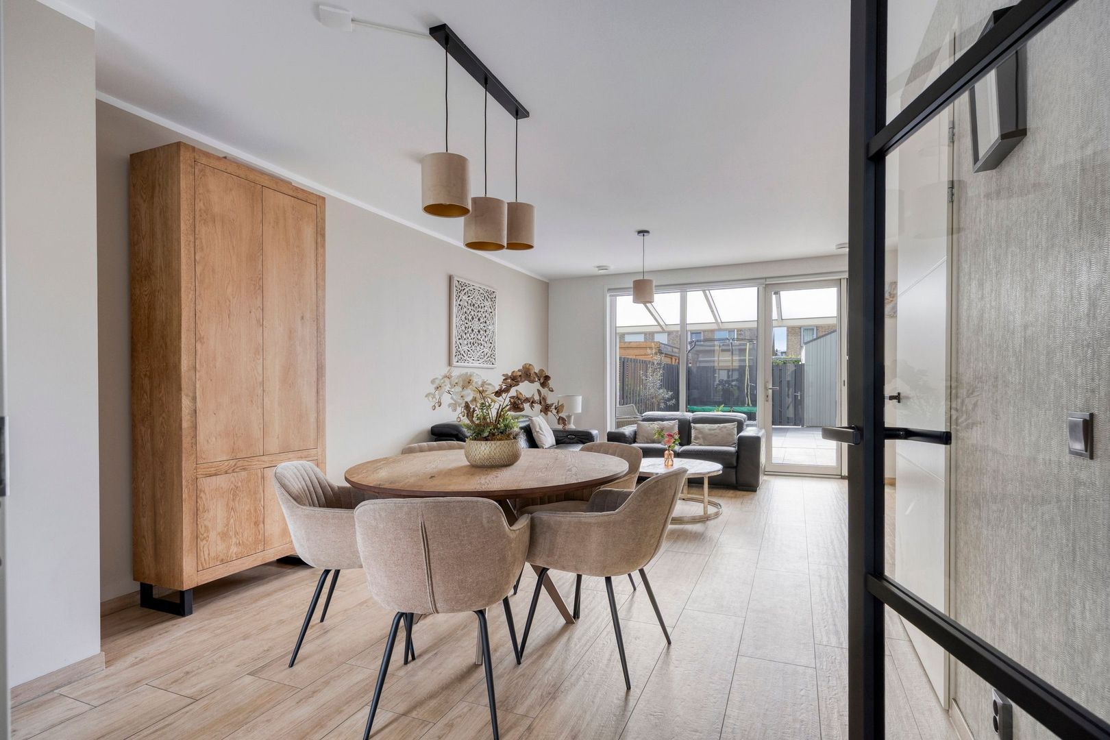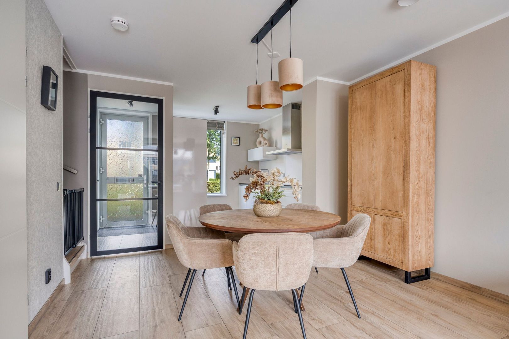Entree, hal met meterkast en toilet met fonteintje. Aan de voorzijde is het eetgedeelte gelegen met een open keuken voorzien van diverse inbouwapparatuur zoals koel-vriescombinatie, oven, inductie kookplaat, afzuigkap en een vaatwasser. De gehele benedenverdieping is voorzien van een houtlook tegelvloer met vloerverwarming. Tevens een cinemawall met elektrische haard.
