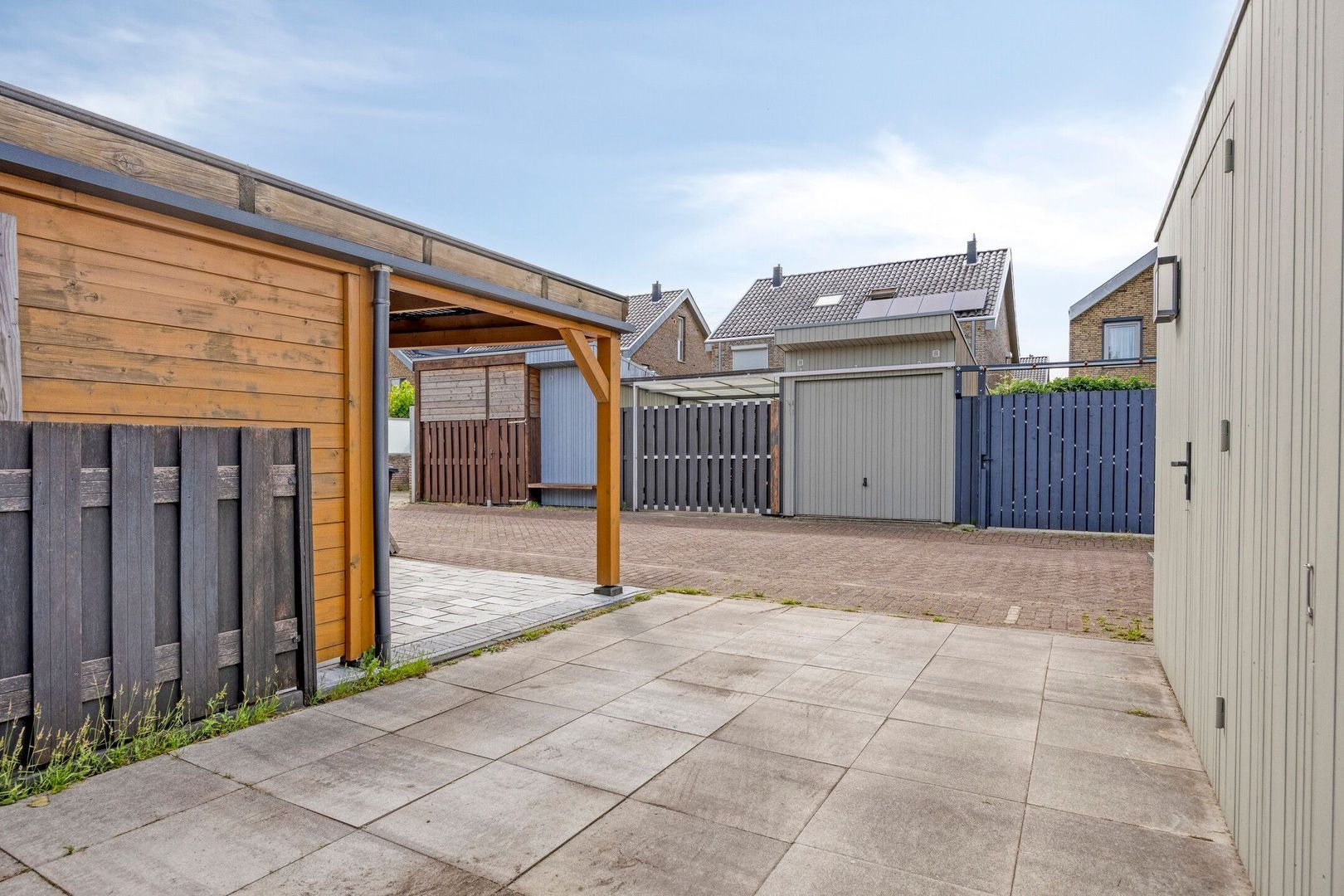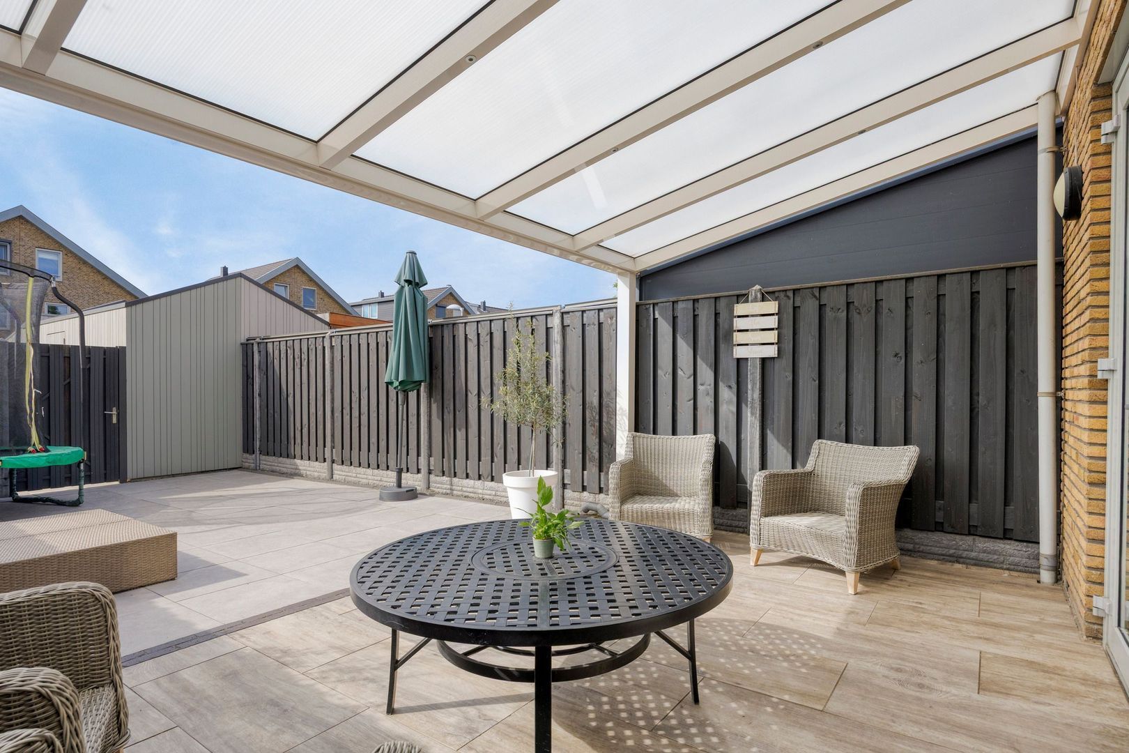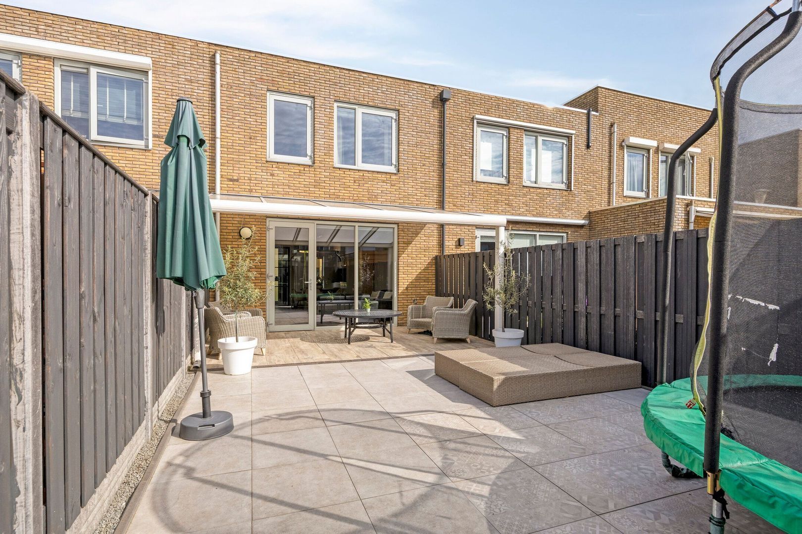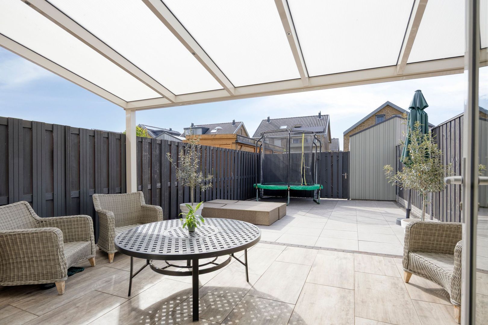 Via de woonkamer is de achtertuin bereikbaar. Deze is voorzien van keramische tegels. De achtertuin ligt op het zuidoosten. Aan de achterzijde van de tuin ligt de berging en een parkeerplaats op eigen terrein.