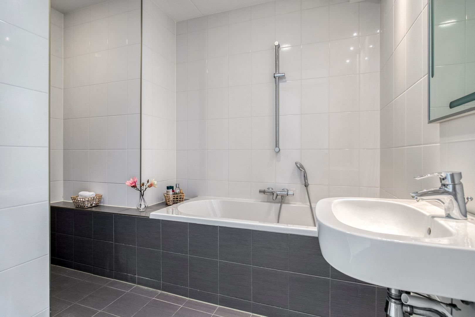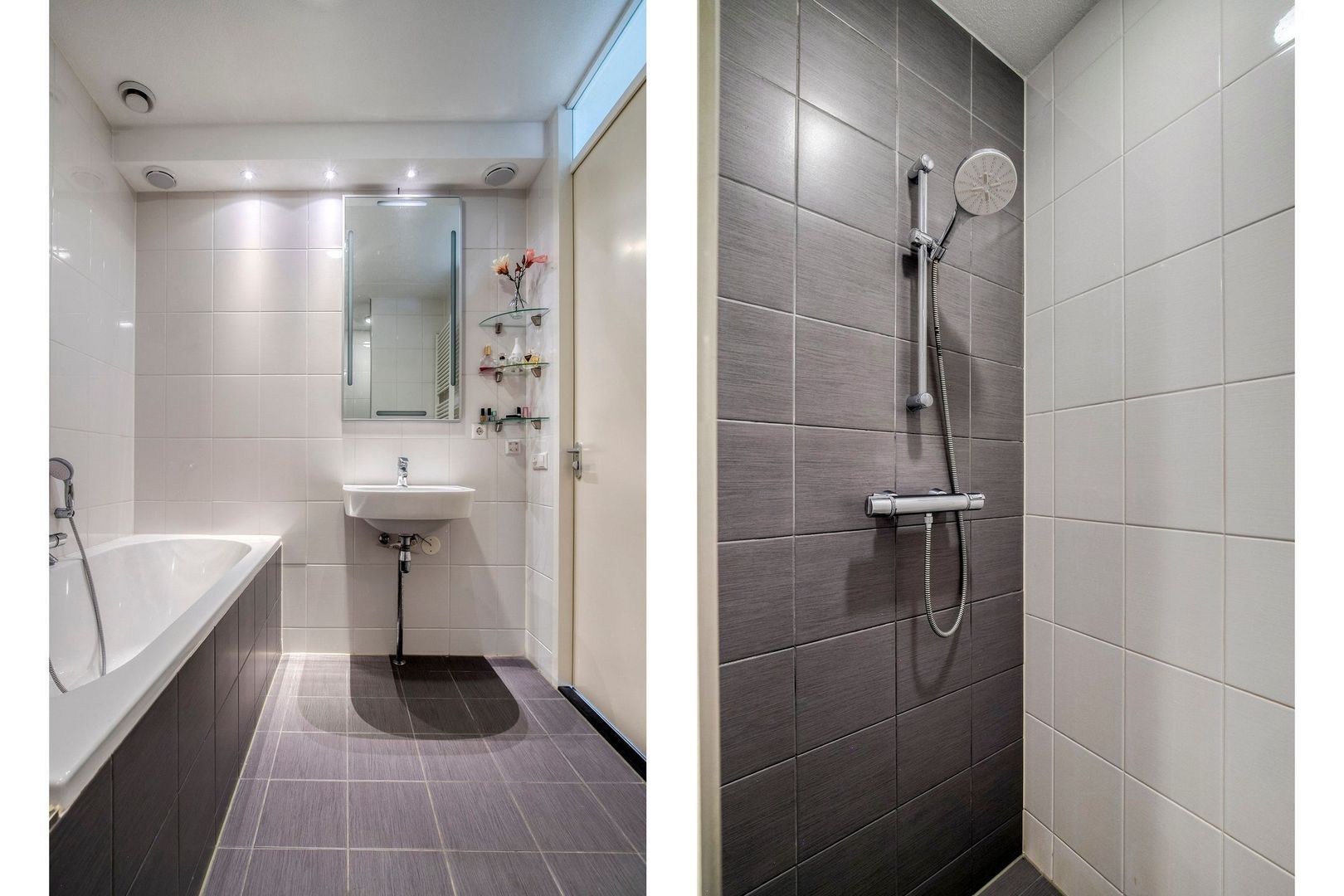 De badkamer beschikt over een ligbad, douche en handdoekradiator.