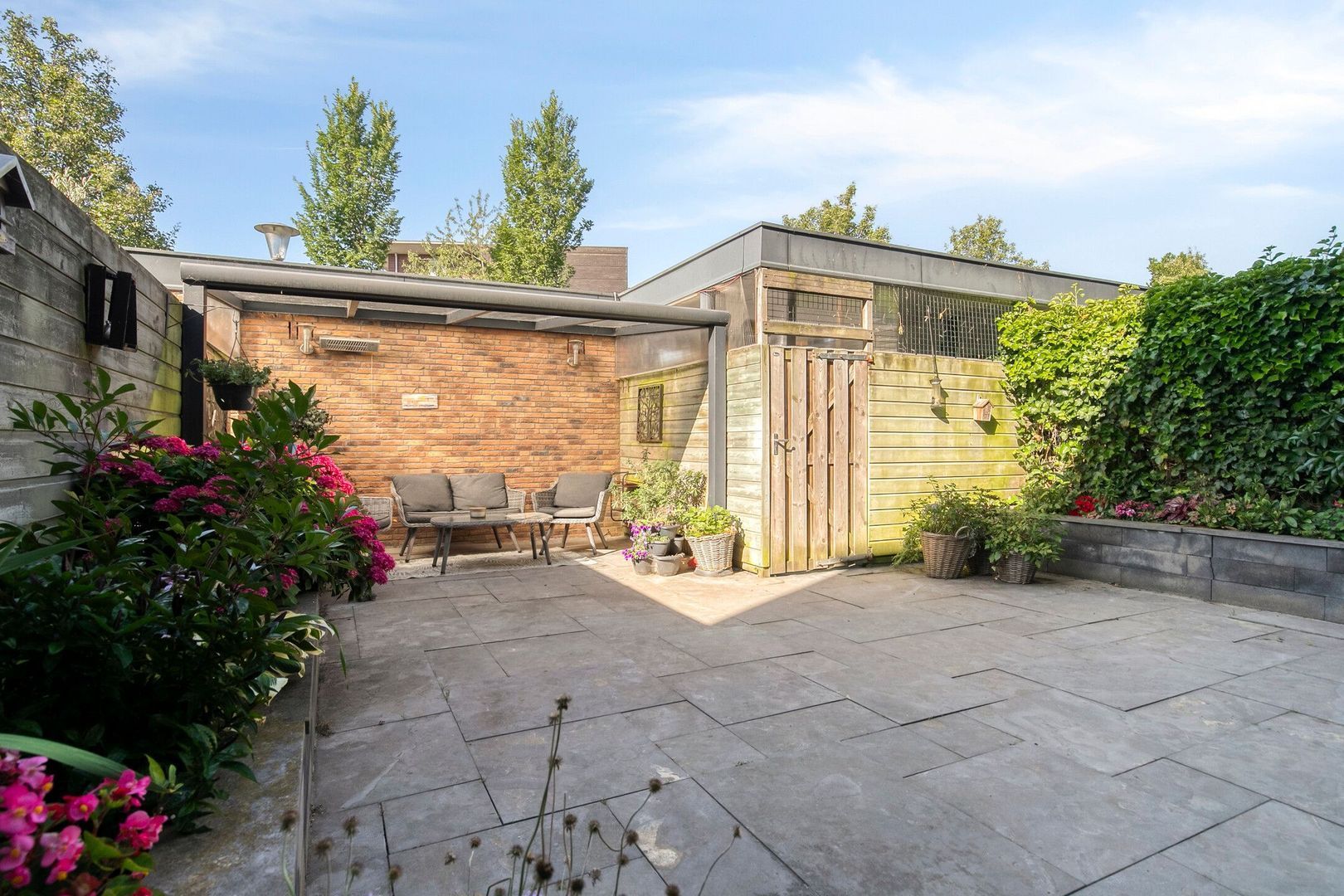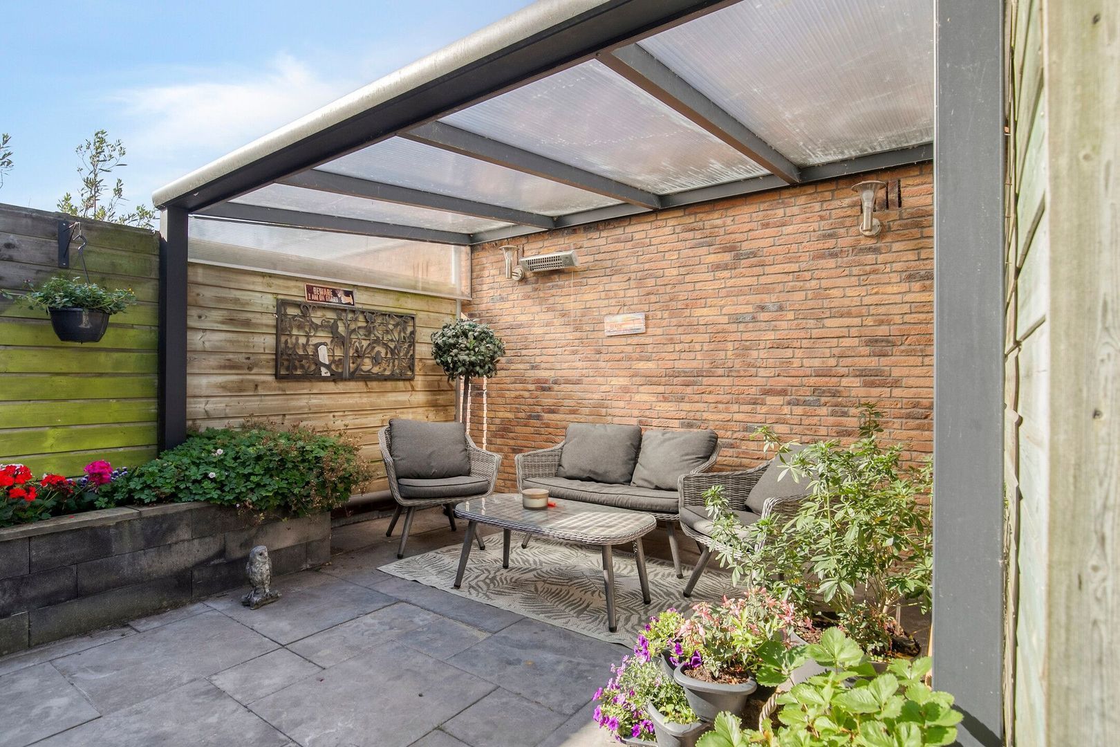 Deze zonnige tuin is op het zuiden gelegen en heeft diverse zitplekjes en plantenperken. Ook is er een elektrisch zonnescherm aanwezig. Achterin de tuin bevindt zich de berging en overkapping: ideale plek om tot in de late uurtjes buiten te vertoeven. Naast de berging kun je op eigen terrein een auto parkeren.