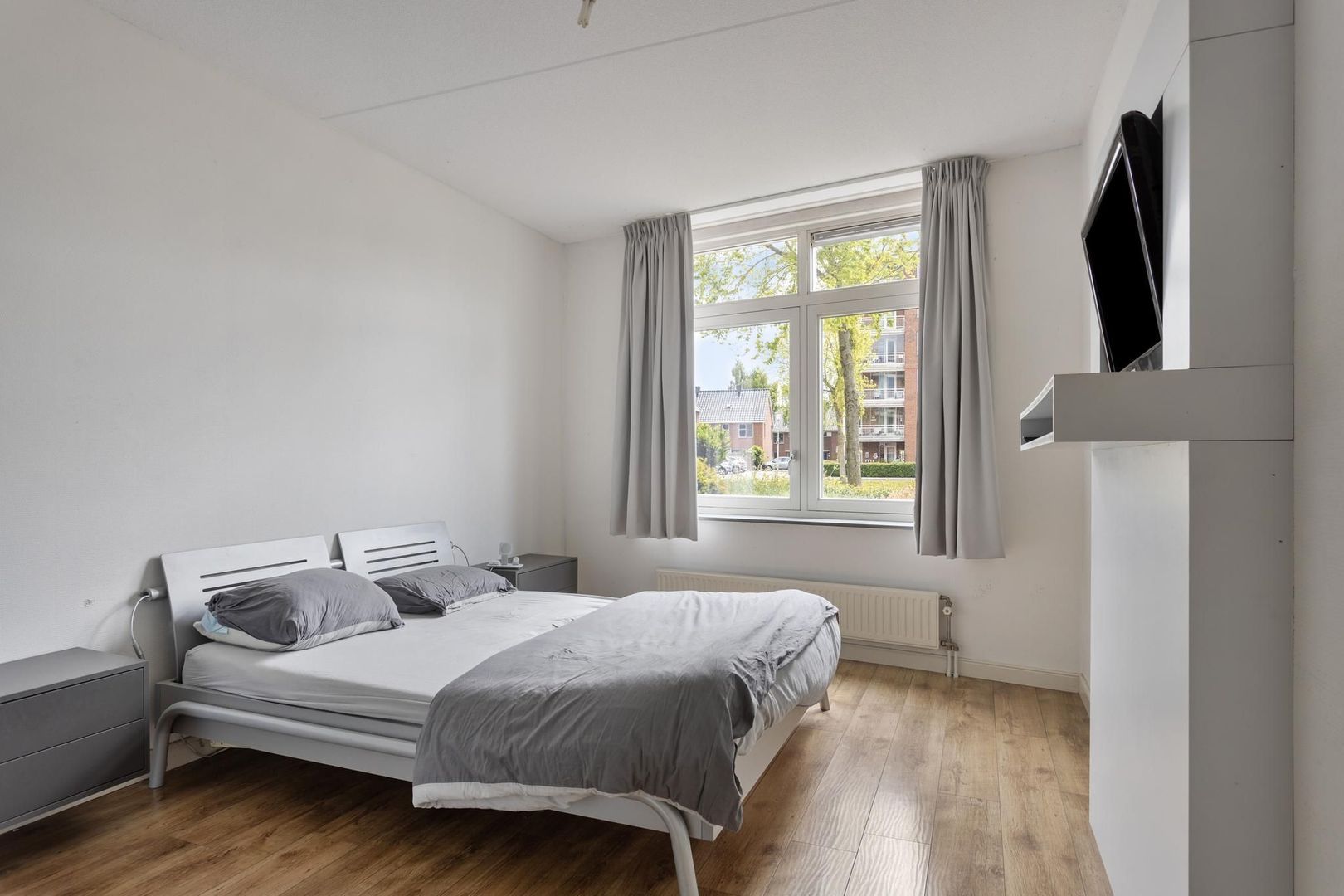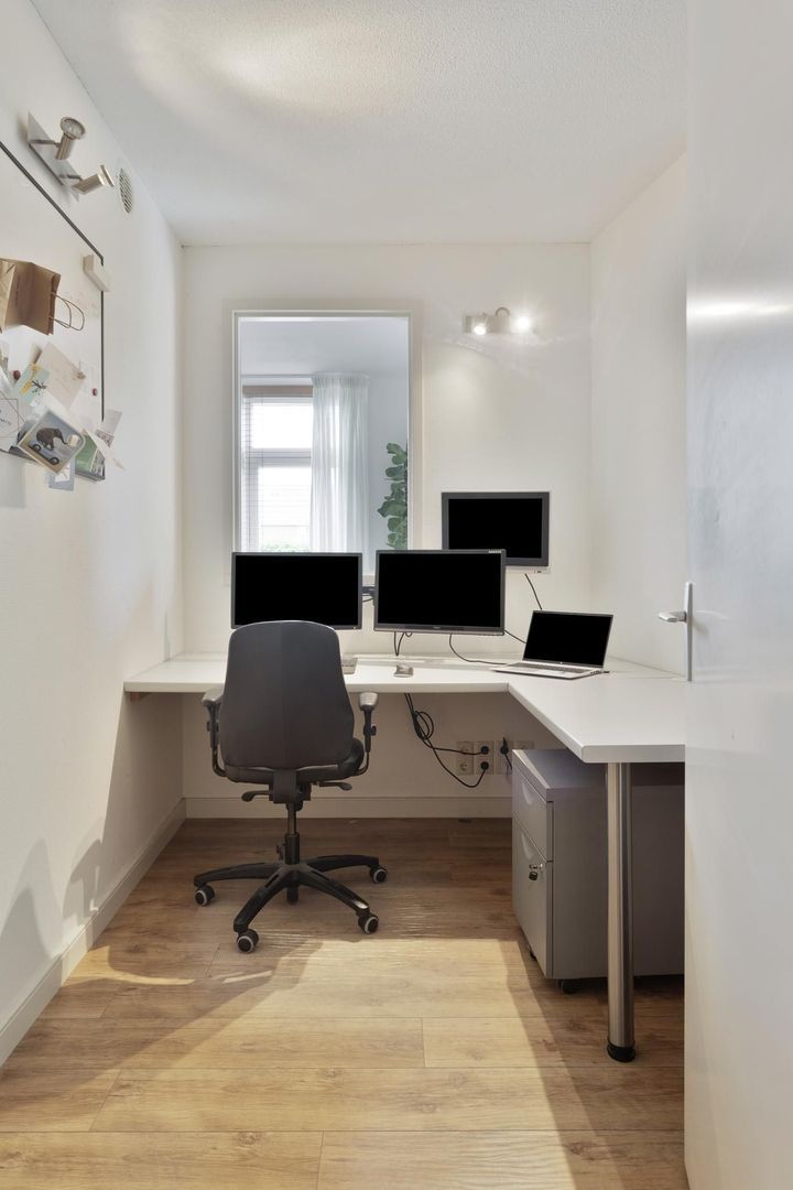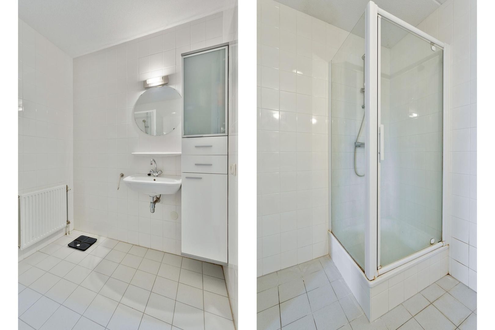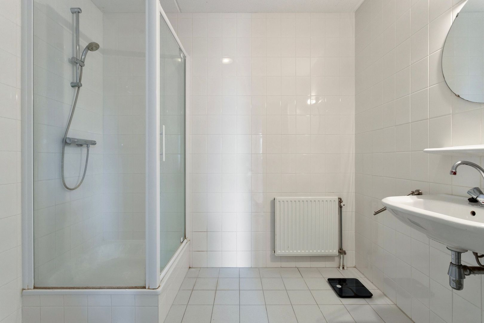 De ruime hoofdslaapkamer beschikt over praktische inbouwkasten. De tweede slaapkamer is momenteel in gebruik als werk- of studeerkamer. De volledig betegelde badkamer is netjes afgewerkt en ingericht met een inloopdouche en wastafel.