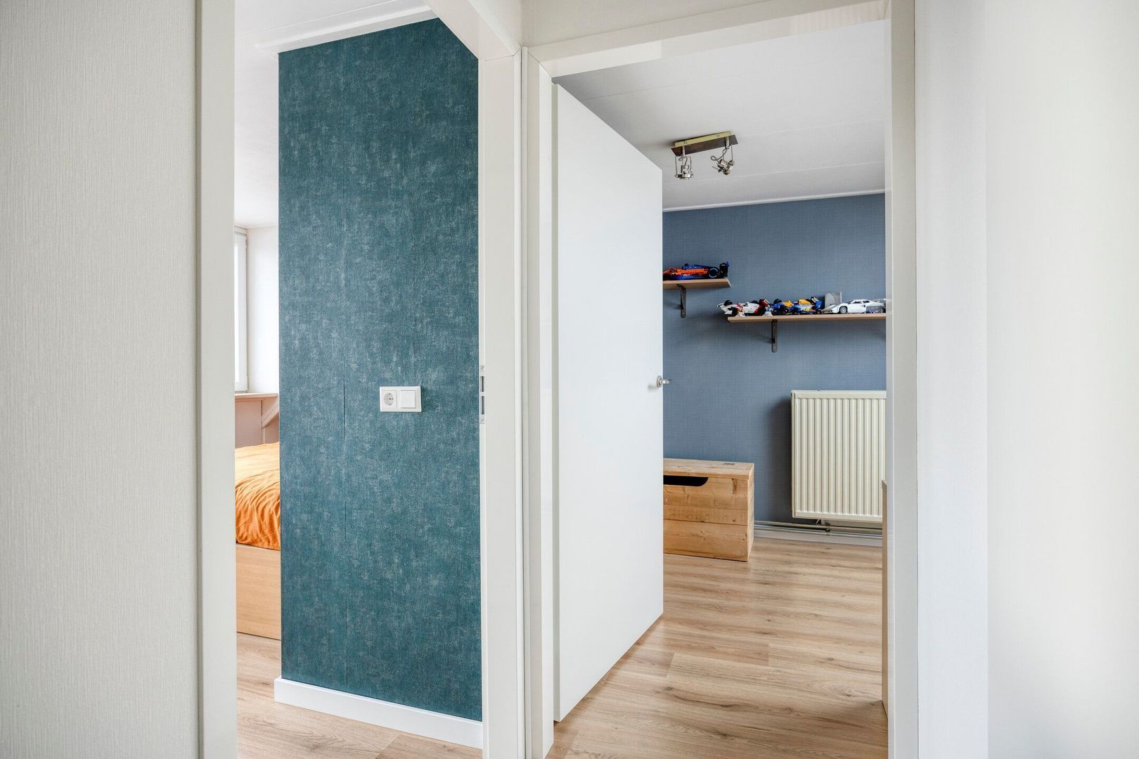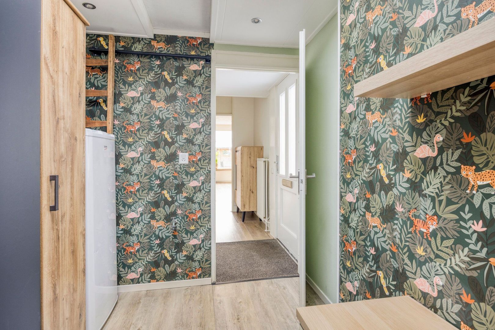 Overloop met berging waar zich de aansluitingen voor de wasmachine en droger bevinden, evenals de opstelling van de cv-ketel.