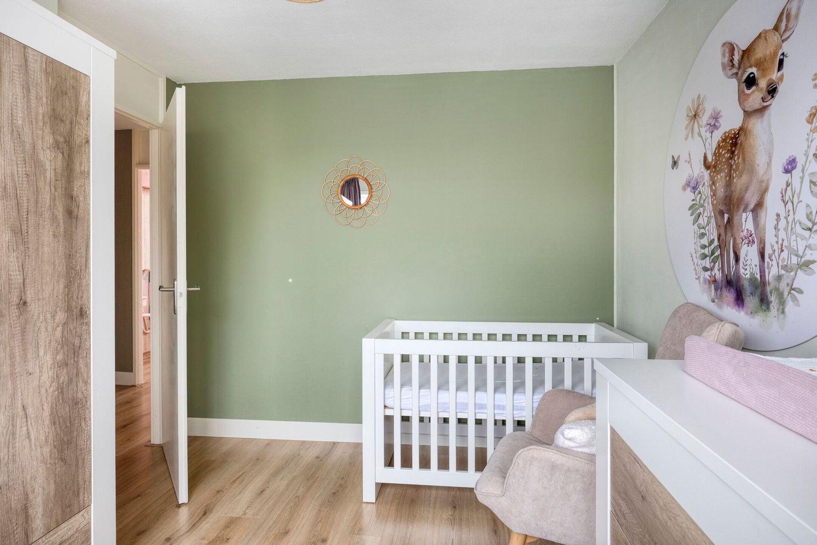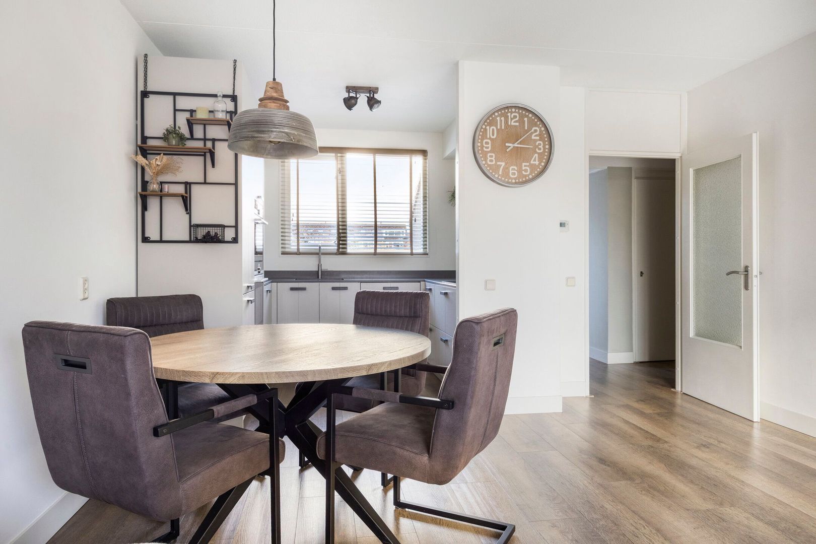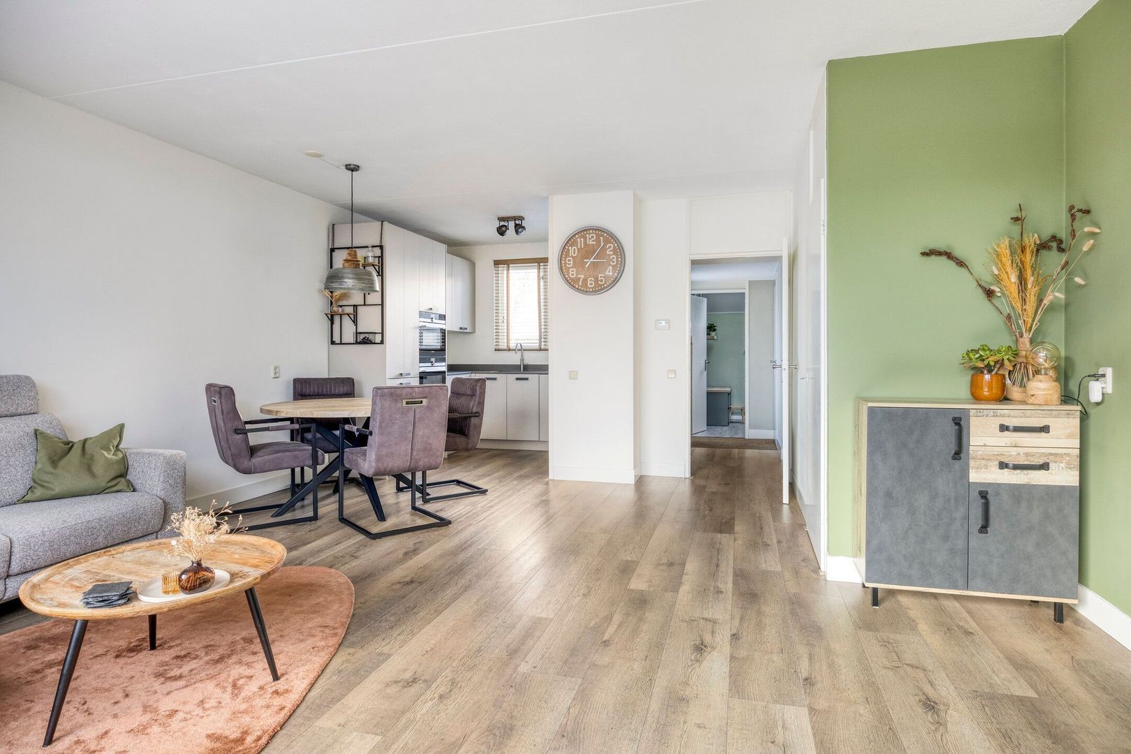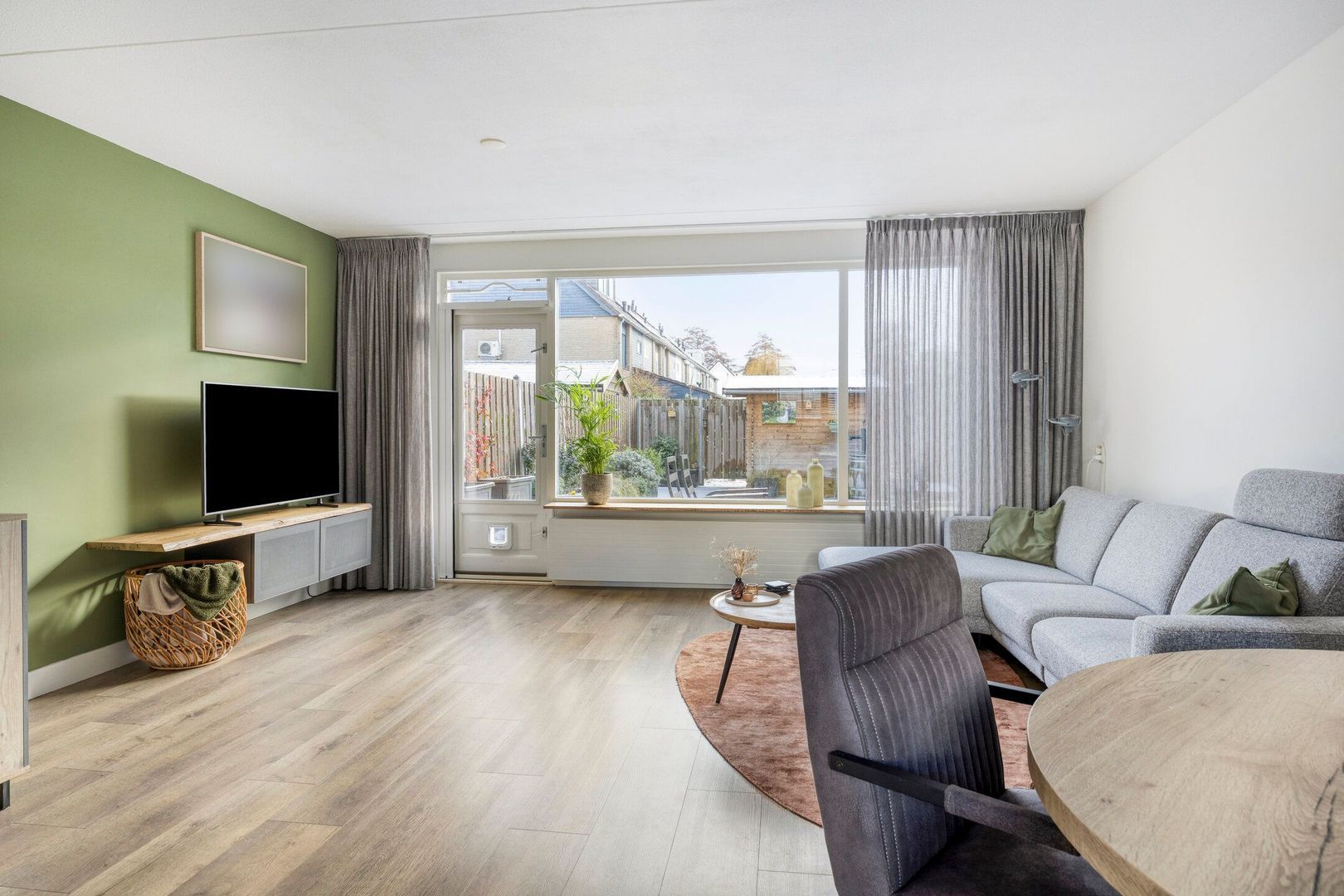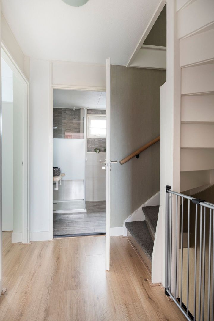 De ruime, tuingerichte woonkamer is heerlijk licht dankzij de grote raampartijen aan de achterzijde. De woonkamer is afgewerkt met een fraaie laminaatvloer en beschikt over een praktische trapkast.