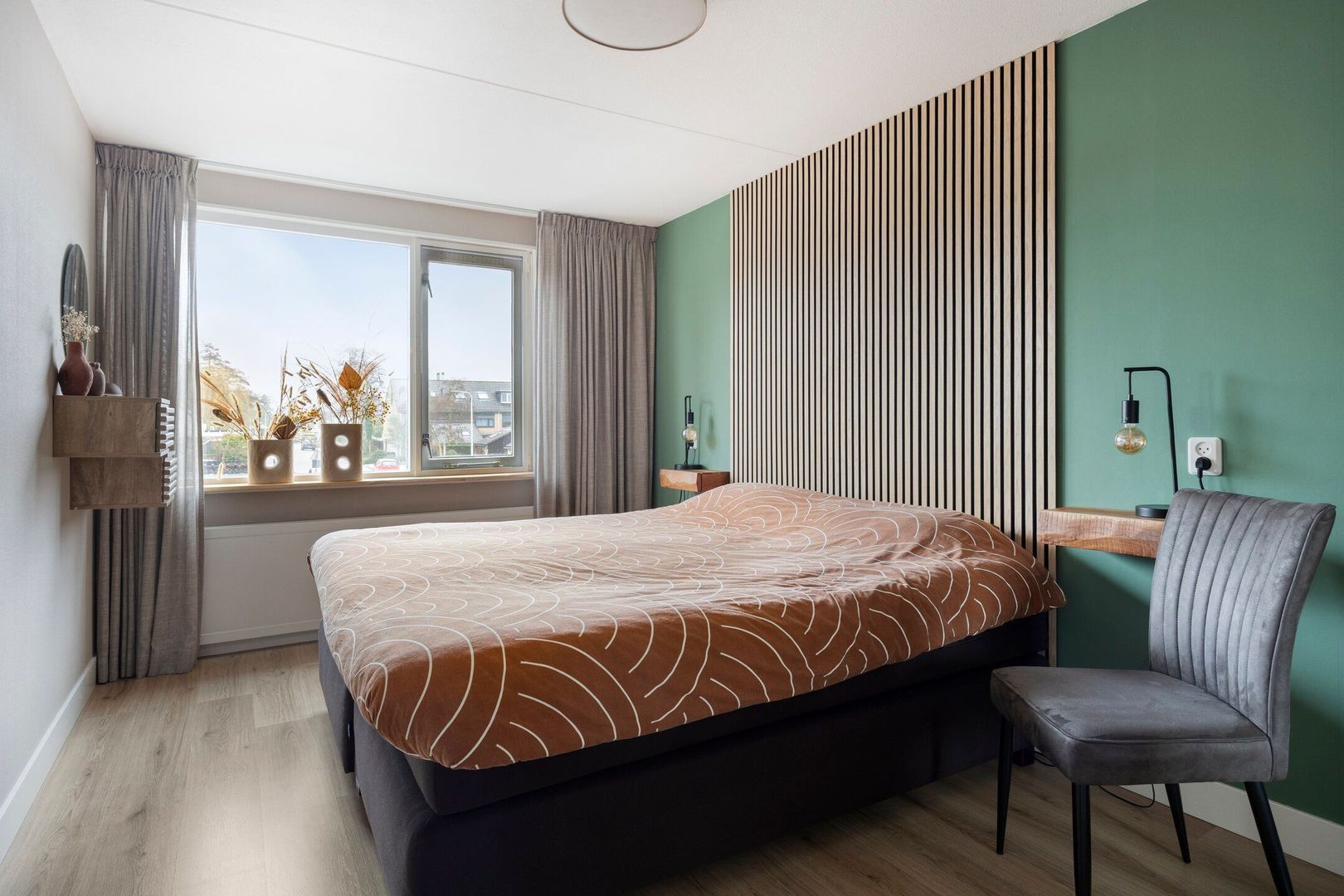 Op de eerste verdieping bevinden zich aan de achterzijde de ruime ouderslaapkamer en slaapkamer 2. Beide kamers zijn voorzien van elektrische rolluiken, eveneens bedienbaar via de app. Slaapkamer 3 ligt aan de voorzijde van de woning.