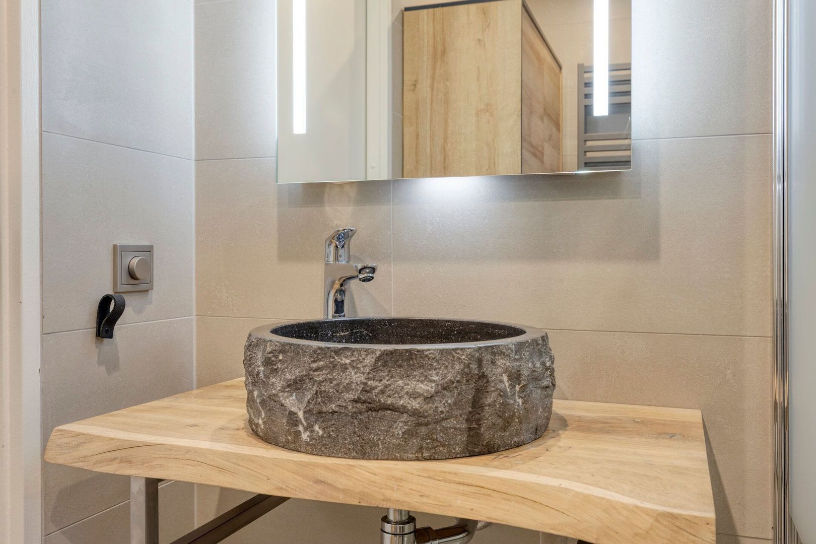 De badkamer is modern uitgevoerd en beschikt over een wastafelmeubel met verlichte spiegel, douche, toilet en handdoekradiator.