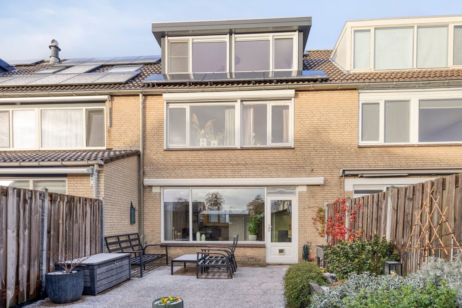 Vanuit de woonkamer is er toegang tot de diepe zonnige tuin, welke gelegen is op het zuiden. De tuin is verzorgd aangelegd met een prettige combinatie van bestrating en groene beplanting, wat zorgt voor zowel sfeer als privacy. Dankzij de gunstige ligging kun je hier vrijwel de hele dag van de zon genieten. Voor extra comfort is er een elektrisch zonnescherm aanwezig, eenvoudig te bedienen via een app.