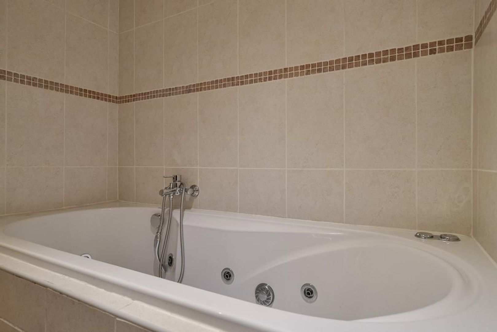 De badkamer is volledig betegeld en voorzien van een ligbad met whirlpool functie, inloopdouche, wastafel met meubel, handdoekradiator, twee opbergkasten en kastruimte achter de spiegels.