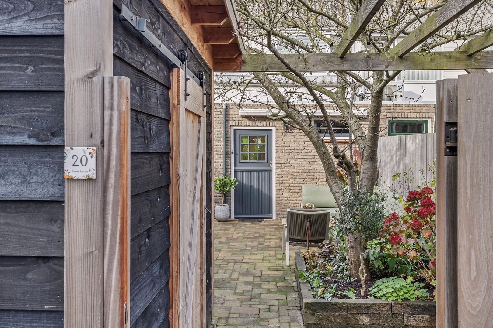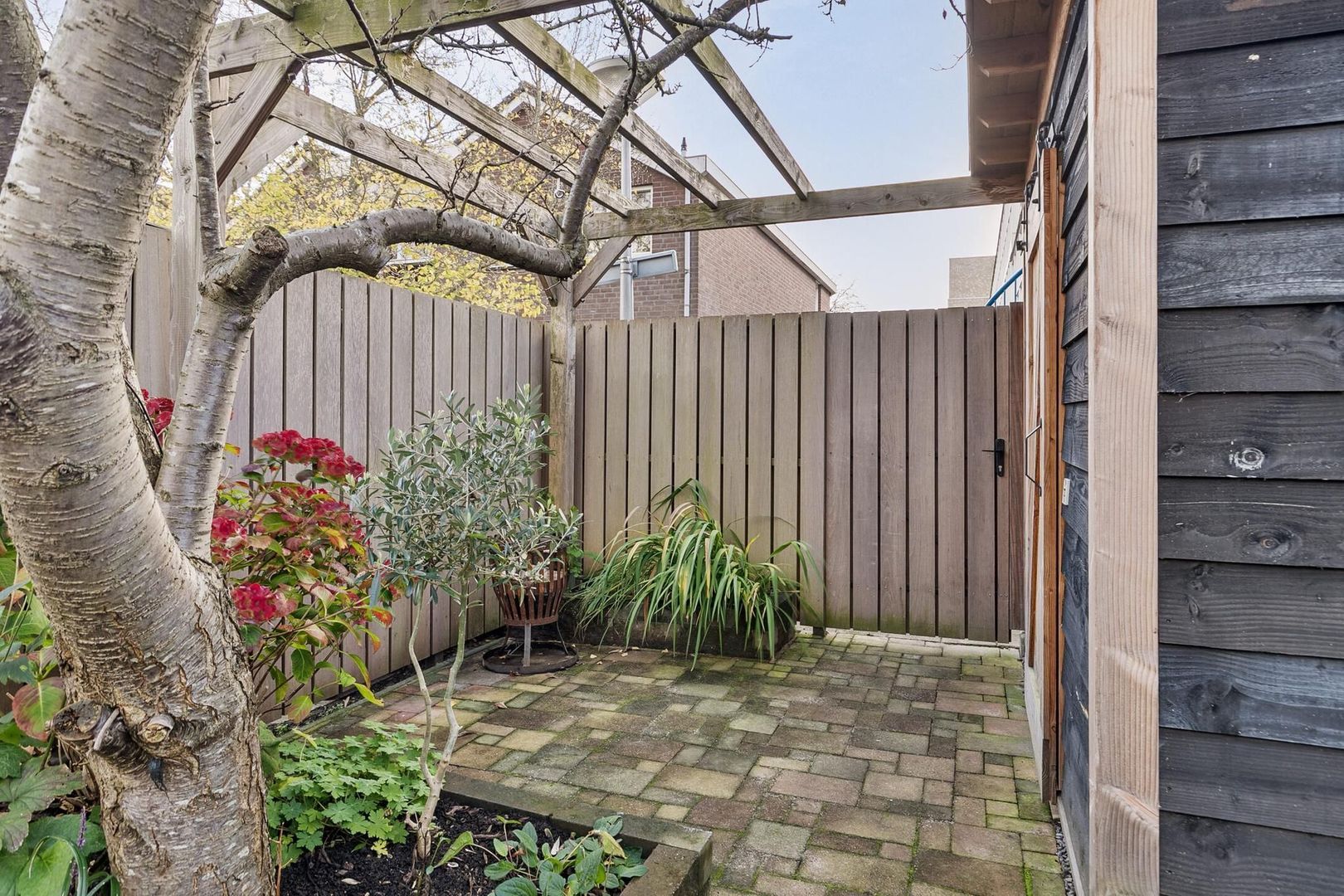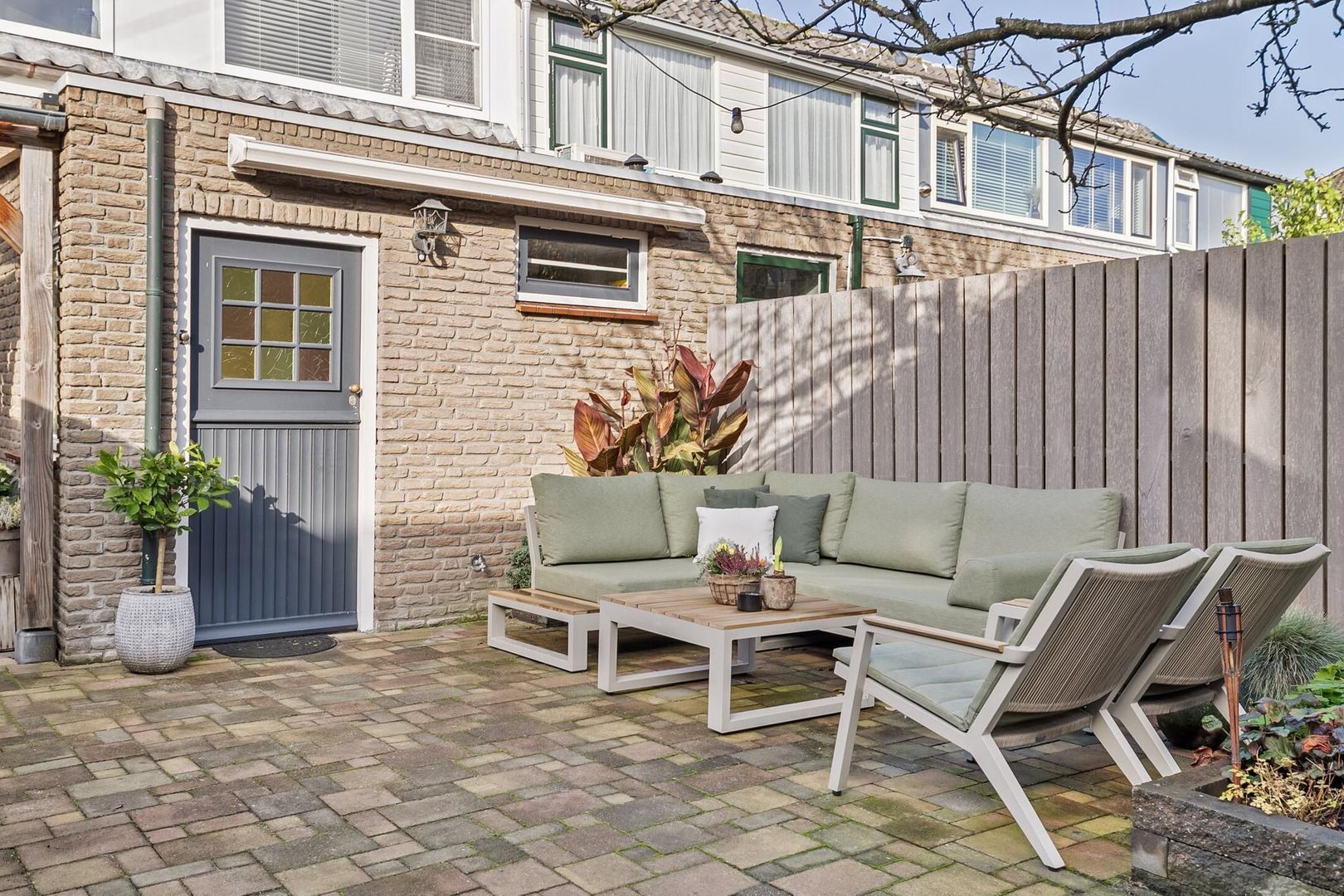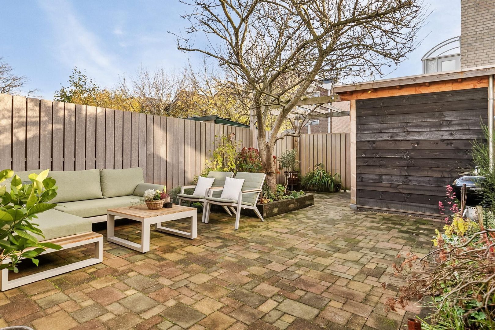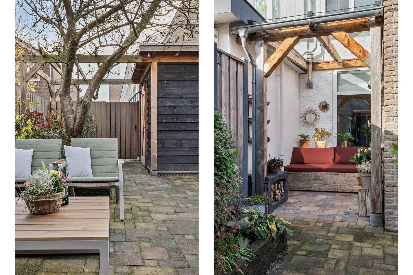 De fijne, zonnige achtertuin is gelegen op het zuidoosten, aan de woning is een gezellige loungehoek gecreëerd onder de overkapping waar je al vroeg in het voorjaar heerlijk kunt genieten in de zon. In de achtertuin staat een pruimenboom met prachtige bloesem in het voorjaar en zorgt in de zomer voor verkoeling. De houten berging biedt ruimte voor het stallen van fietsen en het opbergen van tuingereedschap.