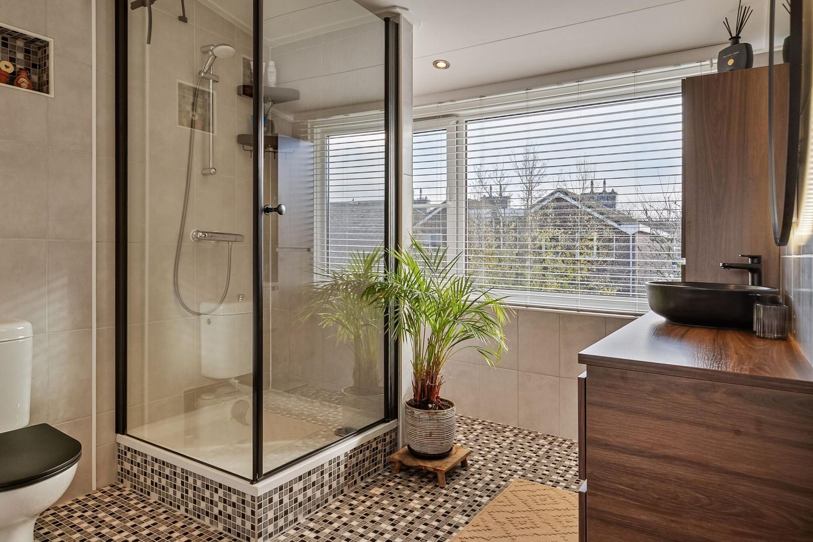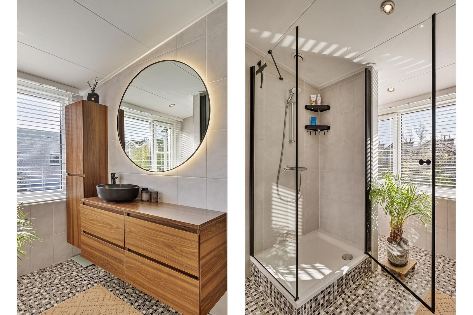 De fraaie lichte ruime badkamer welke is voorzien van een douchecabine, Sanibroyeur toilet, wastafel met meubel, handdoekradiator, verwarmde spiegel en handdoeken kast.