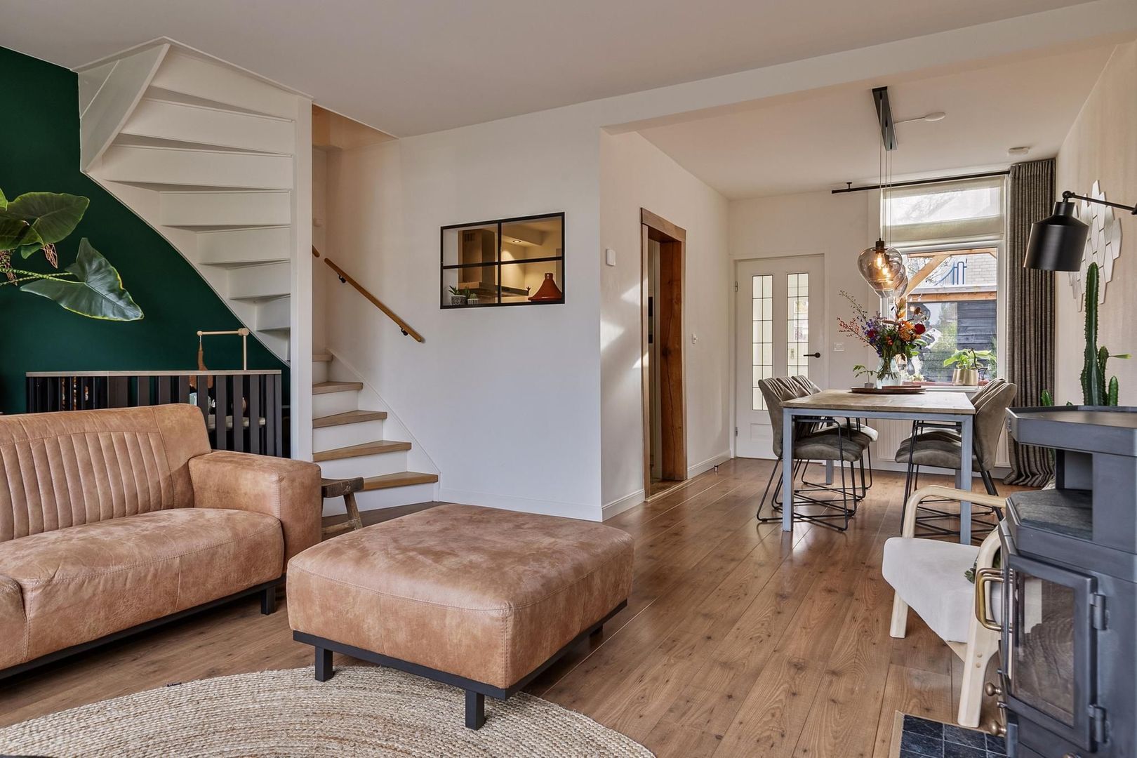 De woonkamer geeft toegang via de trap naar de 1e verdieping.