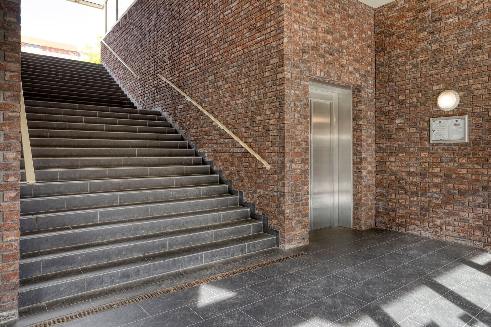 Entree met trapopgang naar de woonverdieping, ruime hal met meterkast en kastenwand.