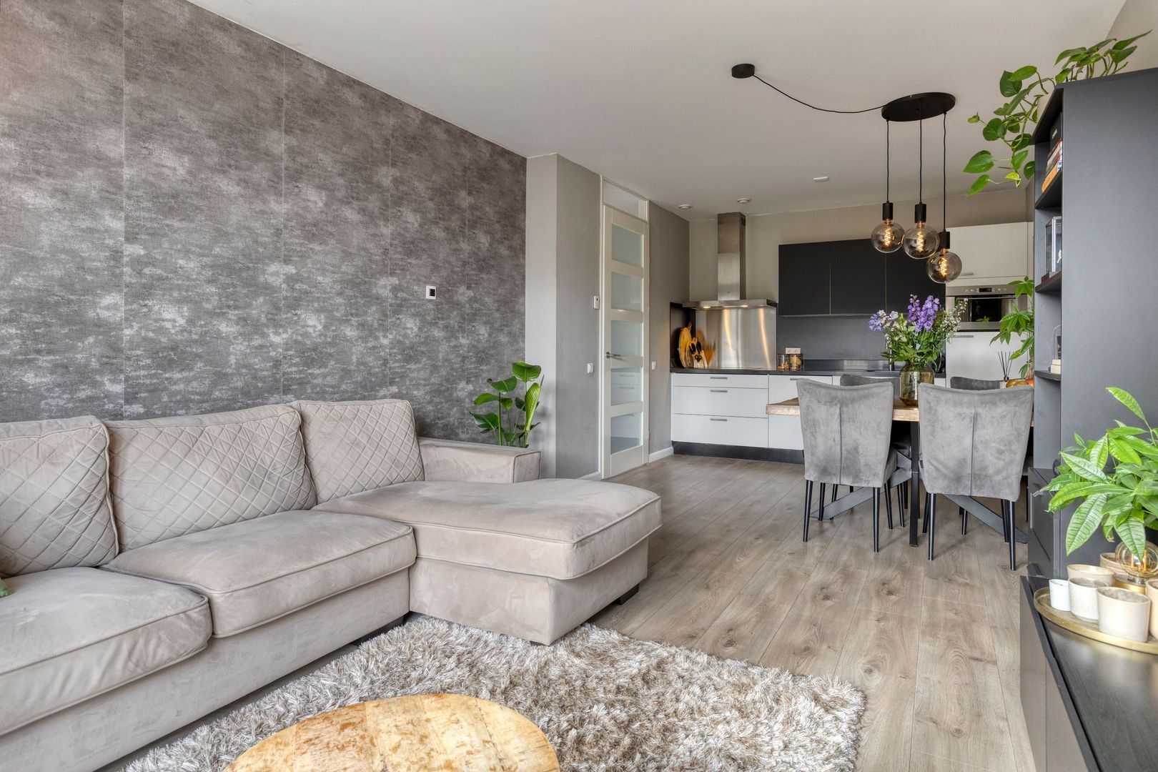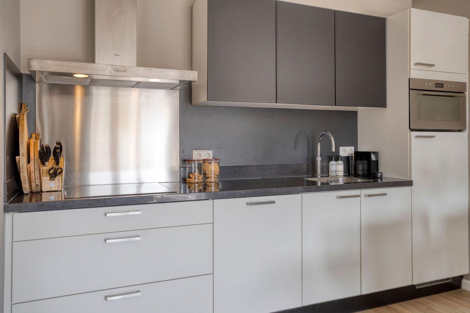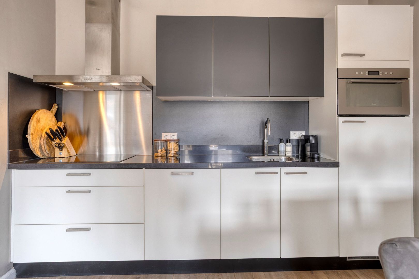 Het gehele appartement is voorzien van een kwalitatief mooie laminaatvloer, glasvliesbehang wanden en door de vele raampartijen is er veel daglichttoetreding. De woonkamer met open keuken (ca. 7.55 x 3.50m) heeft openslaande deuren naar het balkon. De open keuken is modern afgewerkt en voorzien van alle gemakken. Koken doet u hier op een inductie kookplaat en verder beschikt deze over een koelkast met vriesvak, vaatwasser en combioven maken het geheel af.