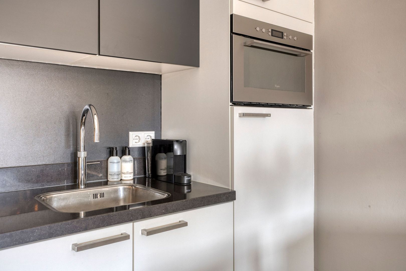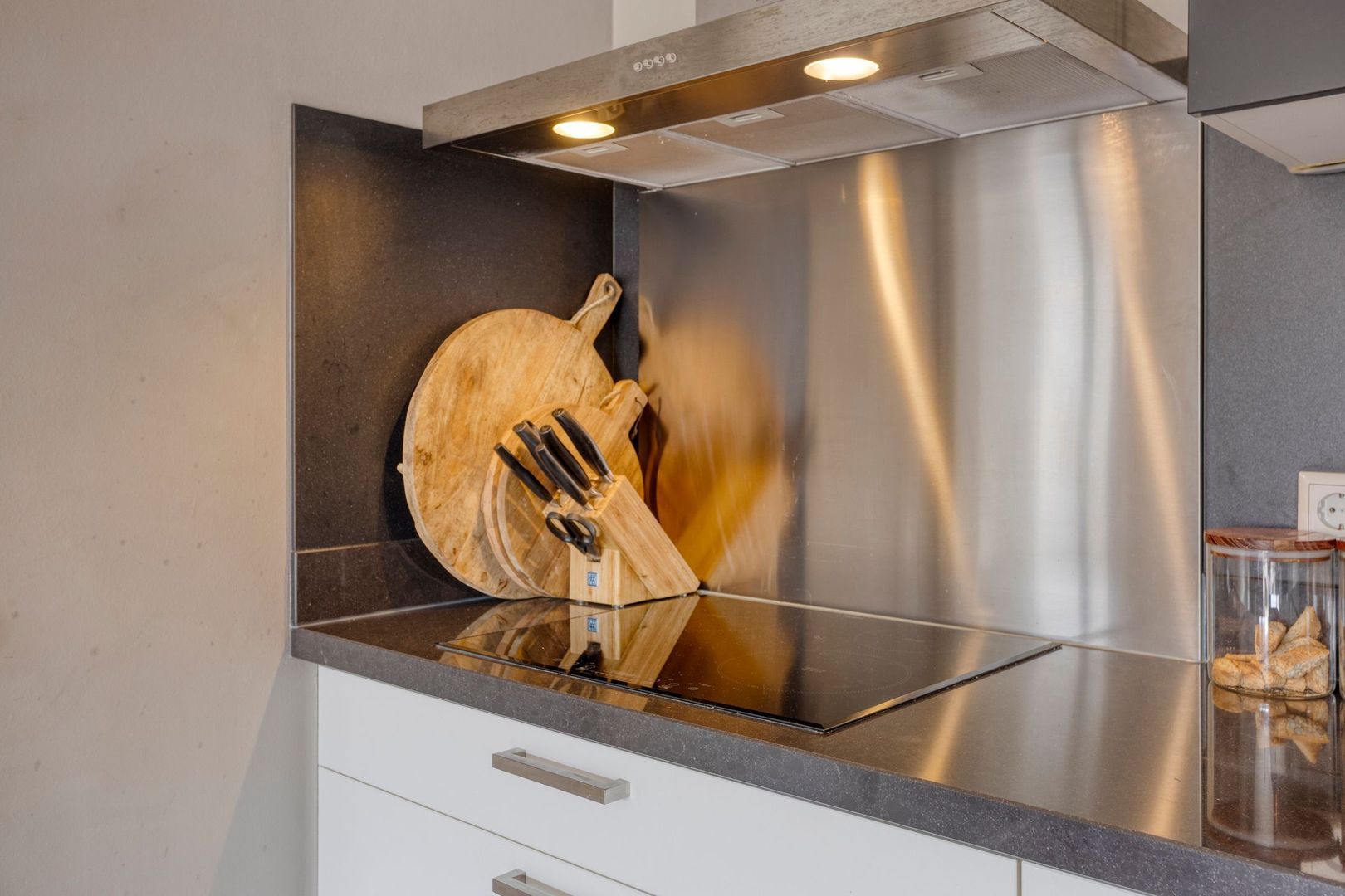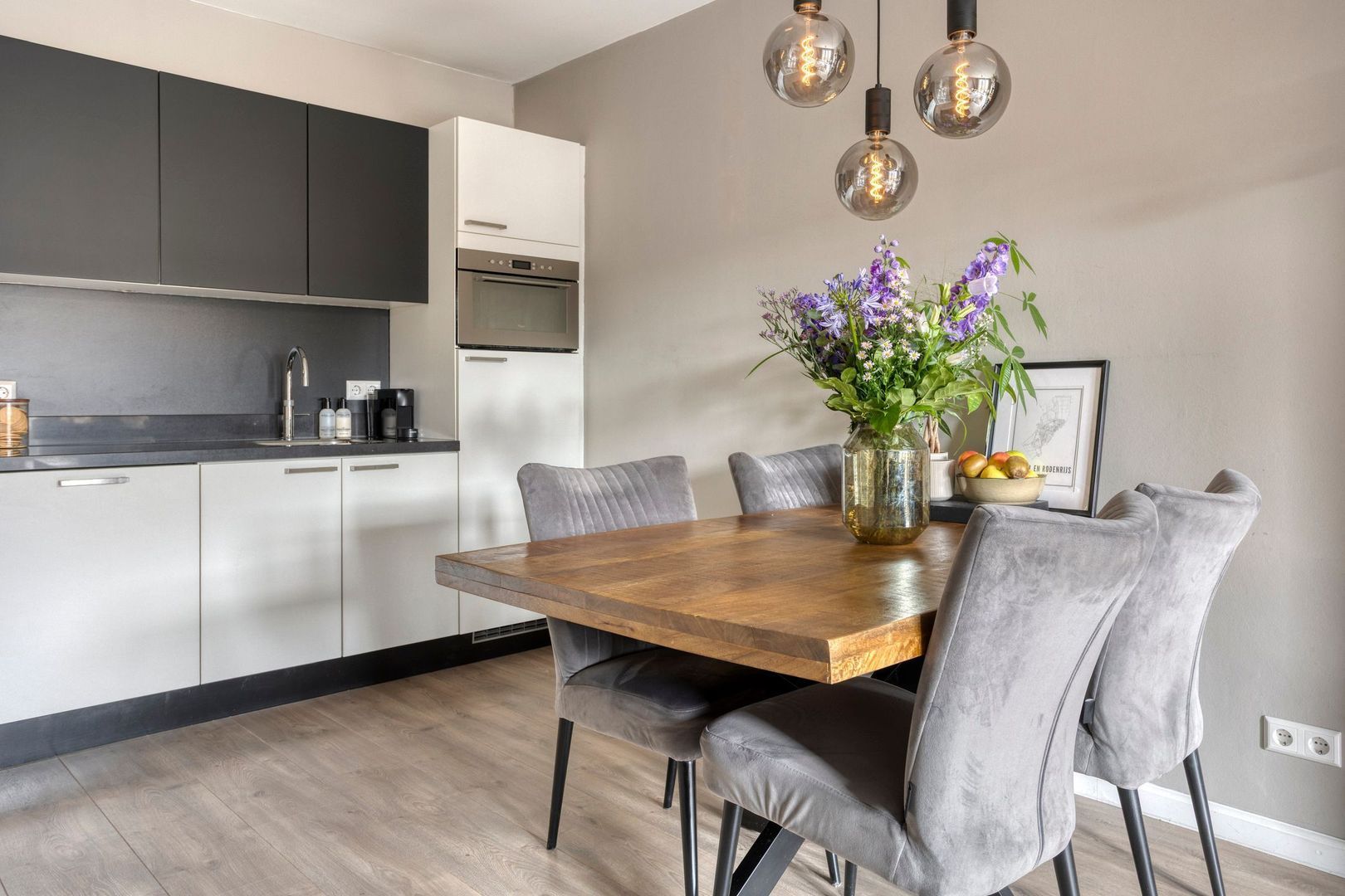 Het gehele appartement is voorzien van een kwalitatief mooie laminaatvloer, glasvliesbehang wanden en door de vele raampartijen is er veel daglichttoetreding. De woonkamer met open keuken (ca. 7.55 x 3.50m) heeft openslaande deuren naar het balkon. De open keuken is modern afgewerkt en voorzien van alle gemakken. Koken doet u hier op een inductie kookplaat en verder beschikt deze over een koelkast met vriesvak, vaatwasser en combioven maken het geheel af.