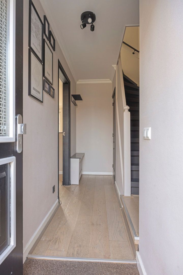 Entree, hal met toilet, trapopgang naar de eerste verdieping, trapkast met meterkast en toegang tot de woonkamer.