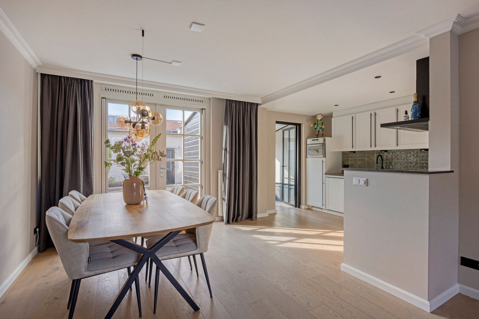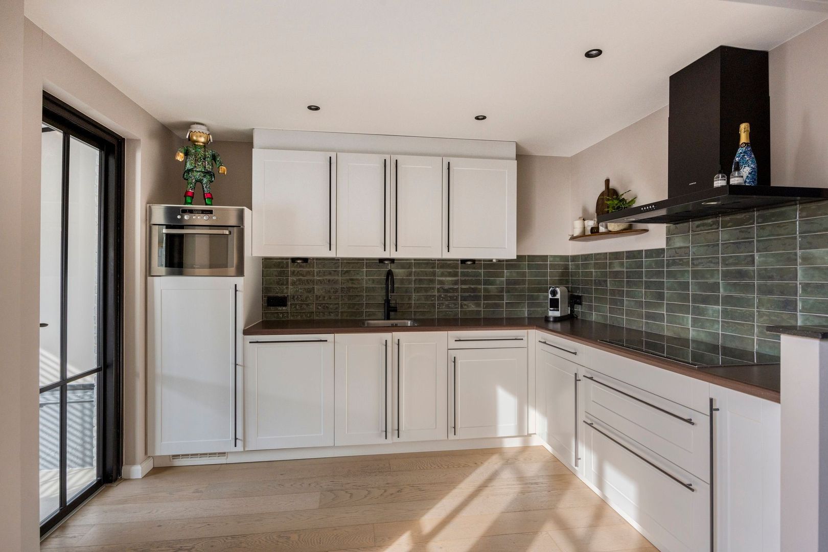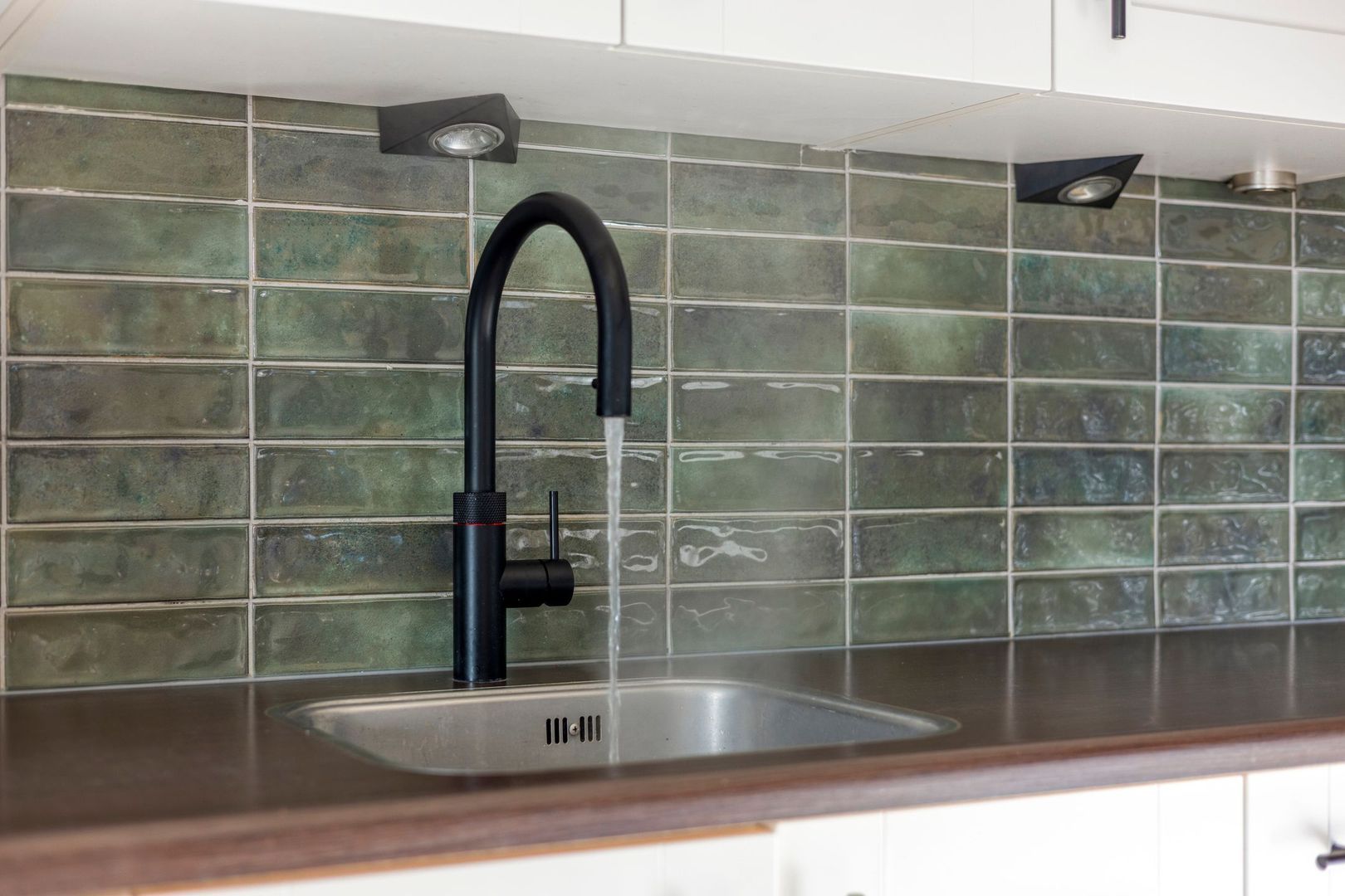 De keuken is uitgevoerd in een praktische L-opstelling en voorzien van diverse inbouwapparatuur, waaronder een vaatwasser, inductiekookplaat, afzuigkap, koelkast met vriesvak, combi-oven, spoelbak met mengkraan en een Quooker.