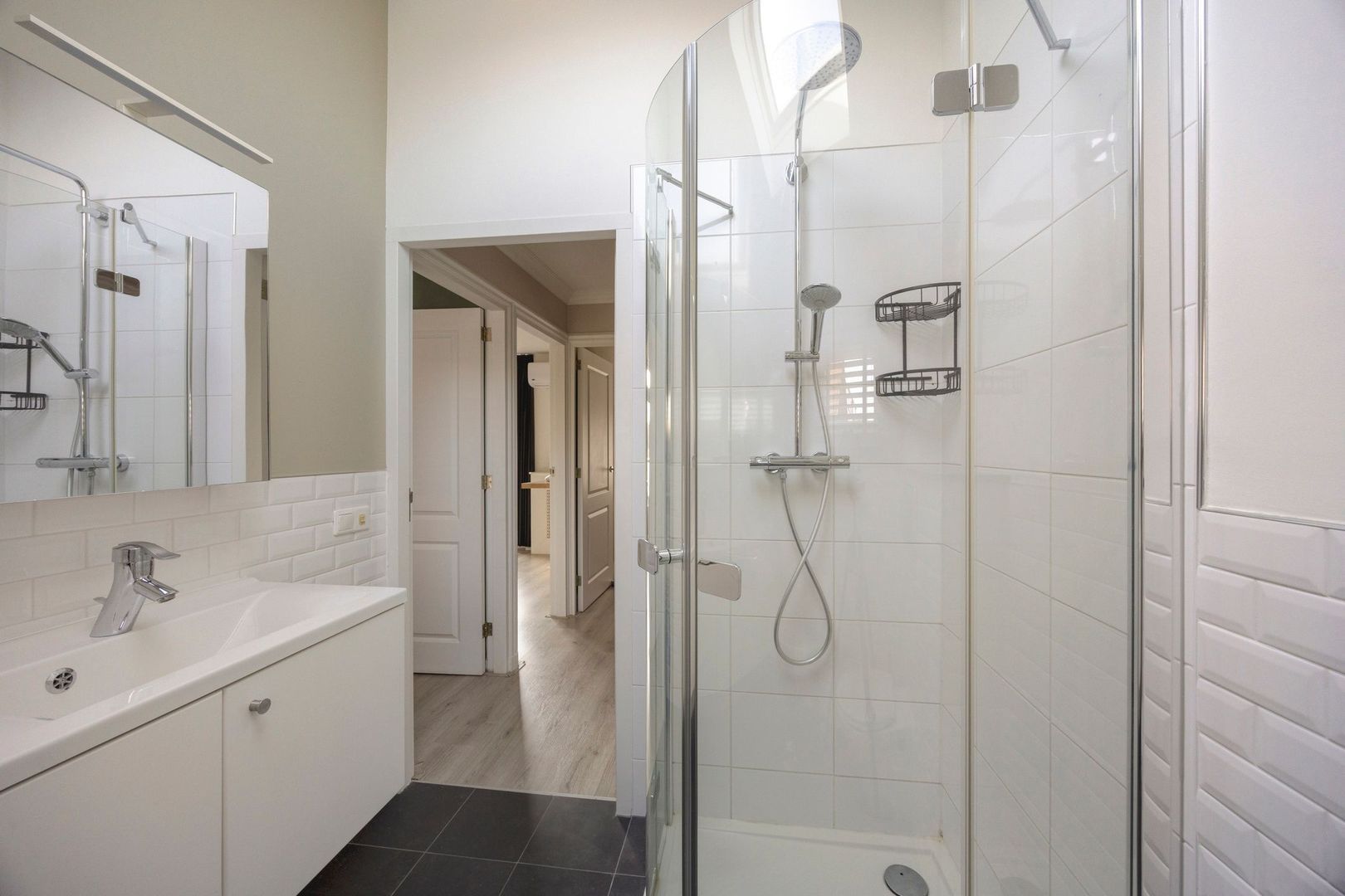 De badkamer is voorzien van een douche, dubbele wastafel, spiegel met verlichting en een toilet.