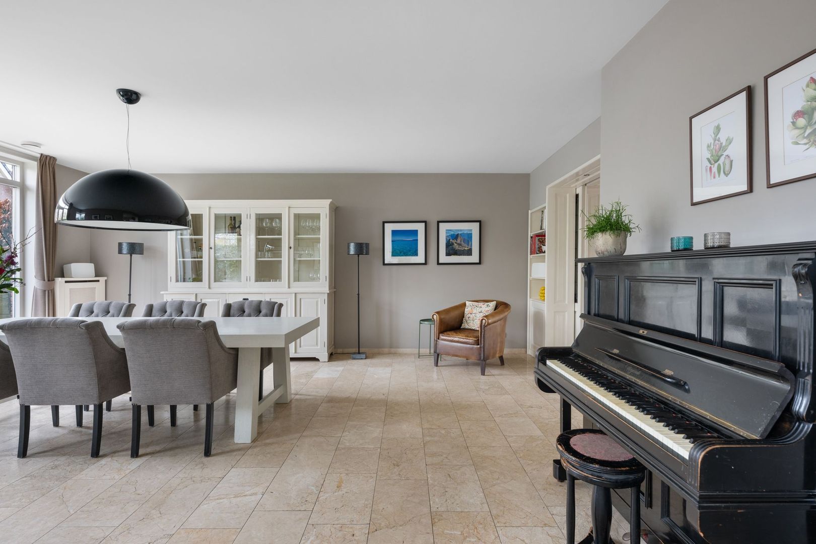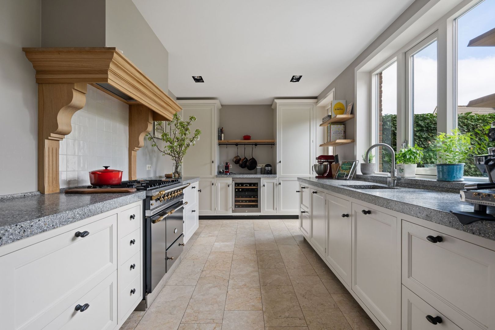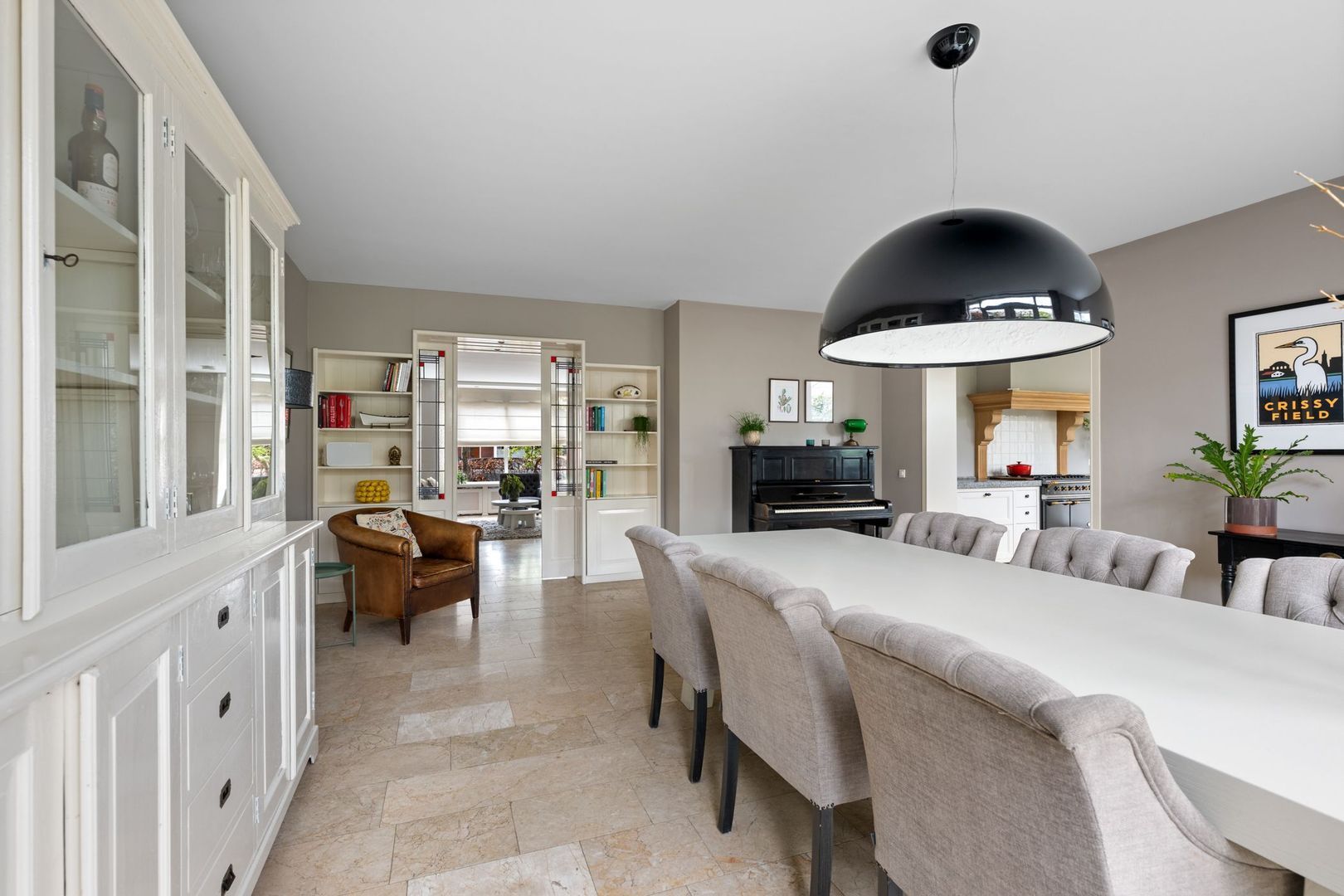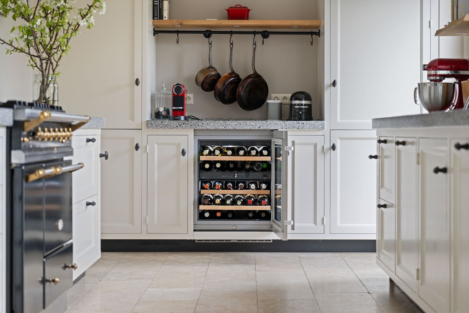 De sfeervolle woonkamer is licht en ruim opgezet. Het zitgedeelte, met een speelse erker, bevindt zich aan de voorzijde. Via en-suite deuren is de woonkamer verbonden met de eetkamer. De keuken is een waar paradijs voor kookliefhebbers, met het La Canche fornuis als stralend middelpunt. Dit fornuis bevat zowel een oven als een garingsoven. Verder is de keuken uitgerust met een koel-vriescombinatie, afzuigkap, Quooker, vaatwasser en een wijnkoelkast.