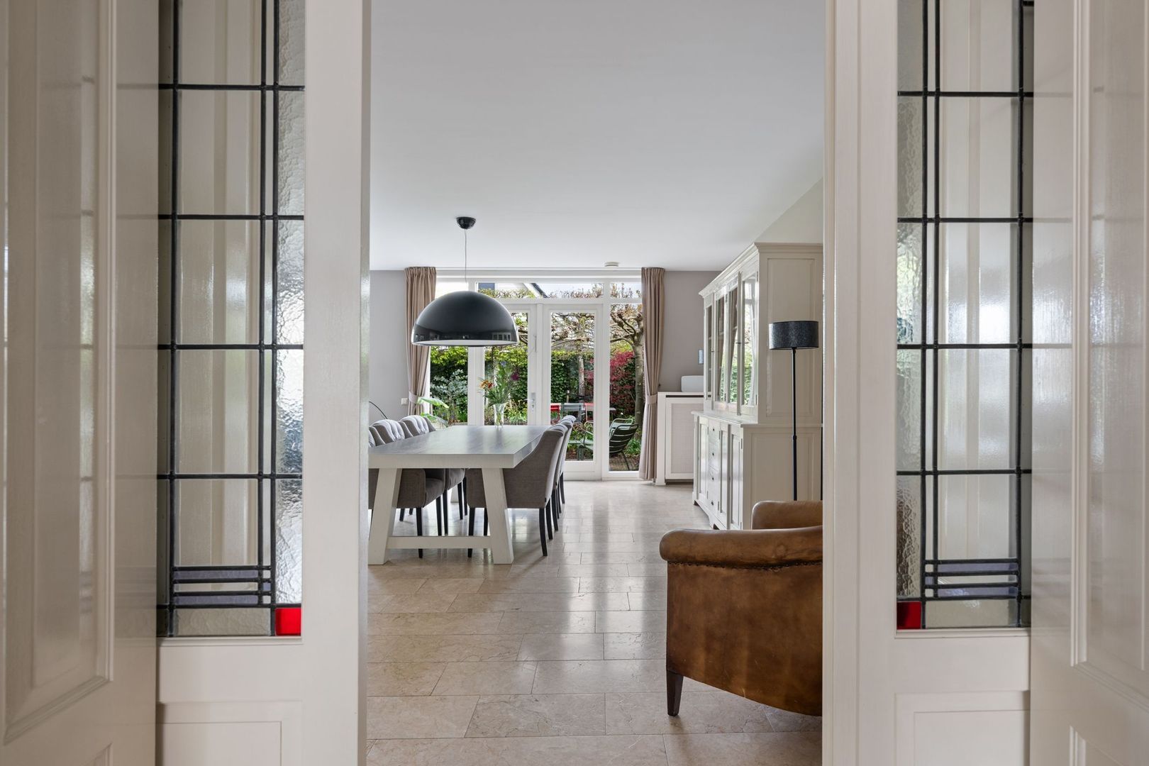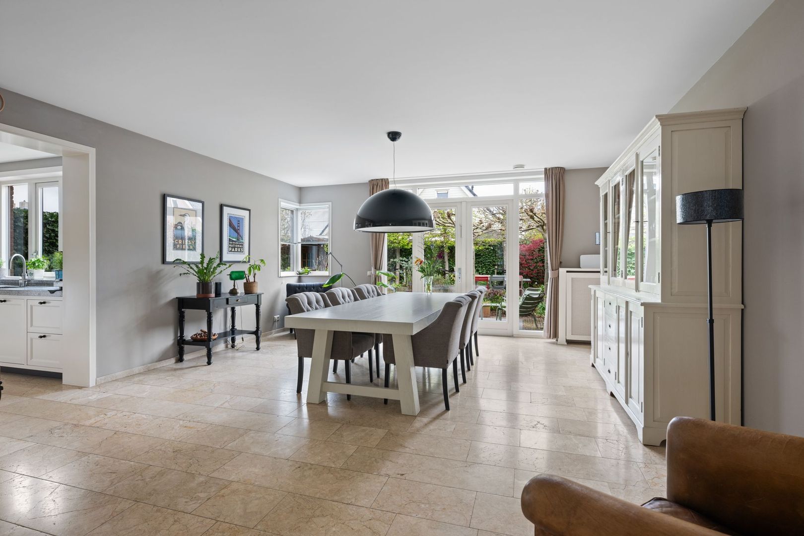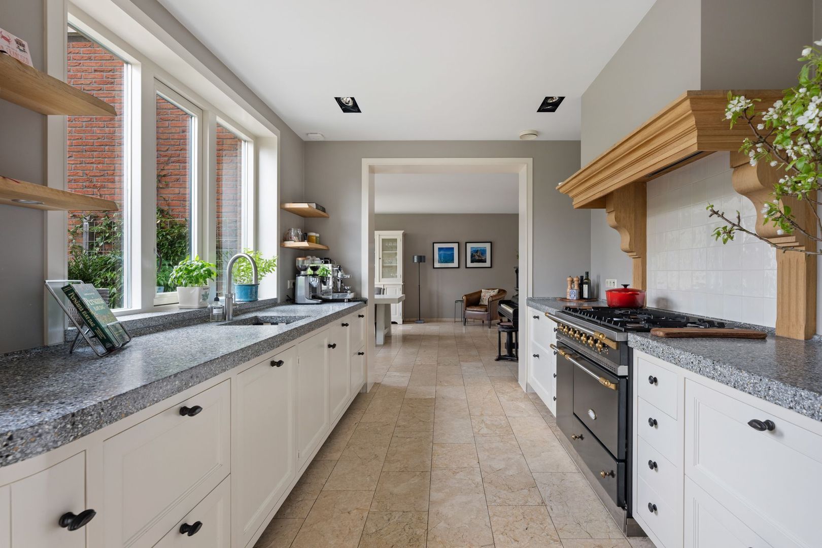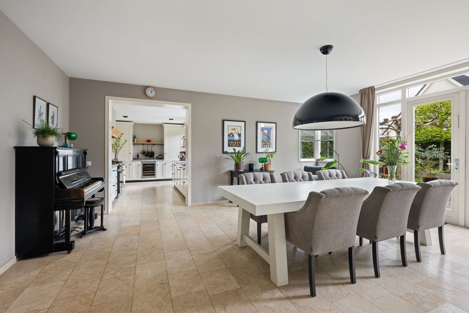 De sfeervolle woonkamer is licht en ruim opgezet. Het zitgedeelte, met een speelse erker, bevindt zich aan de voorzijde. Via en-suite deuren is de woonkamer verbonden met de eetkamer. De keuken is een waar paradijs voor kookliefhebbers, met het La Canche fornuis als stralend middelpunt. Dit fornuis bevat zowel een oven als een garingsoven. Verder is de keuken uitgerust met een koel-vriescombinatie, afzuigkap, Quooker, vaatwasser en een wijnkoelkast.