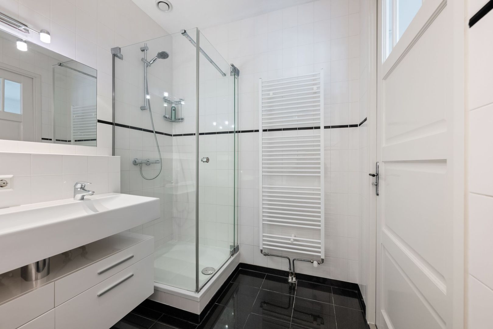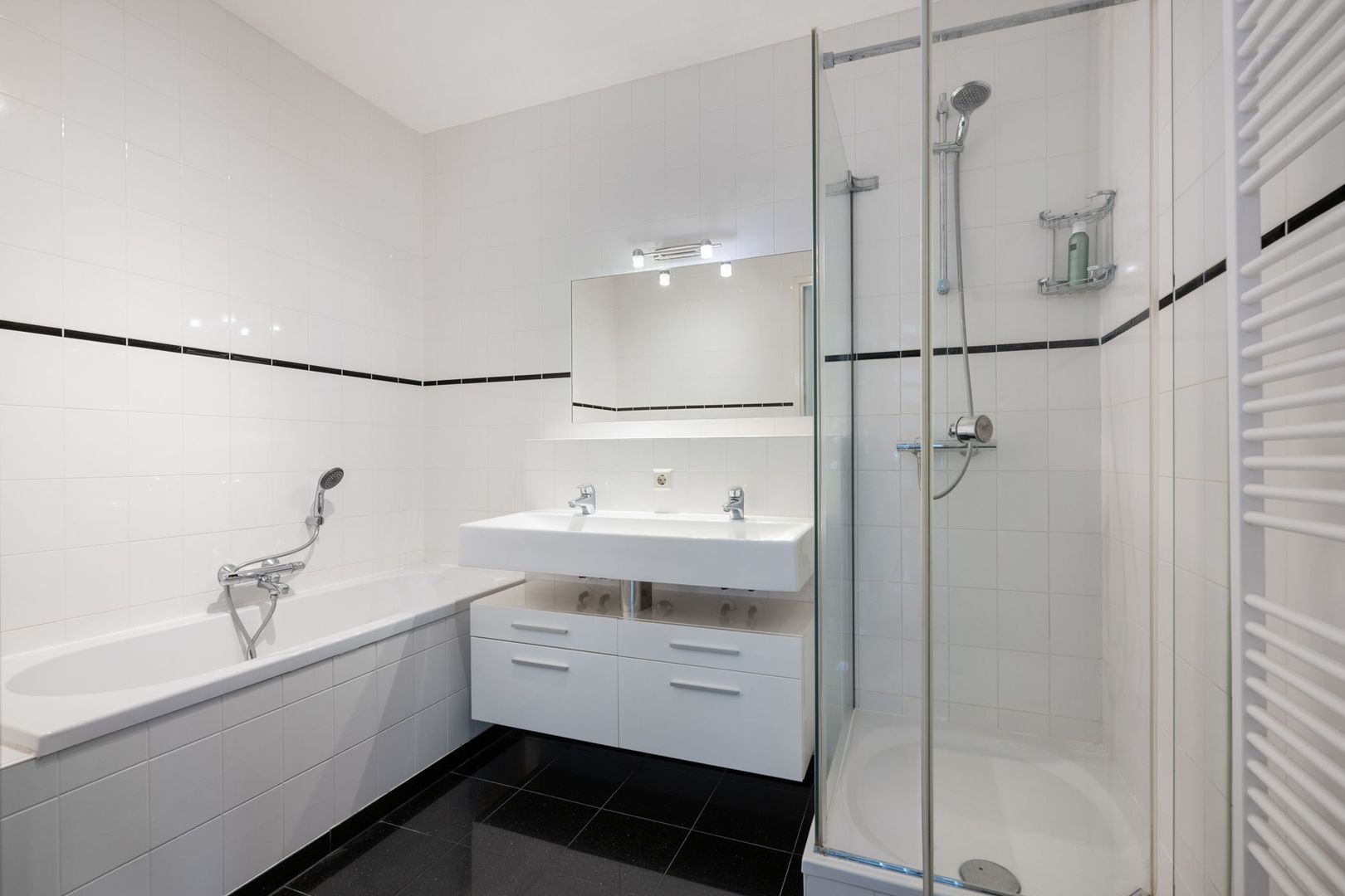 De badkamer is uitgerust met een ligbad, douche, een dubbele wastafel en een handdoekradiator.
