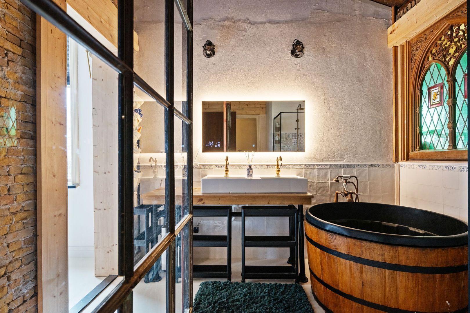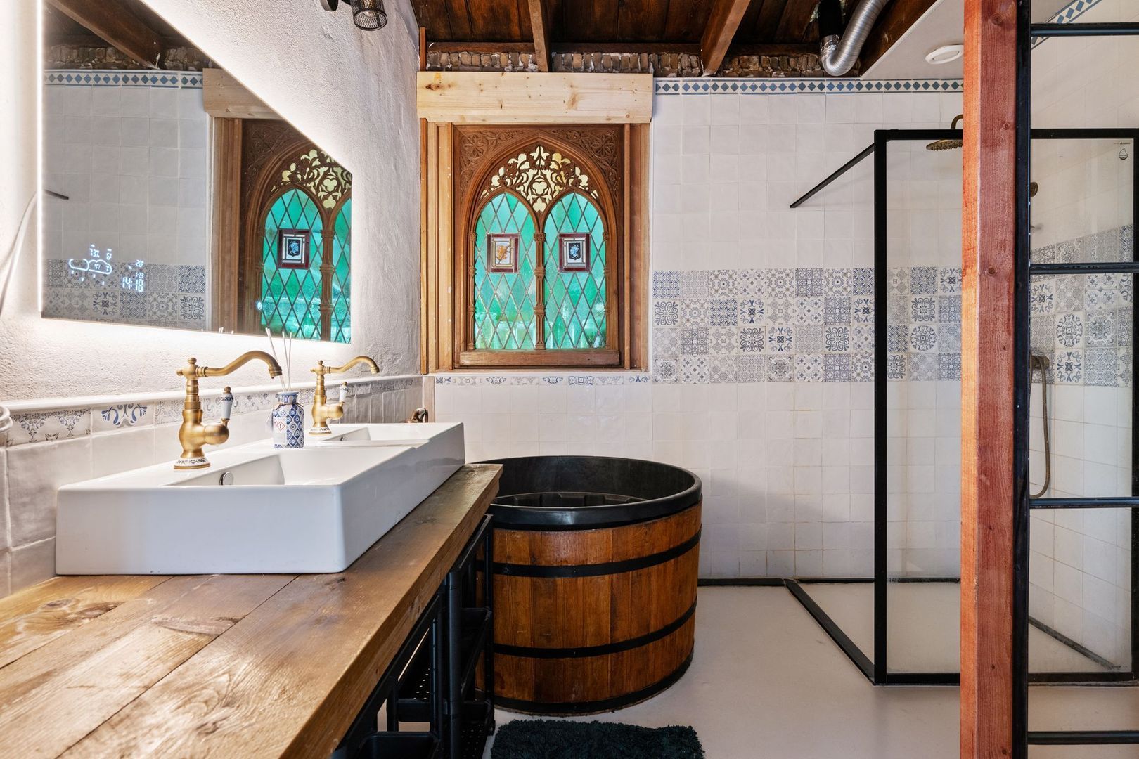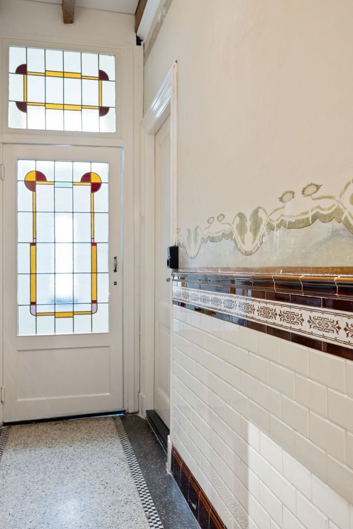 De huidige slaapkamer op de begane grond beschikt over een en-suite badkamer met dubbele wastafel, inloopdouche, ligbad en toegang tot de kelder met wasmachine- en drogeraansluiting. De originele natuurstenen schouw en het glas-in-loodraam geven deze ruimte een bijzonder karakter.