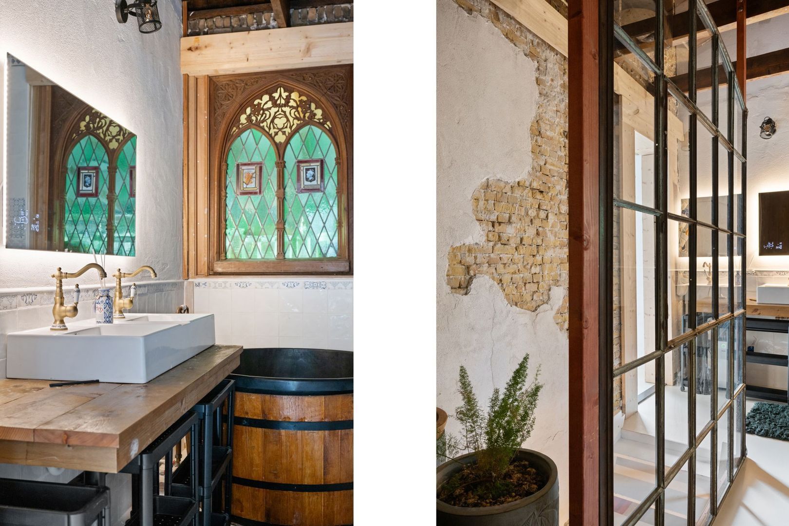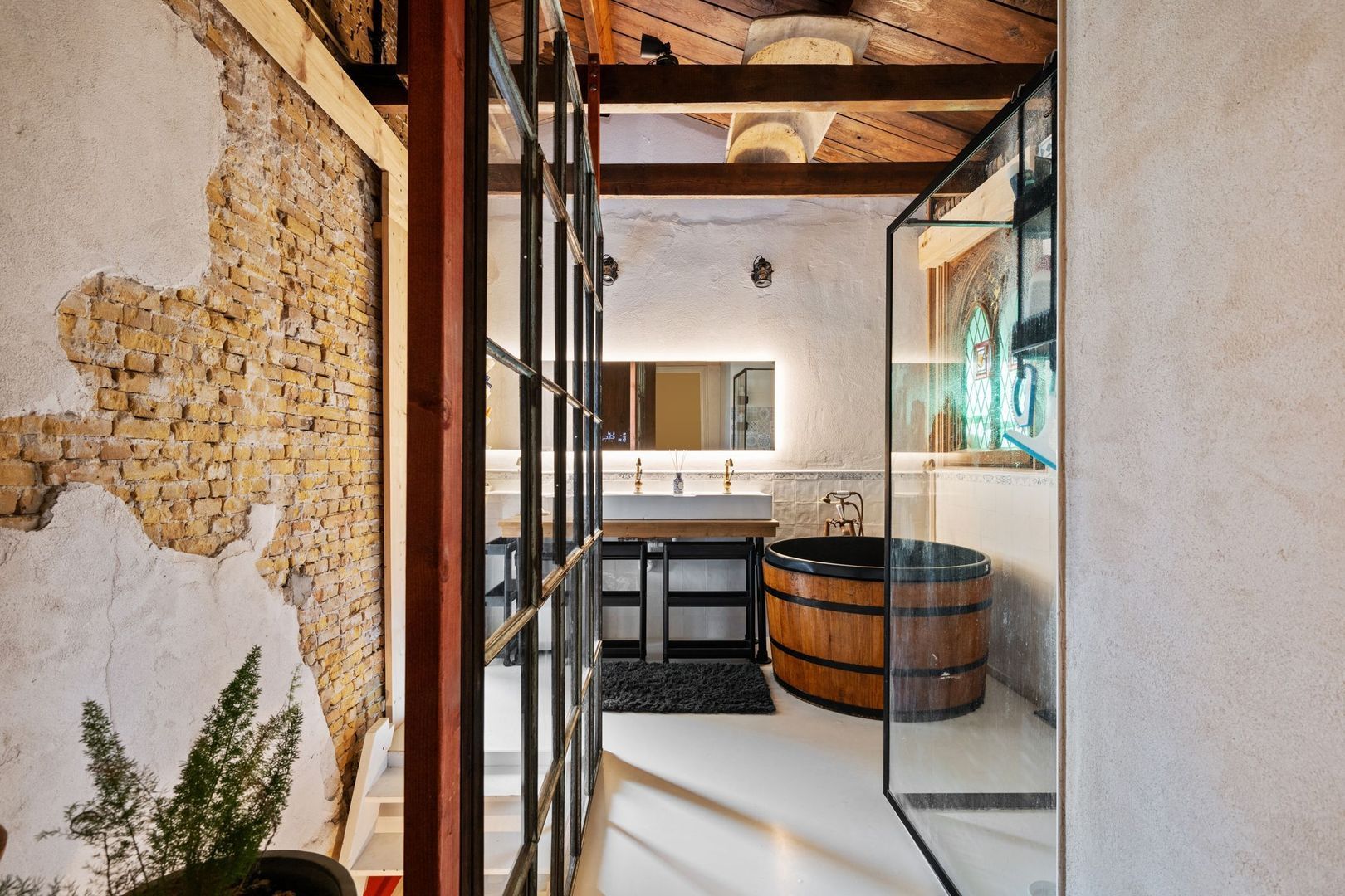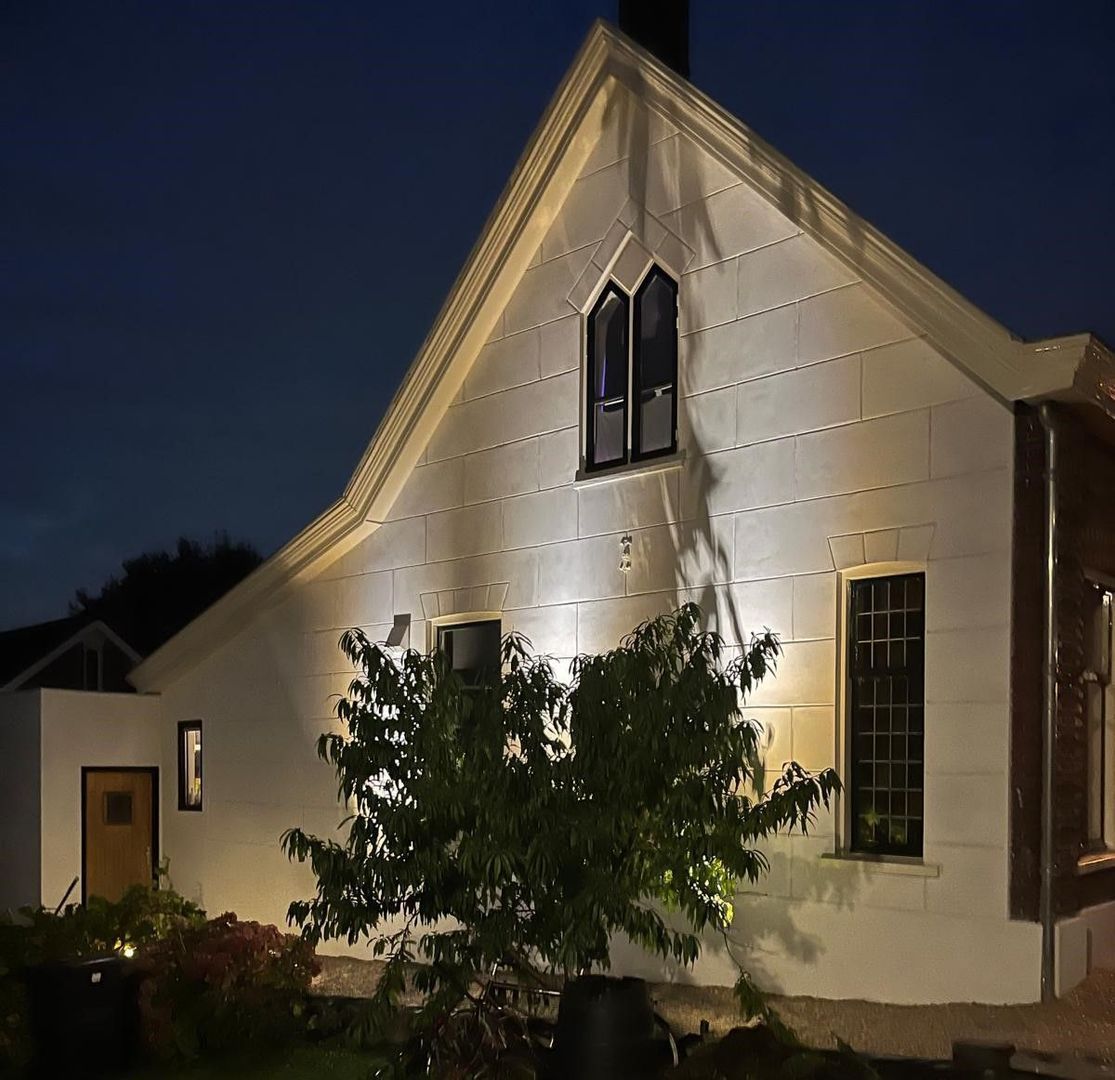 De huidige slaapkamer op de begane grond beschikt over een en-suite badkamer met dubbele wastafel, inloopdouche, ligbad en toegang tot de kelder met wasmachine- en drogeraansluiting. De originele natuurstenen schouw en het glas-in-loodraam geven deze ruimte een bijzonder karakter.