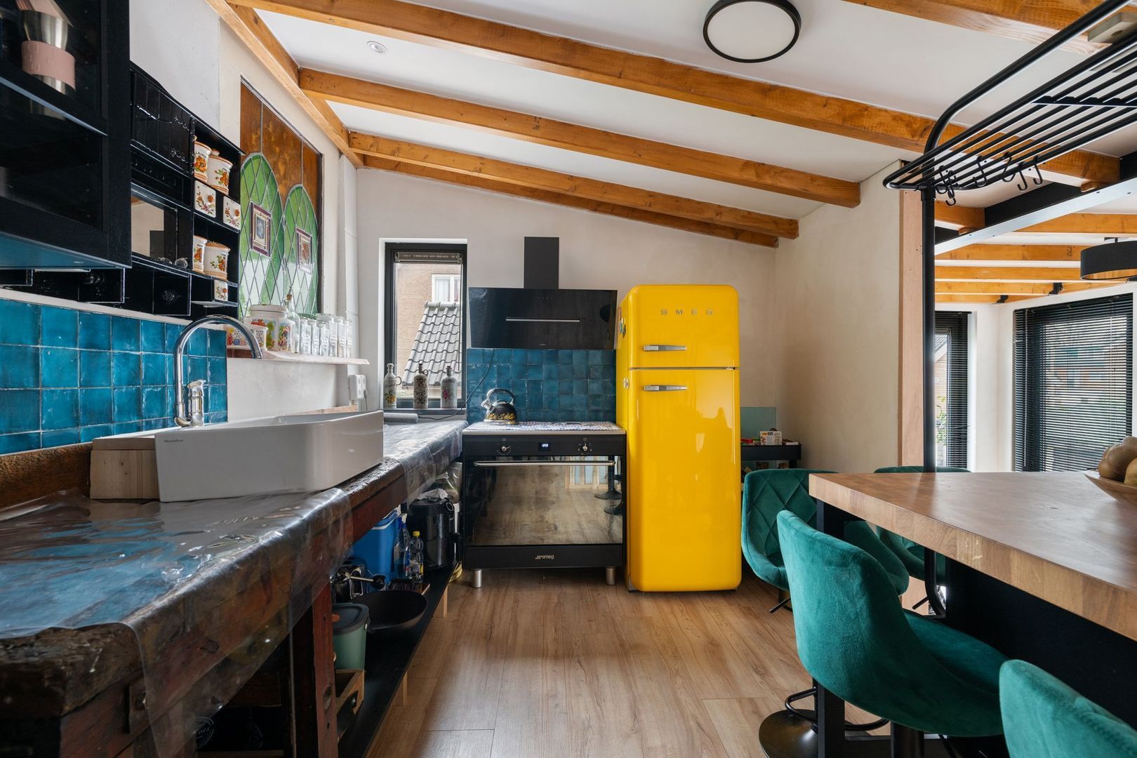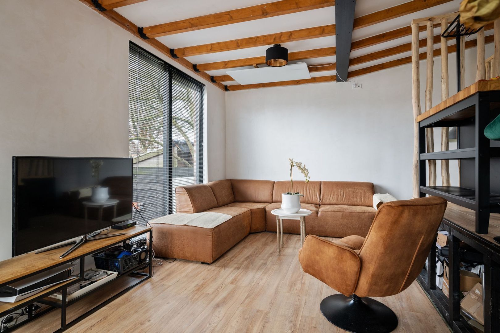 De lichte woonkamer met grote raampartijen heeft een warme, uitnodigende sfeer en is afgewerkt met een moderne laminaatvloer. De open U-vormige keuken is voorzien van een inductiefornuis met oven, vaatwasser, combimagnetron, koel-/vrieskast en afzuigkap. Vanuit de woonkamer loop je door naar een tweede hal en de zonnige achtertuin.