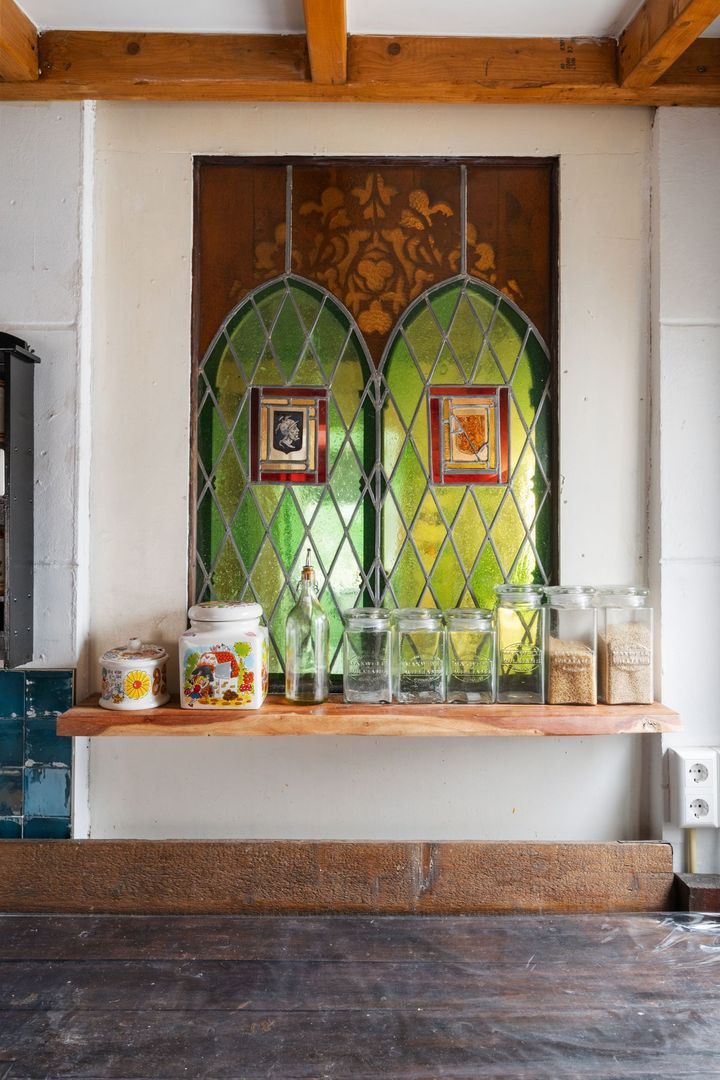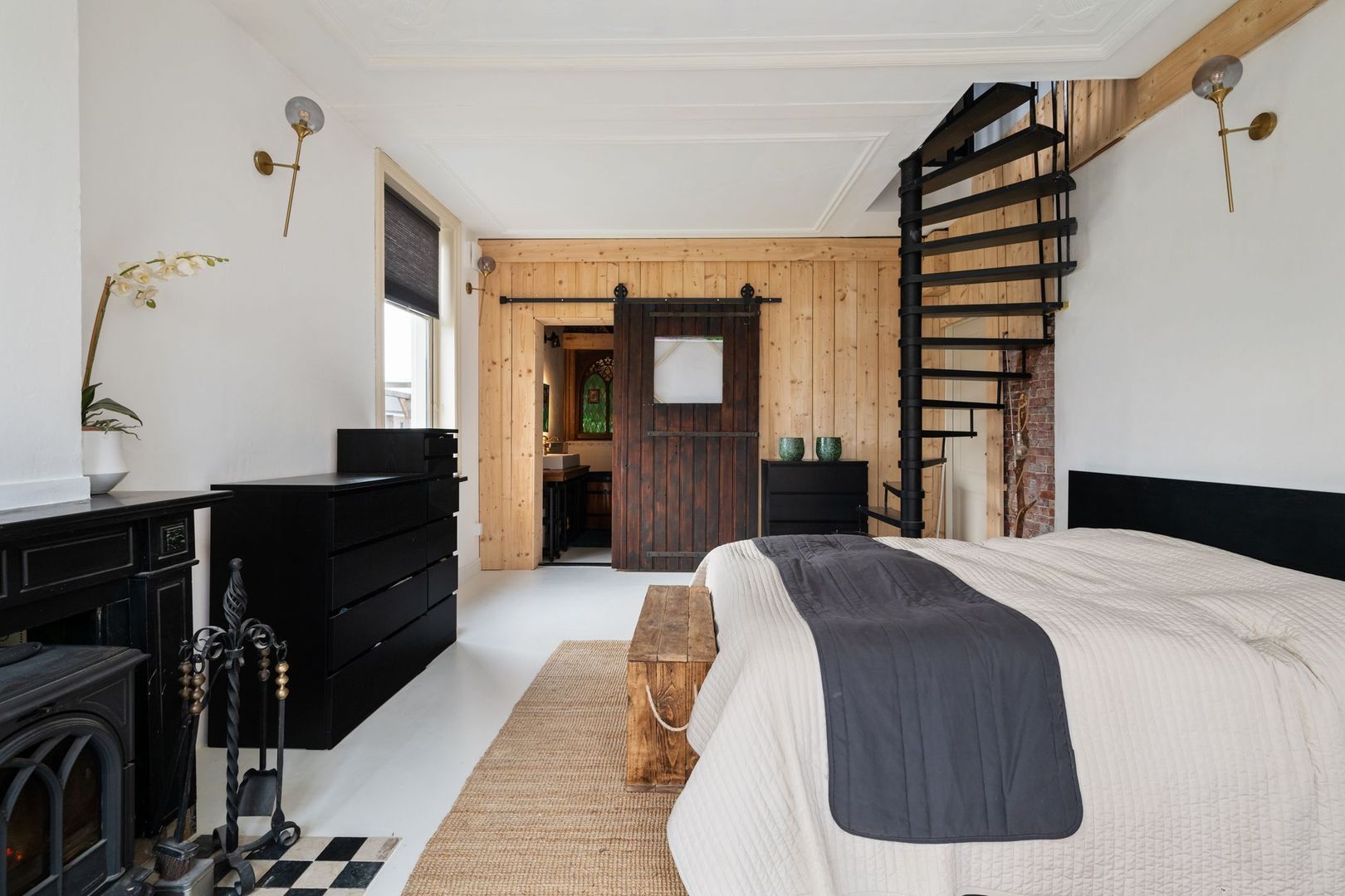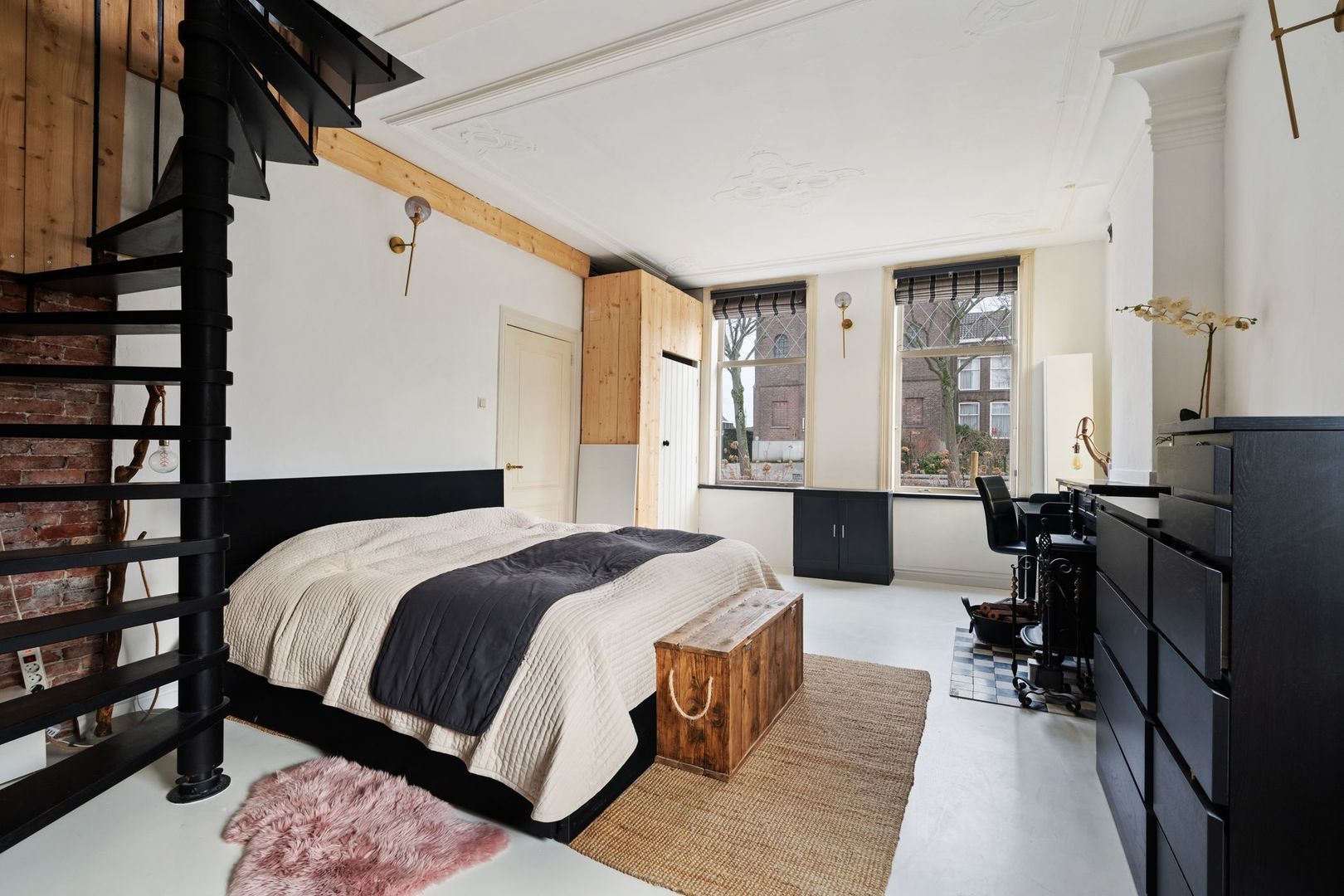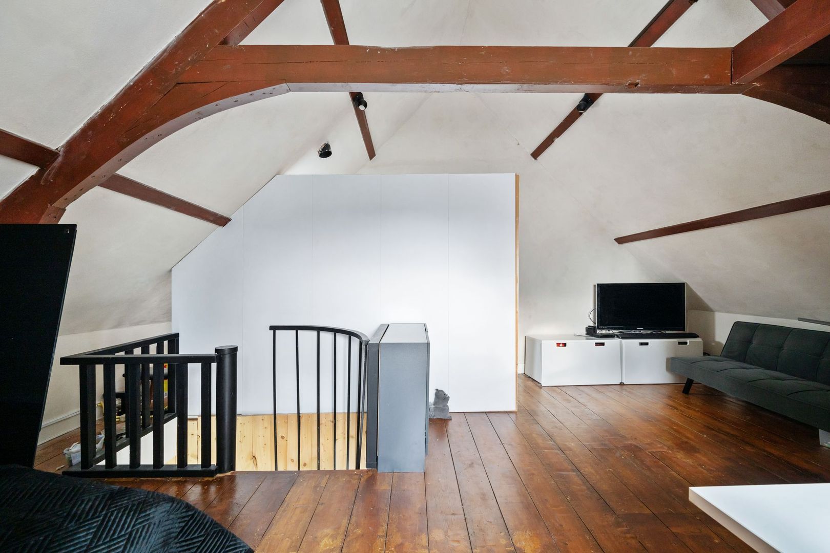 De ruime zolderverdieping is momenteel ingericht als tweede slaapkamer, maar biedt volop mogelijkheden voor een extra slaapkamer of werkruimte. Het karakteristieke dubbele keperboogvenster en de zichtbare dakconstructie zorgen voor veel sfeer. Een wastafel en aansluiting voor een eventuele douchecabine zijn al aanwezig.