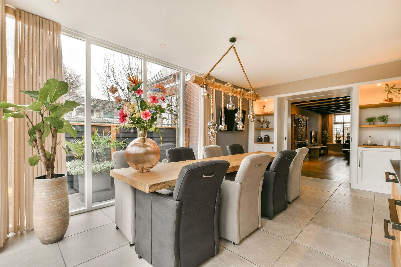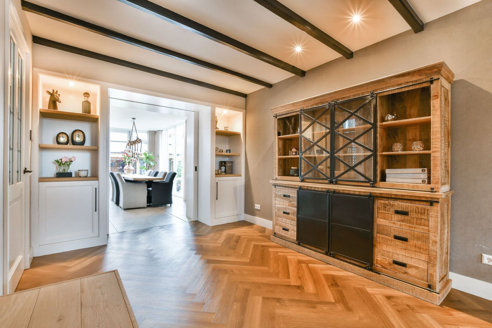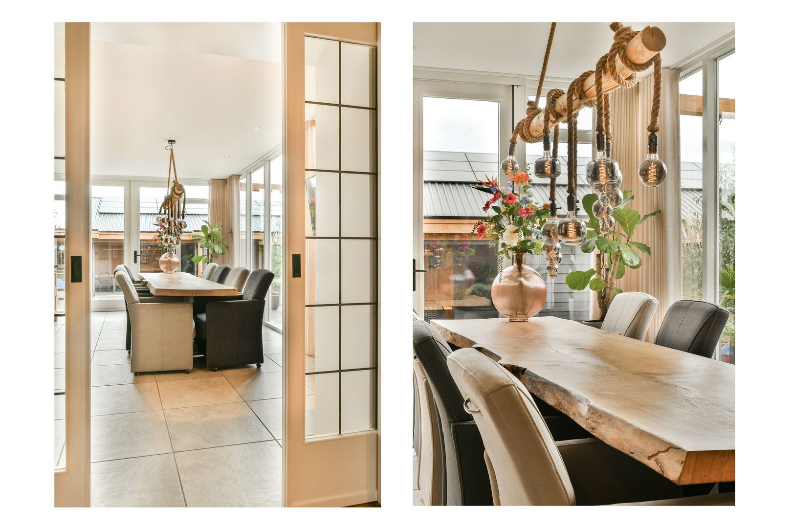De sfeervolle en modern afgewerkte woonkamer is heerlijk licht en voorzien van airconditioning, een praktische trapkast en een prachtige pvc visgraatvloer. Aangrenzend ligt de eetkamer, ideaal voor gezellige lange avonden. De ensuite deuren vormen een stijlvolle verbinding met de keuken.