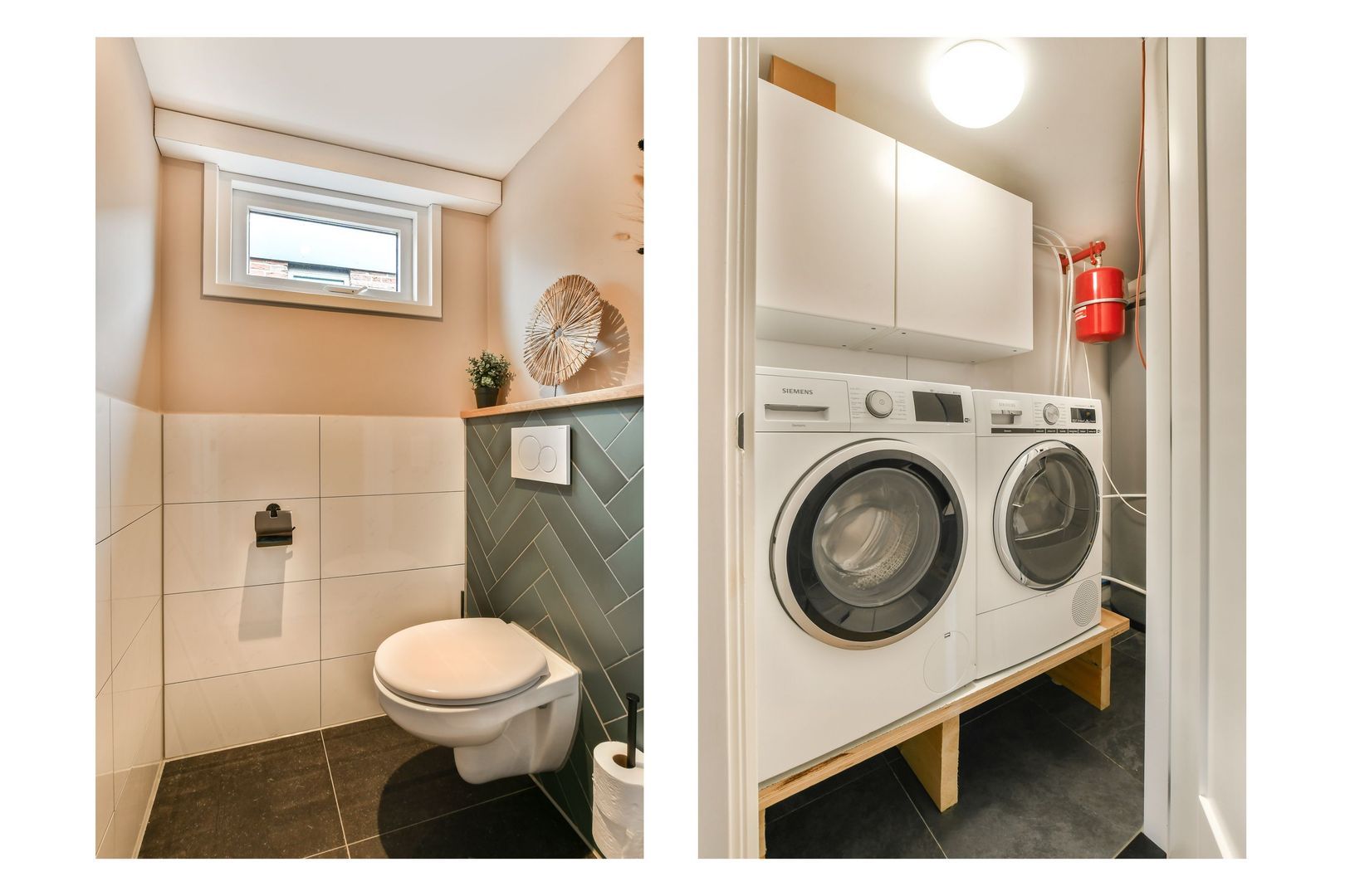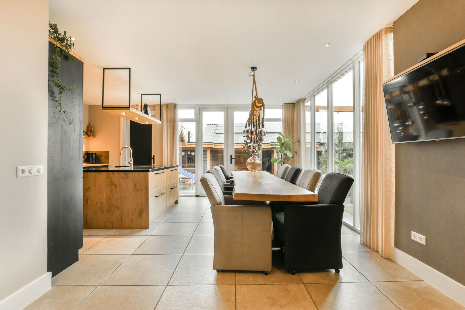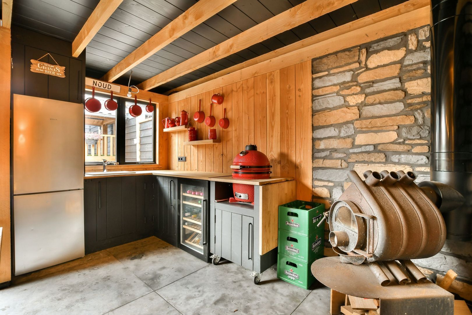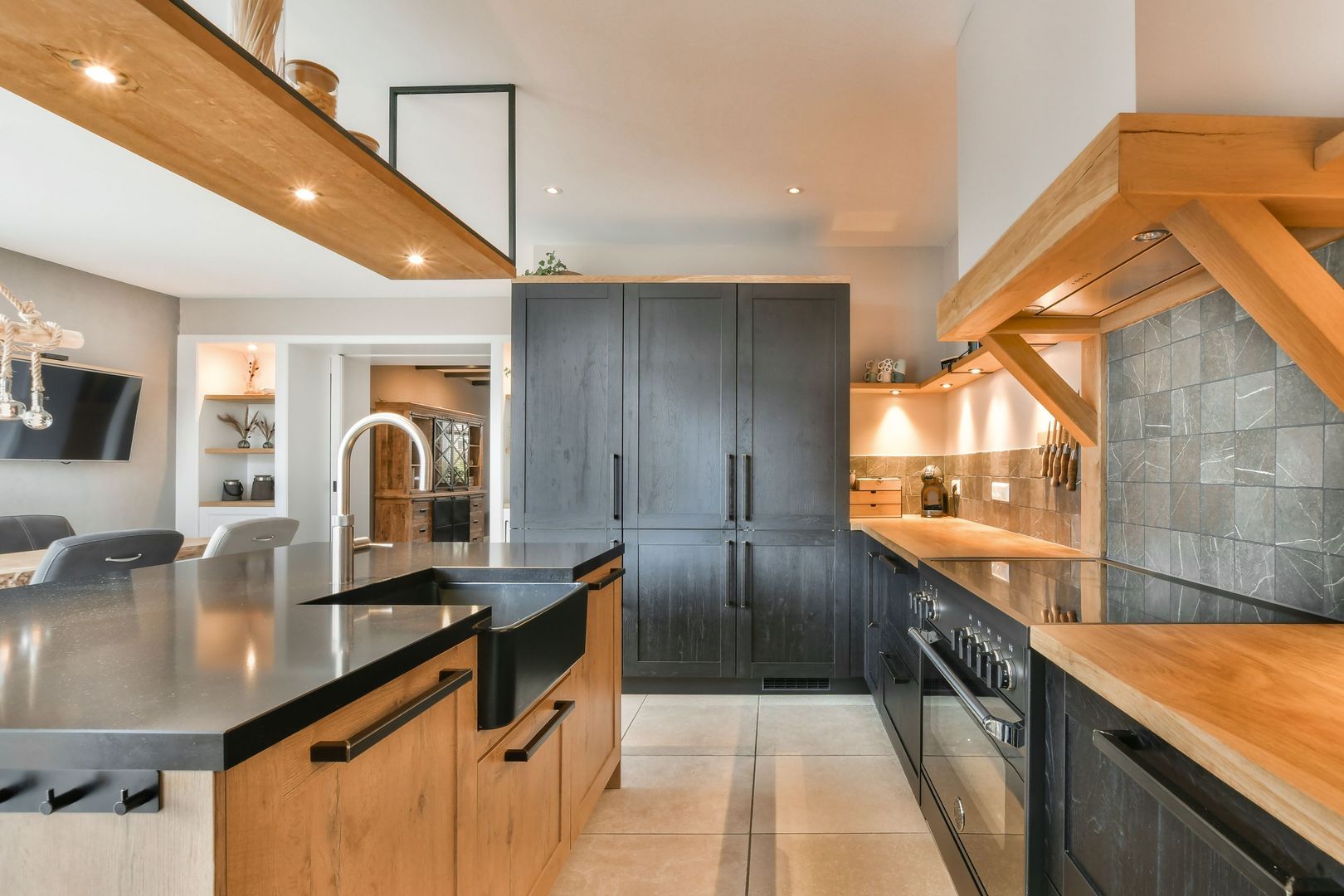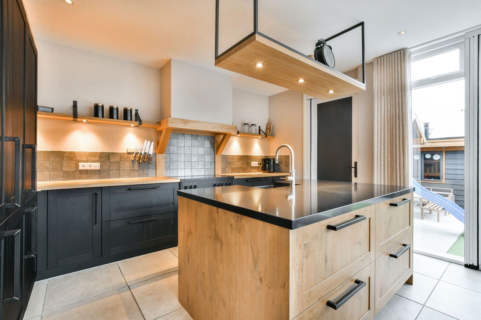 De moderne en lichte keuken bevindt zich aan de achterzijde van de woning en beschikt over een ruim werkblad, oven, inductiekookplaat, afzuigkap, vaatwasser en een ruime koel-vriescombinatie. De keuken is voorzien van een mooie plavuizenvloer.