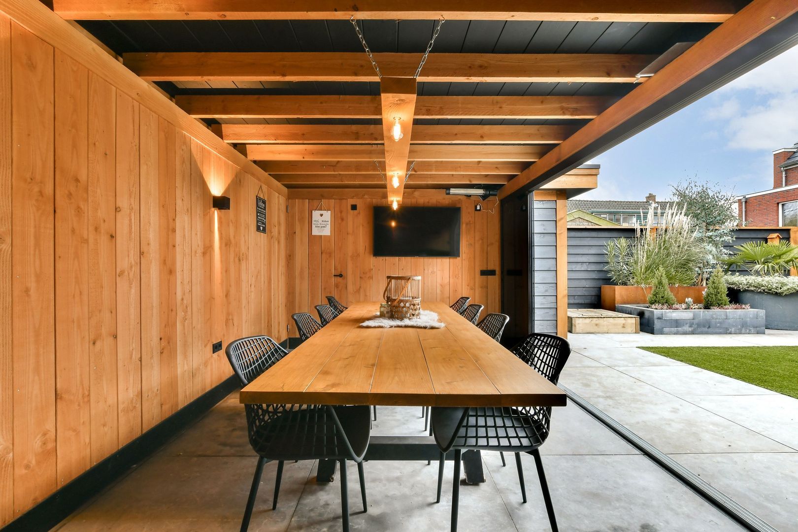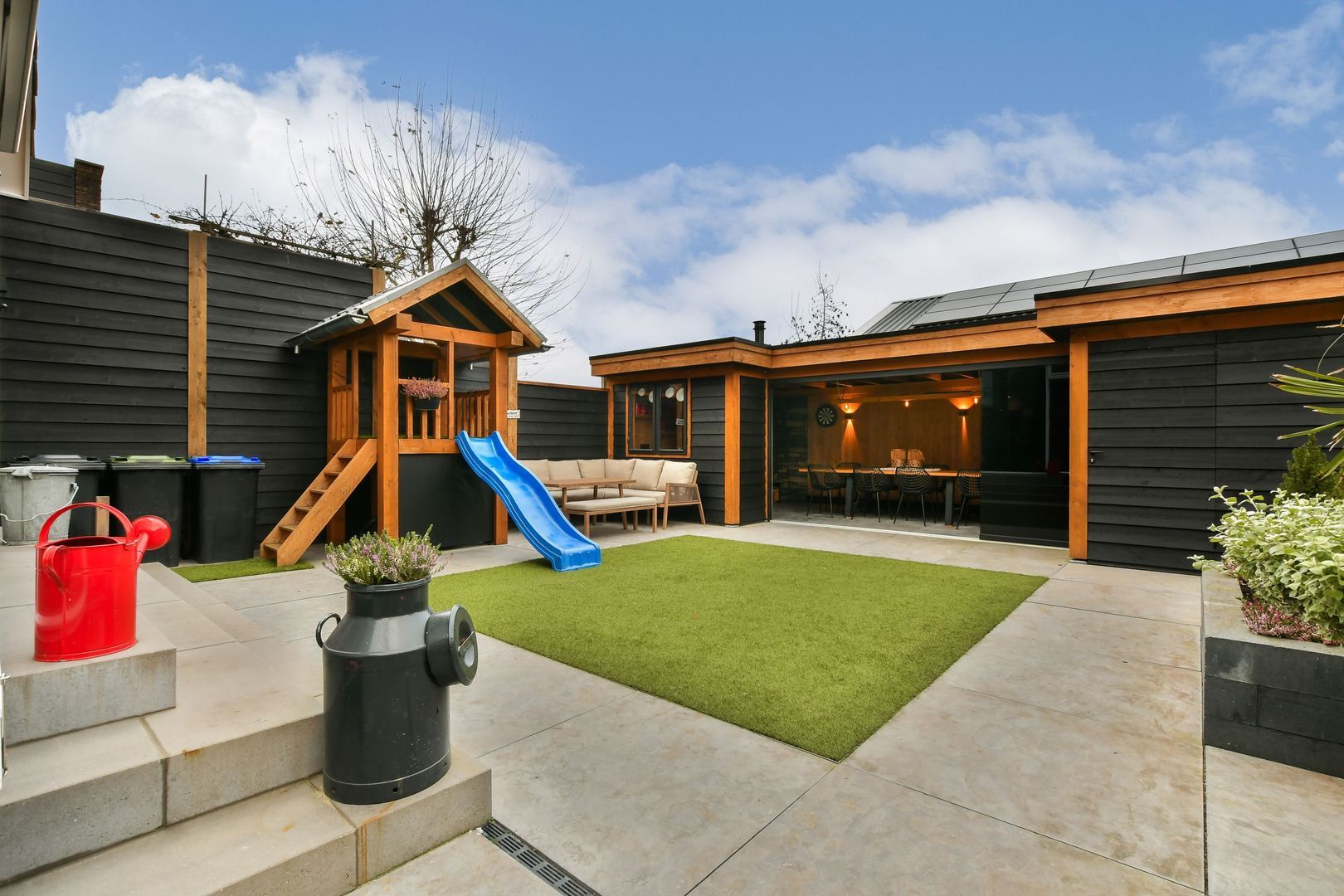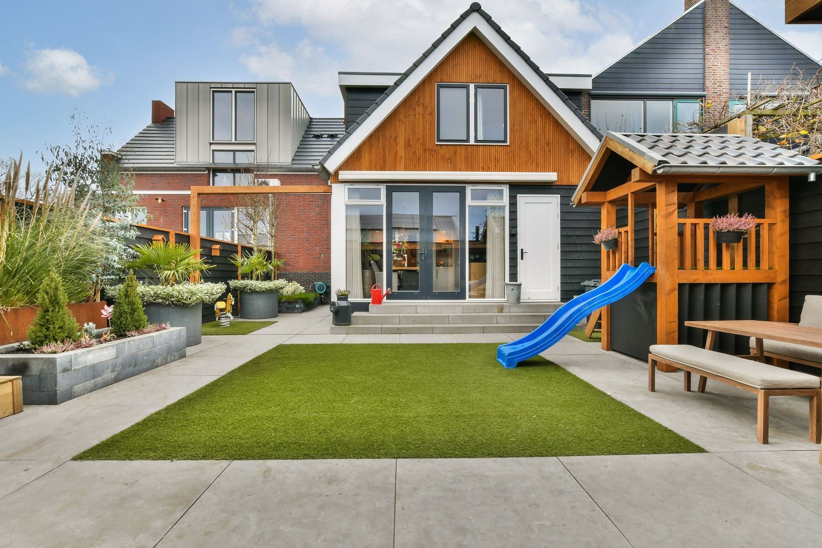 De achtertuin is verzorgd aangelegd en biedt zowel zonnige als schaduwrijke plekken. Een heerlijke buitenruimte met voldoende plaats voor kinderen om te spelen. Achterin de tuin bevindt zich een charmant tuinhuis, de perfecte plek voor gezellige avonden met vrienden.